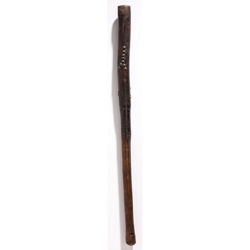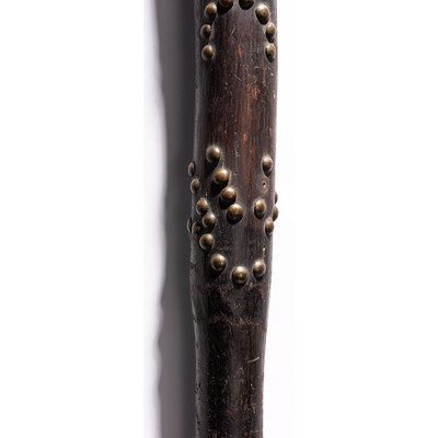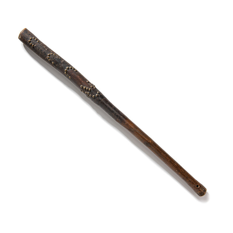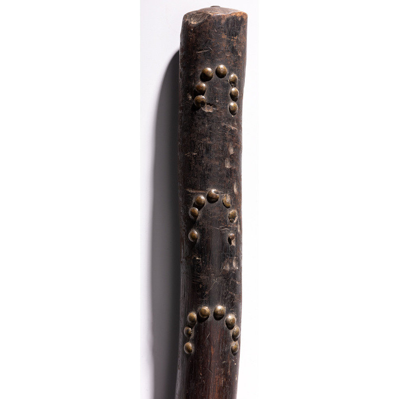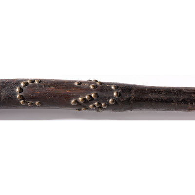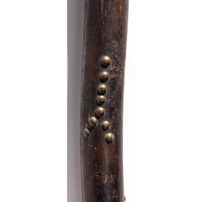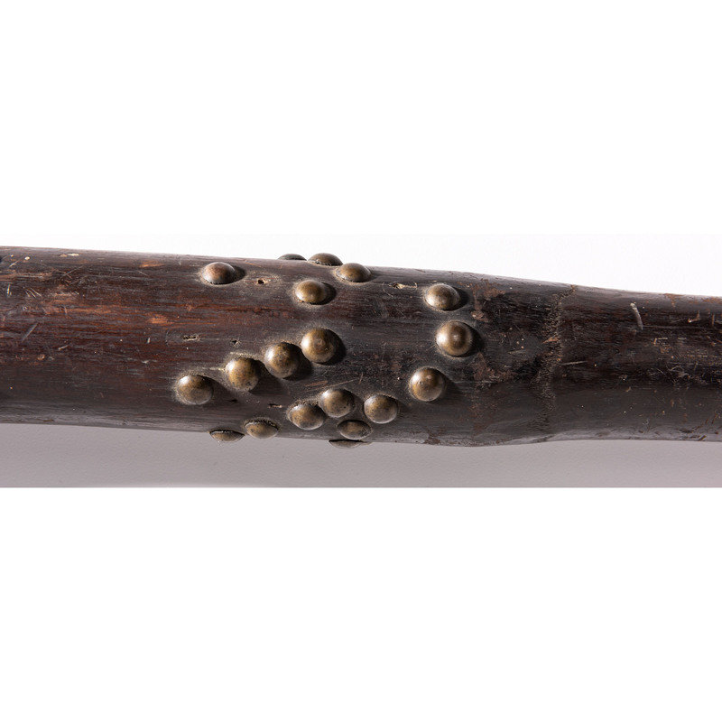 having warm patina; upper portion of club decorated with horse tracks and hand imagery by using 51 brass tacks; haft pierced for attachment