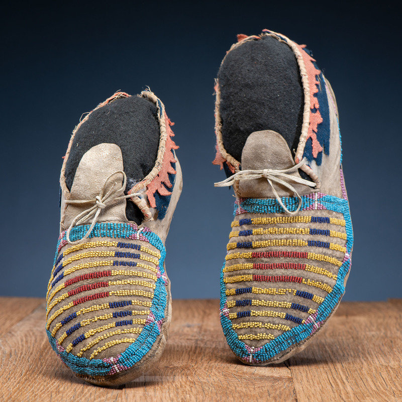 thread and sinew-sewn; vamps with narrow lanes of glass beads in colors of light blue, pink, greasy yellow, red white-heart, and cobalt; cuffs edged in red and navy wool