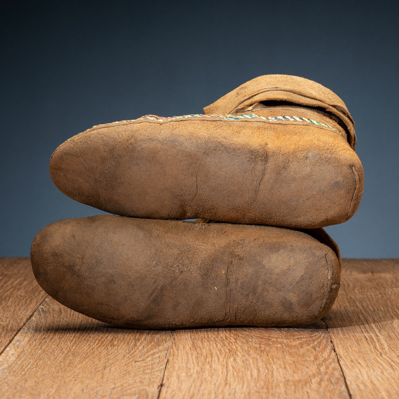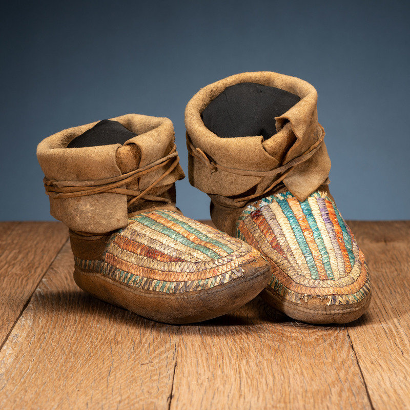 sinew-sewn and quilled on thick hide, having vertical stripes on vamps