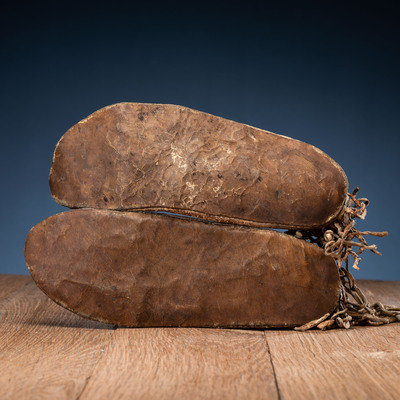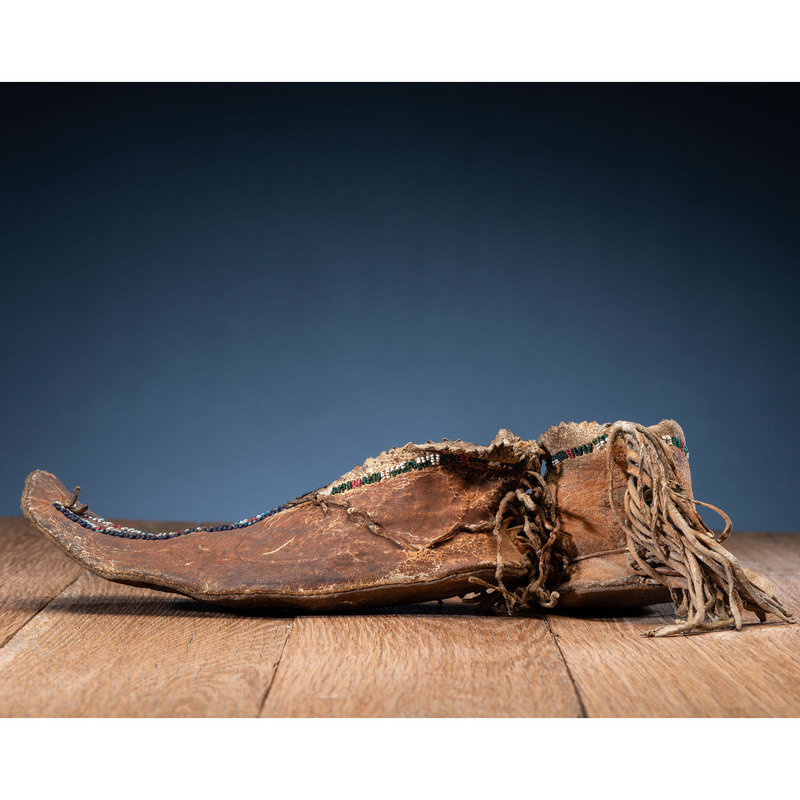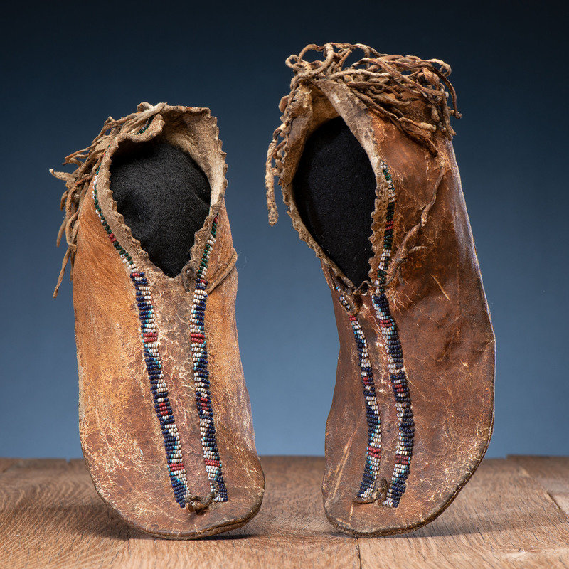 sinew-sewn on softly-tanned hide; vamps with two beaded lanes in colors of cobalt, red white-heart, light blue, white, and translucent green; pinked cuffs; heel fringe; hide coated with red pigment