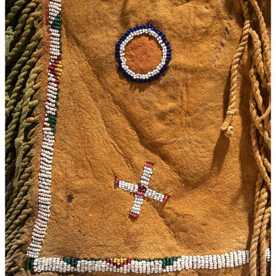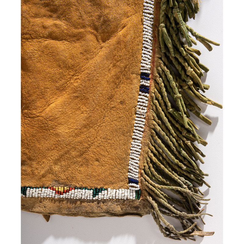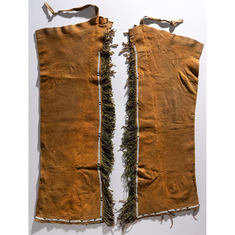 sinew-sewn and beaded in colors of white, red white-heart, greasy yellow, and cobalt; hide coated in orange and green pigments; outer seam of leggings embellished with twisted fringe