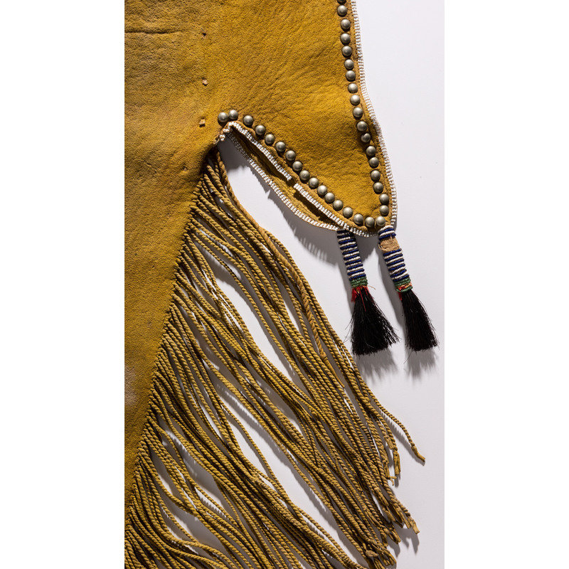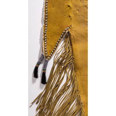 sinew-sewn and decorated with small glass beads in colors of white, red white-heart, and cobalt; tightly twisted fringe and brass buttons; hide coated with yellow pigment