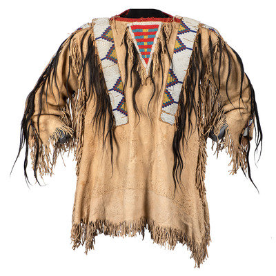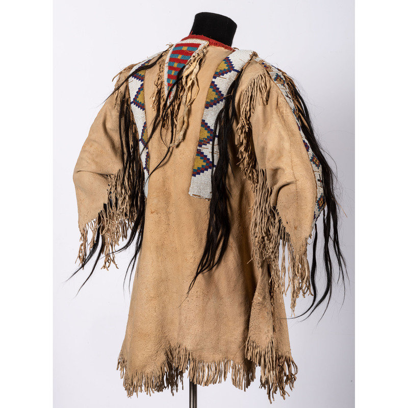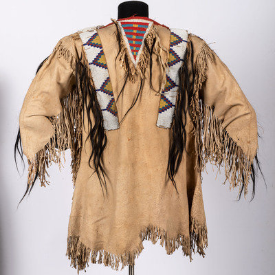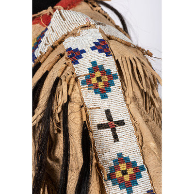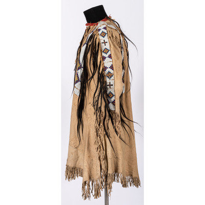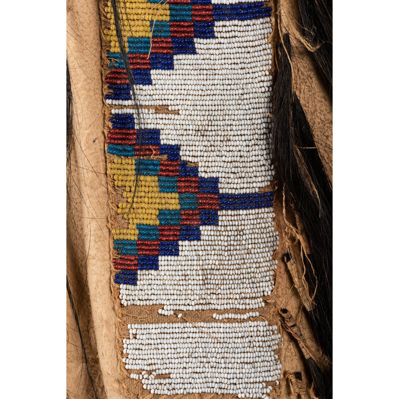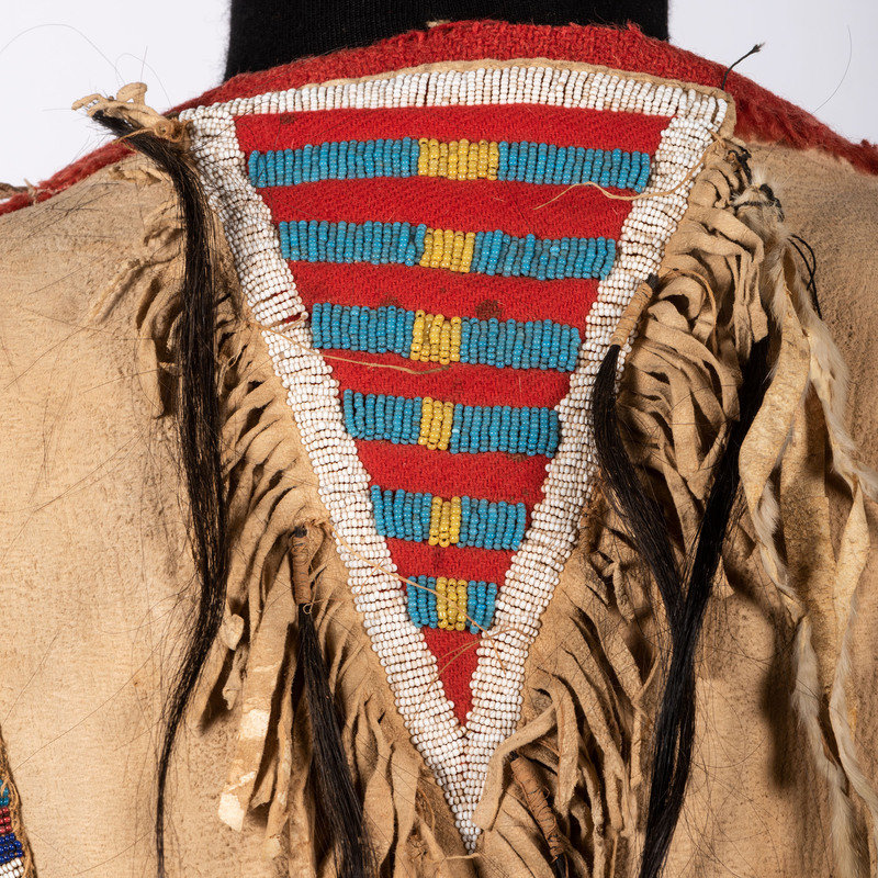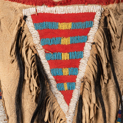 thread-sewn, with beaded canvas strips on sleeves and shoulders are in colors of dark blue, greasy yellow, red white-heart, pony trader blue, and white; hairlock embellishments; triangular bib with red wool; red wool around collar; interior with remnants of red pigment