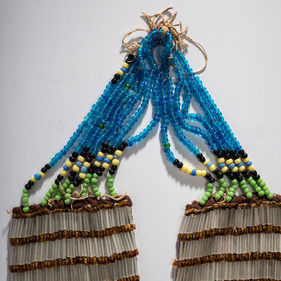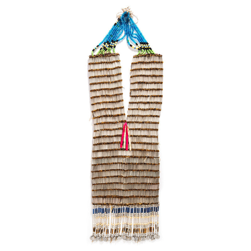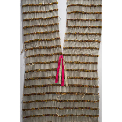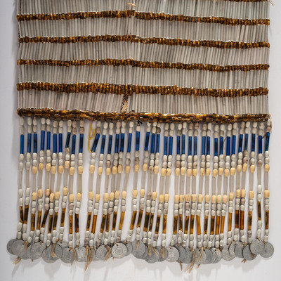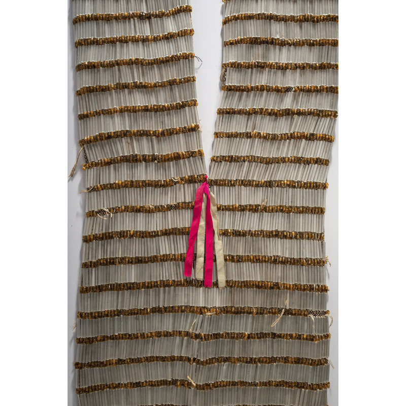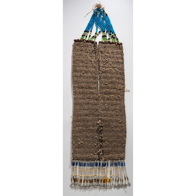 backed with tweed and beaded with snap beads, alternating between gold and opaque; beaded fringe terminating with tin tokens