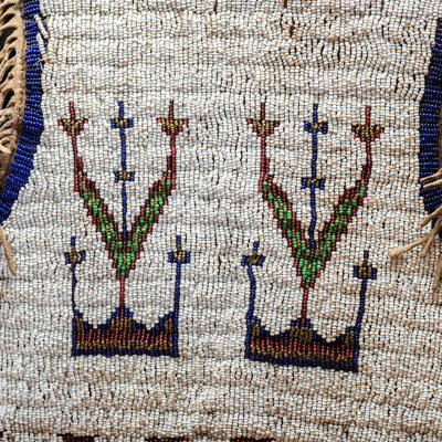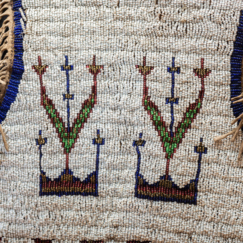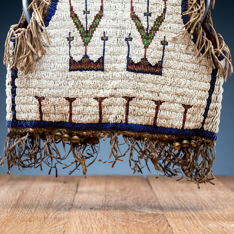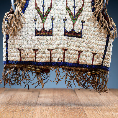 thread and sinew-sewn; beaded in colors of white, rose, dark blue, cut brass, and pea green; interior lined with patterned cotton; hide thong ties with brass bells