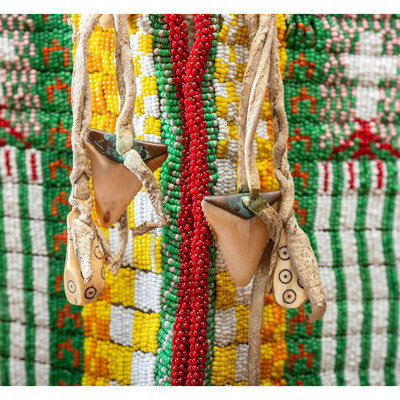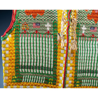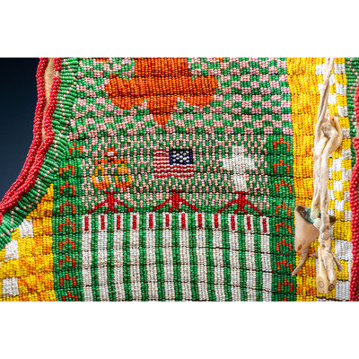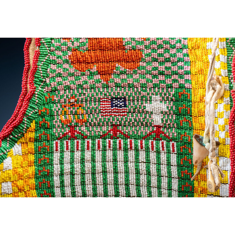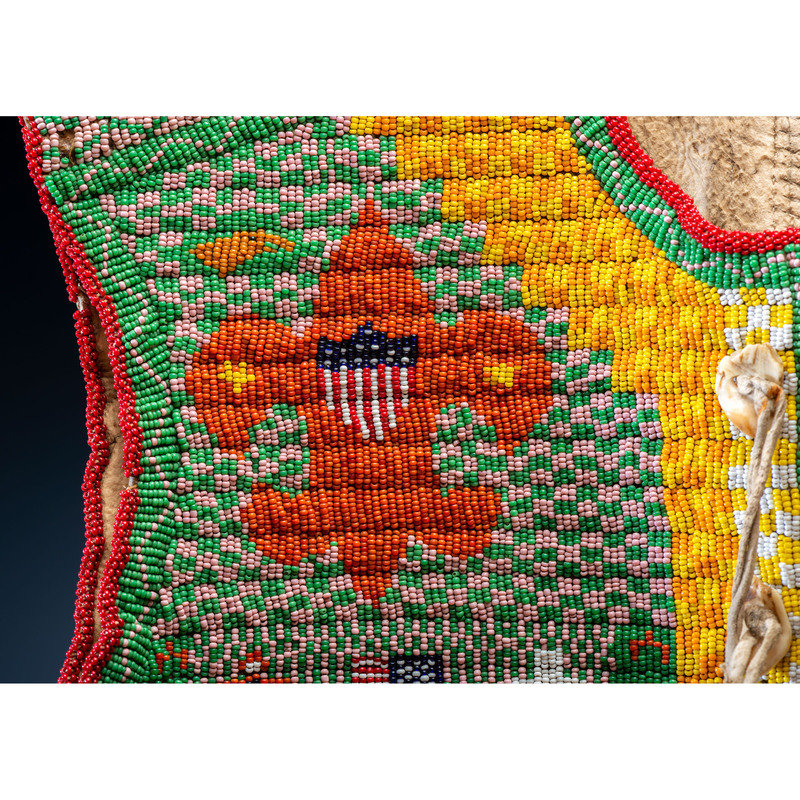 thread and sinew-sewn; beaded using a variety of colorful glass beads; chest embellished with the Boy Scout's crest of fleur-de-lis, a U.S. shield, and eagle; below illustrates the Scout's oath with a cross (God), American flag (Country), and scout hat (Scout's Oath); hide thong ties terminate with elk teeth, walrus ivory buttons with circle and dot design, and serrated shark's teeth topped with copper cap