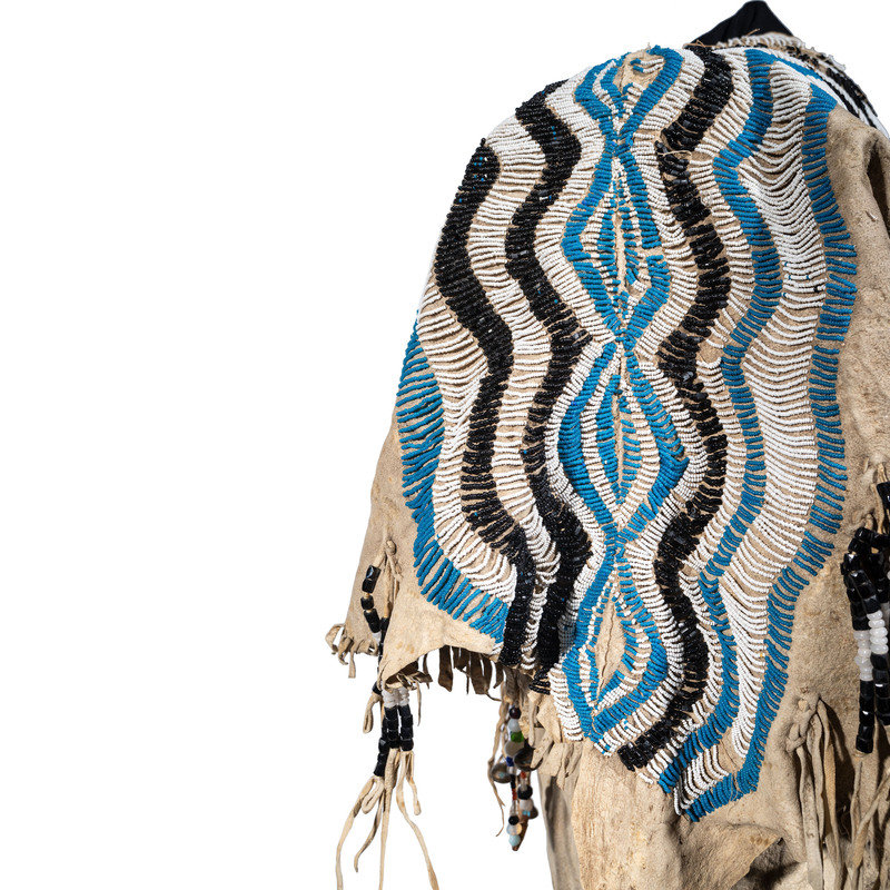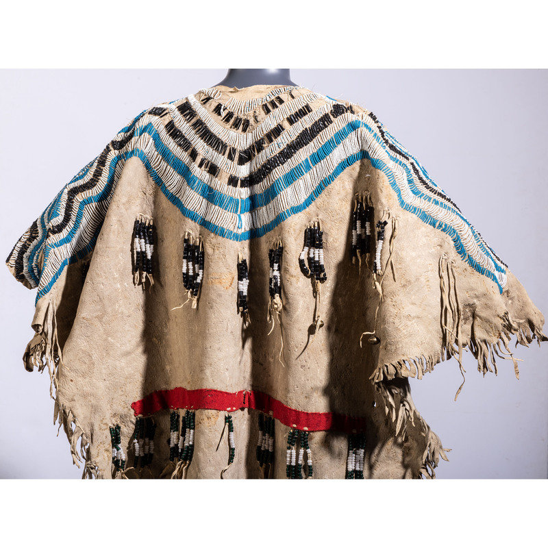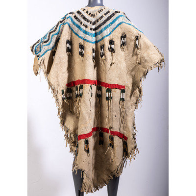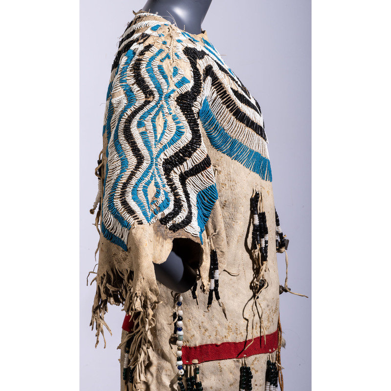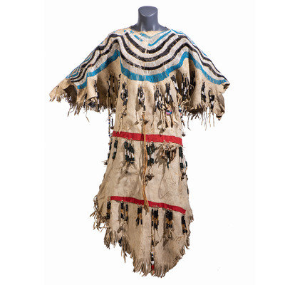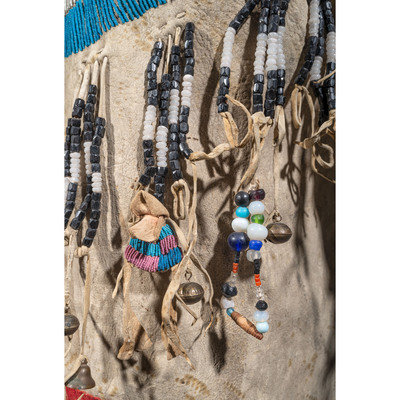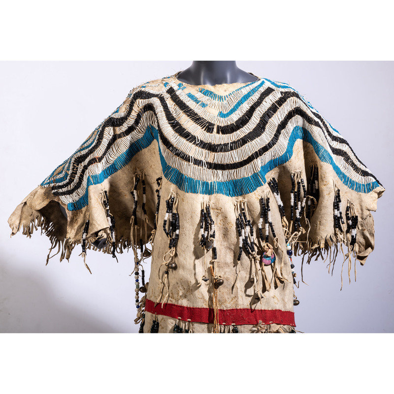 thread-sewn; yoke beaded using colors of white, black, and pony trader blue; skirt is decorated with two strips of red wool and larger faceted black, white, and amber beads; additional charms, such as a thimble, brass bells, beaded pouch, and bundle of fur, are placed throughout