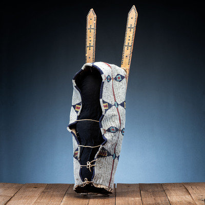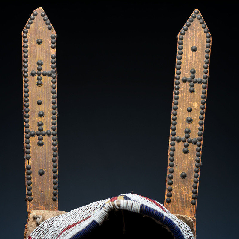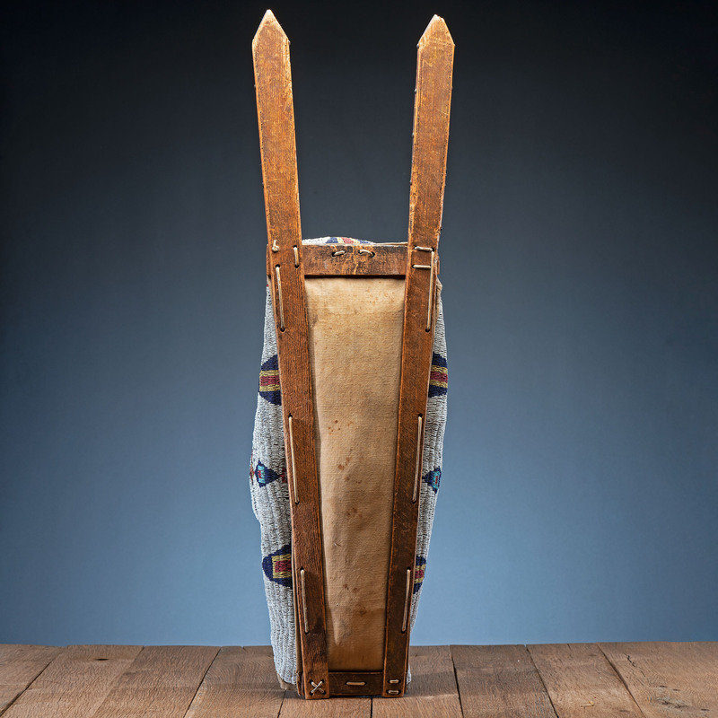 sinew-sewn and beaded is colors of red white-heart, greasy yellow, cobalt, light blue, and white; cradle backed using a canvas flour sack with print Gallatin Valley Mills, Bozeman, Montana; boards with tacked decoration and remnants of pigment, overall length 38.5 in. x width 10.25 in.