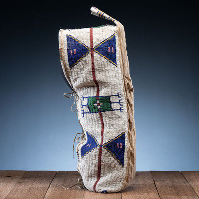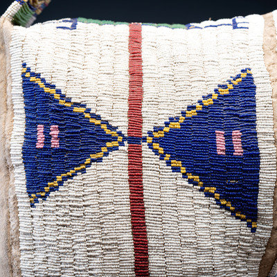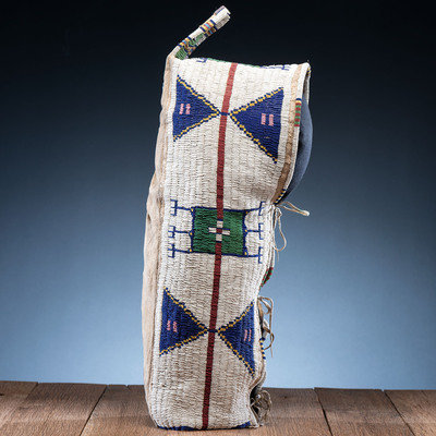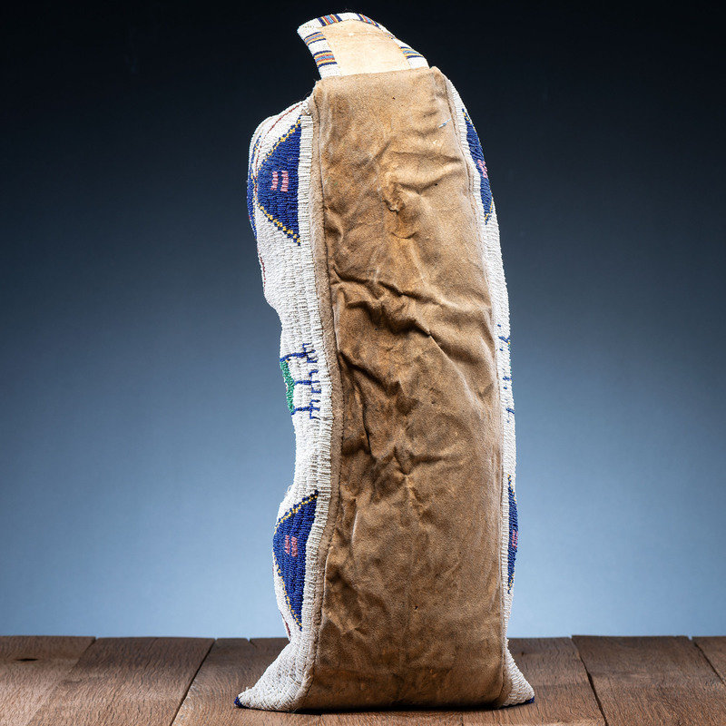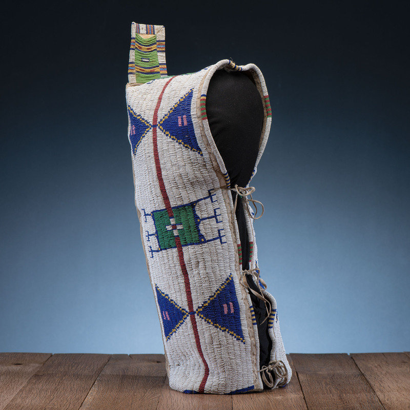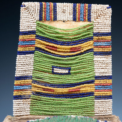 sinew-sewn and beaded with geometrics in colors of dark blue, pea green, pink, and white; a lane of red white-heart beads extends vertically around the cradle