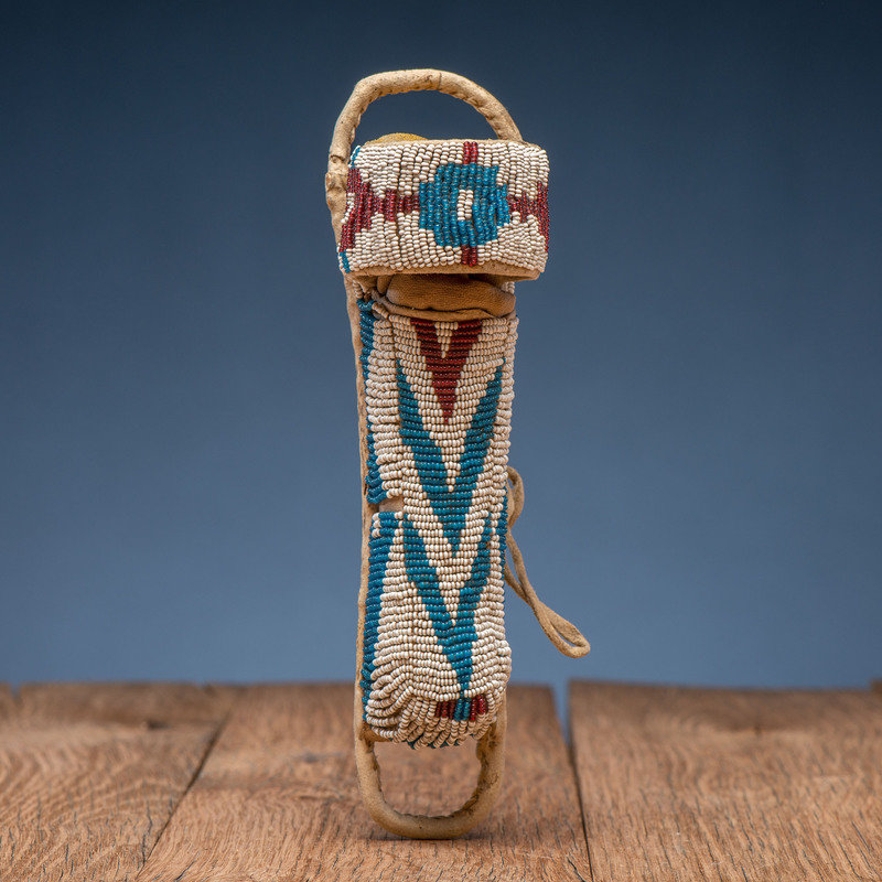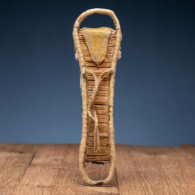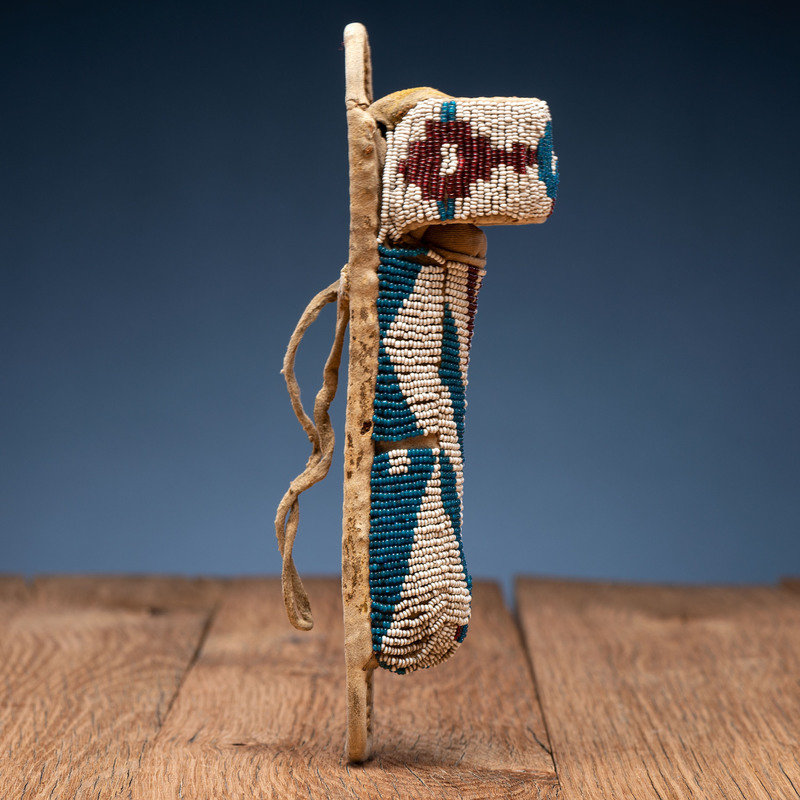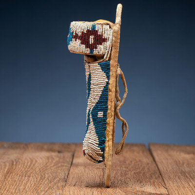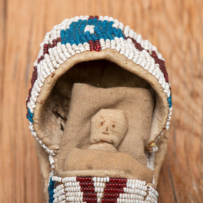 thread-sewn and beaded on softly tanned hide using colors of blue, red, and white mounted on wood cradle, and having traces of yellow pigment; doll made of cloth