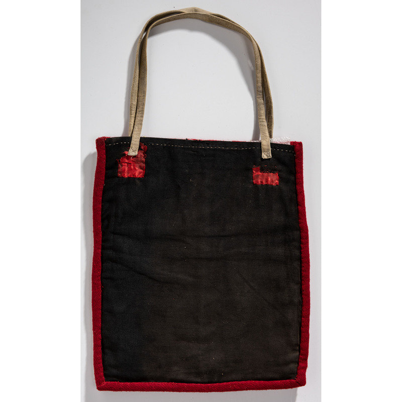 thread-sewn and beaded using colors of rose, cobalt, white, pea green, and light blue; interior lined with patterned polished cotton; remnants of red silk