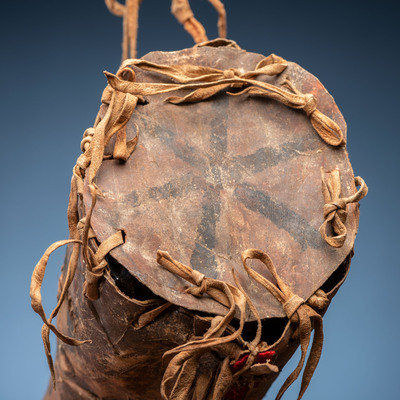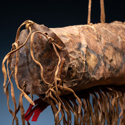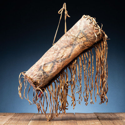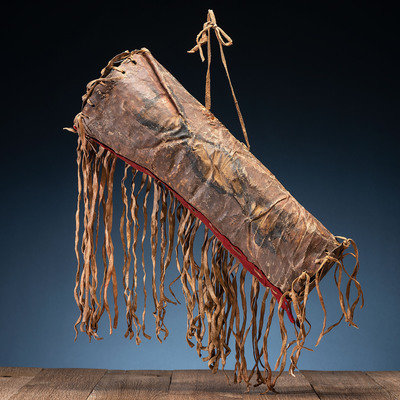 coated with red pigment and painted with stylized Thunderbird imagery; red wool and fringe along closing seam