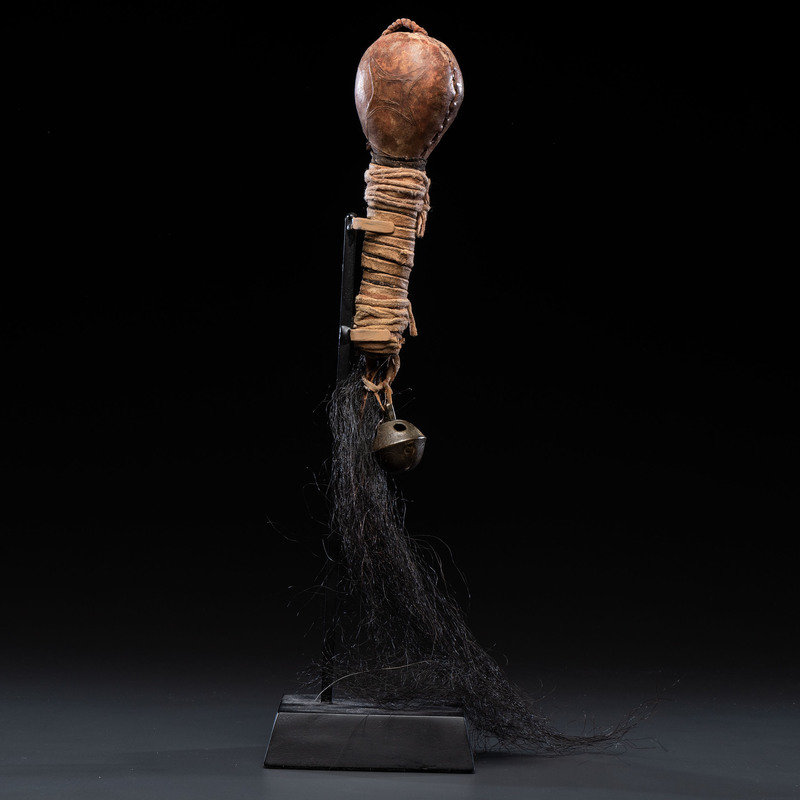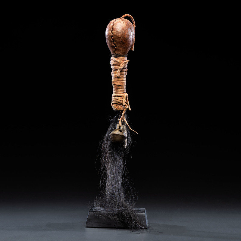 incised with imagery of Iktomi on one side of rattle and a Thunderbird on opposite; rattle coated with red pigment; horsehair and brass hawk bell, overall length 17 in.