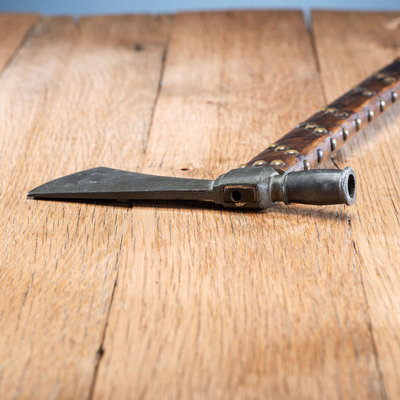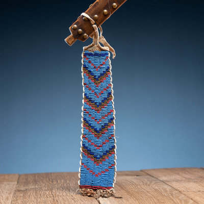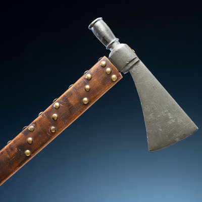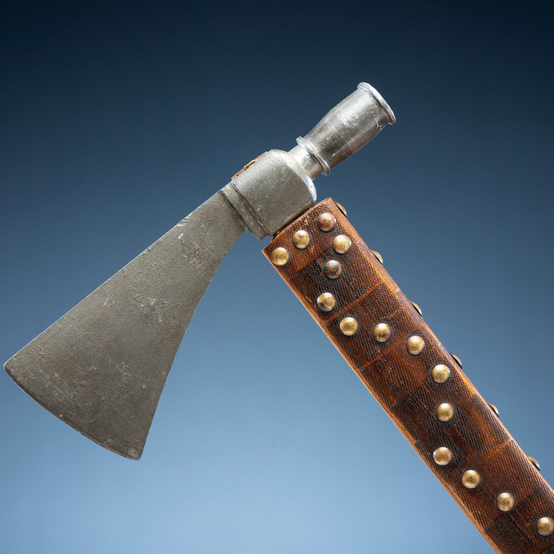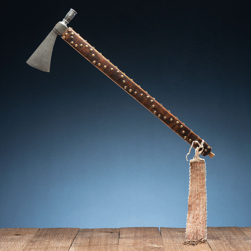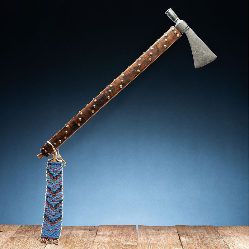 thin file-branded wood haft studded with approximately 90 brass tacks; cast blade, length 8 in. x width of blade 2.75 in.; sinew-sewn hide drop beaded with colors of medium and dark blue, cut brass, white, and red white-heart; fringe with red pigment, length 12 in.