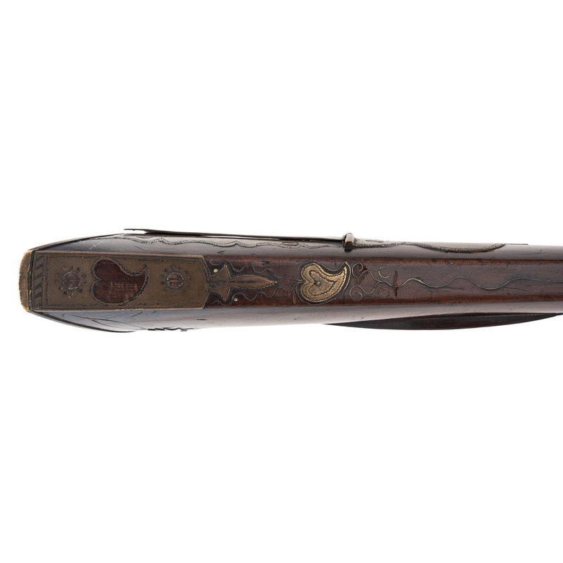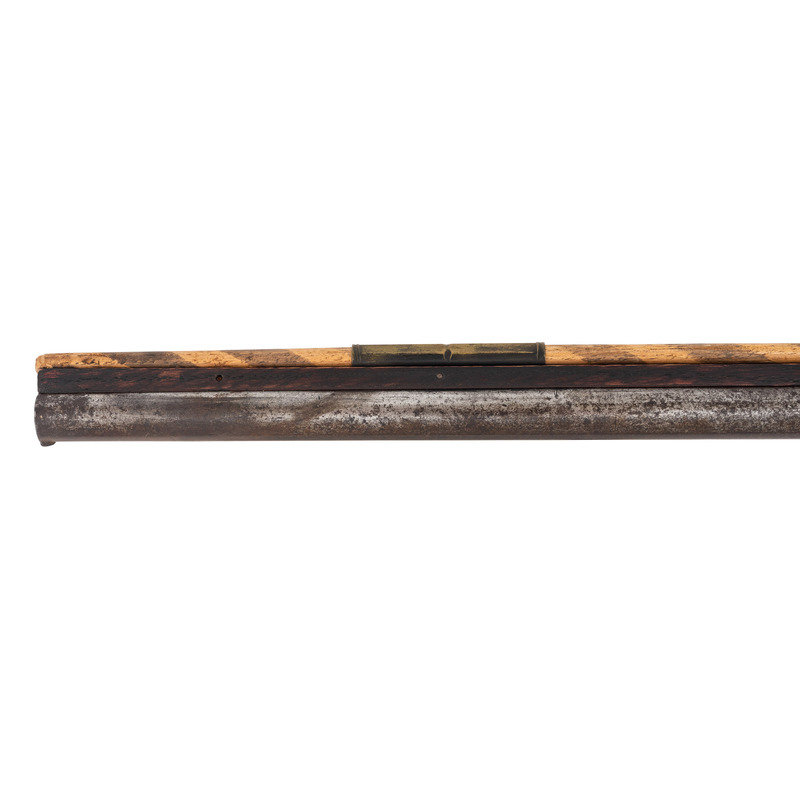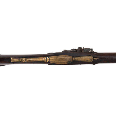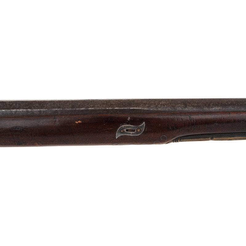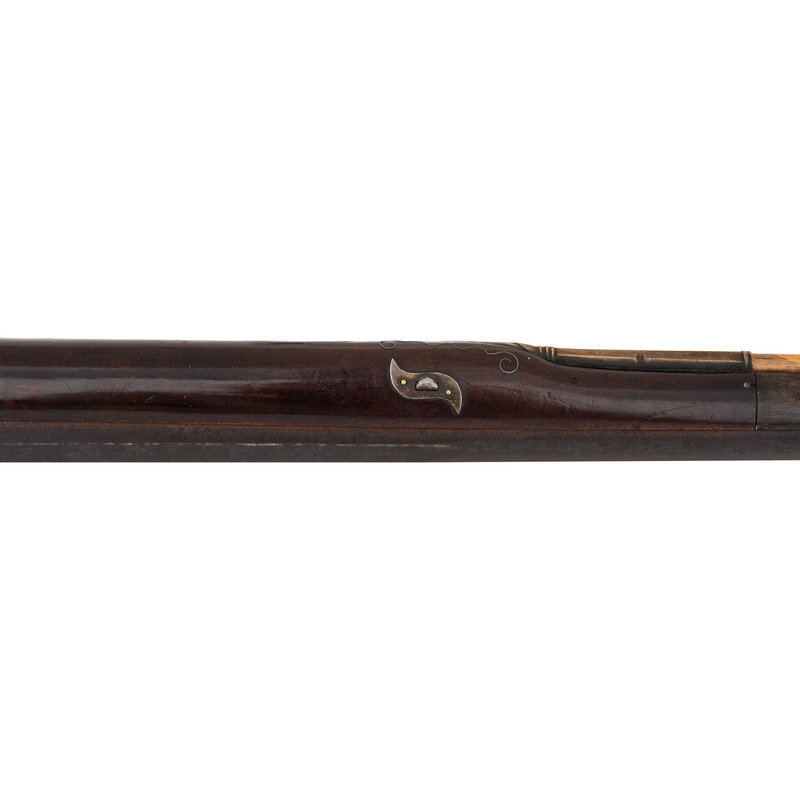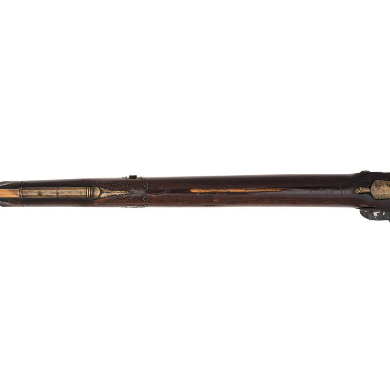 .58 caliber. 40.25" octagon to round wedge-retained barrel. SN: NSN. Bright finish, brass furniture, European hardwood half stock. Reconverted stepped flat flint lock with teat at rear is unmarked. Barrel with "E/LG/*" in an oval Liege proof mark, with hooked breech and simple decorative engraving on the top flat. The gun is mounted with an extremely attractive four-piece brass "horse head" patchbox that is decorated with simple geometric engraved patterns around the periphery. The patchbox release is located in the buttplate tang. There is a lightly engraved cut-out brass toe plate with the decorative cut out inlaid in the toe of the stock. The raised cheek rest is decorated with an engraved brass arched foliate spray, as is the reverse butt. Delicate silver wire is inlaid in flowing patterns around the reverse butt, wrist and around the tang. A German silver thumb piece is inlaid on the top of the wrist with engraved decorations. The two brass lock screw escutcheons are engraved in patterns that match the brass stock adornments. The overall fit, balance and feel of the is of an extremely high quality English fusil from the last quarter of the 18th century but was produced in Belgium, likely during the 1820s-1840s. The gun was almost certainly full-stocked originally and was altered to half stock during the period of use. The wooden rib under the barrel and accompanying ramrod pipes appear to be more recent additions and the striped wood rammer appears contemporary as well. A really lovely high grade trade fusil with an extremely attractive horse head patchbox.