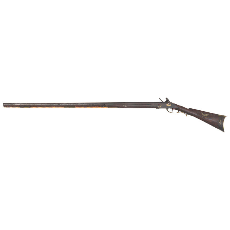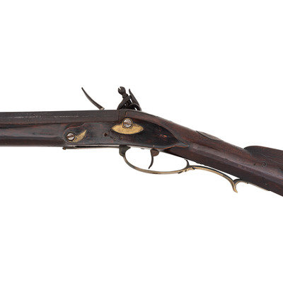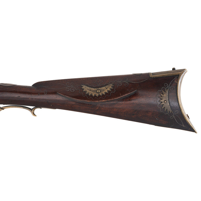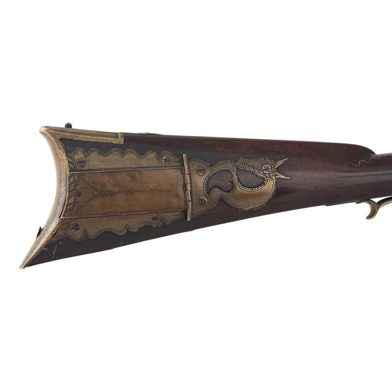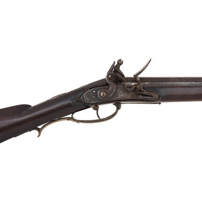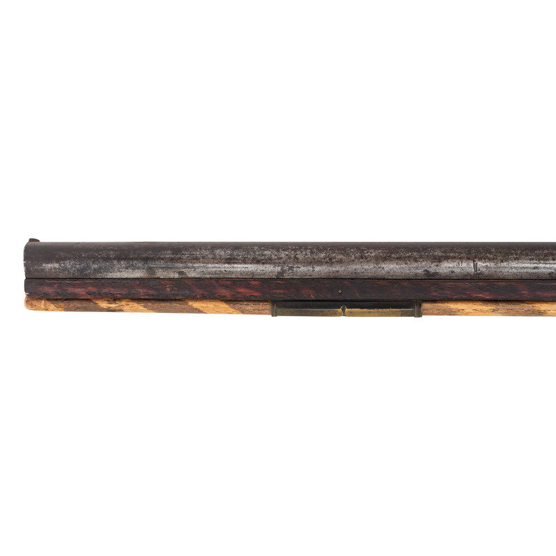 .58 caliber. 40.25" octagon to round wedge-retained barrel. SN: NSN. Bright finish, brass furniture, European hardwood half stock. Reconverted stepped flat flint lock with teat at rear is unmarked. Barrel with "E/LG/*" in an oval Liege proof mark, with hooked breech and simple decorative engraving on the top flat. The gun is mounted with an extremely attractive four-piece brass "horse head" patchbox that is decorated with simple geometric engraved patterns around the periphery. The patchbox release is located in the buttplate tang. There is a lightly engraved cut-out brass toe plate with the decorative cut out inlaid in the toe of the stock. The raised cheek rest is decorated with an engraved brass arched foliate spray, as is the reverse butt. Delicate silver wire is inlaid in flowing patterns around the reverse butt, wrist and around the tang. A German silver thumb piece is inlaid on the top of the wrist with engraved decorations. The two brass lock screw escutcheons are engraved in patterns that match the brass stock adornments. The overall fit, balance and feel of the is of an extremely high quality English fusil from the last quarter of the 18th century but was produced in Belgium, likely during the 1820s-1840s. The gun was almost certainly full-stocked originally and was altered to half stock during the period of use. The wooden rib under the barrel and accompanying ramrod pipes appear to be more recent additions and the striped wood rammer appears contemporary as well. A really lovely high grade trade fusil with an extremely attractive horse head patchbox.