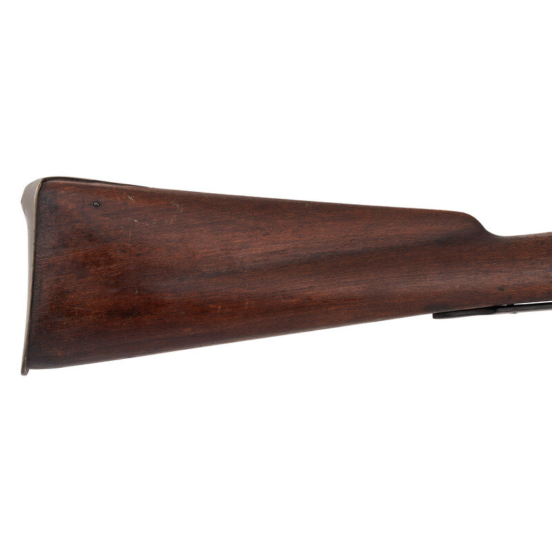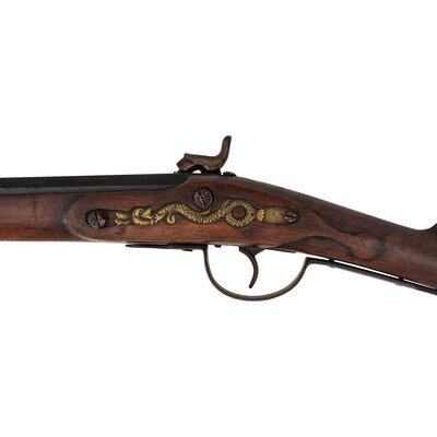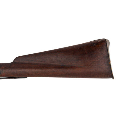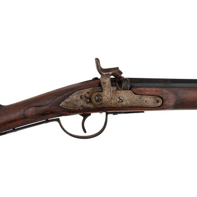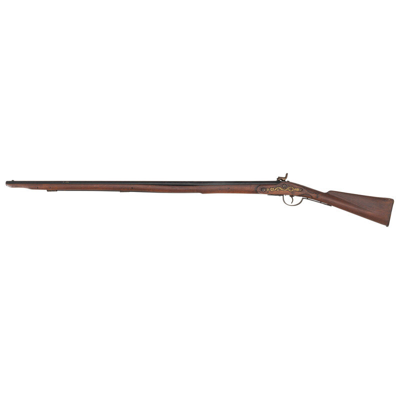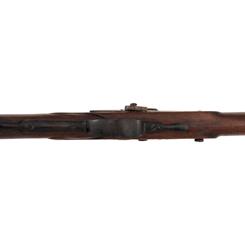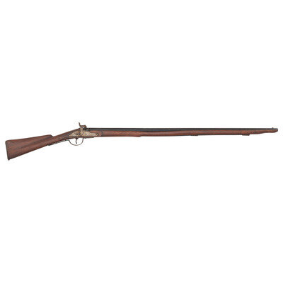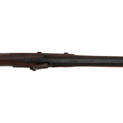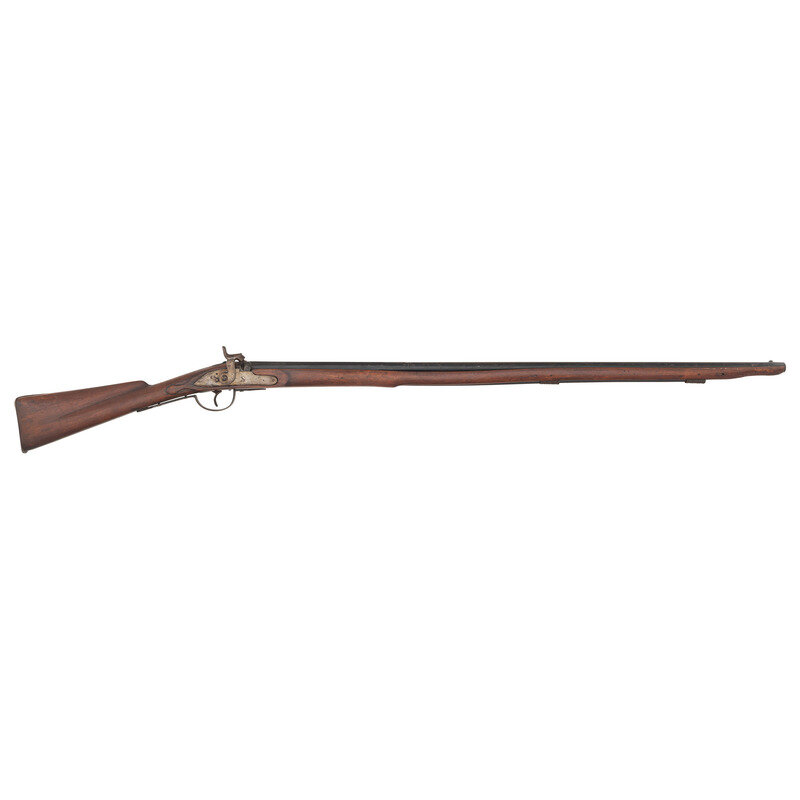 .60 caliber. 39" pinned three-stage octagon to round barrel. SN: NSN. Black painted barrel, brass and iron furniture, full-length walnut stock. Liege proof mark on top of barrel, percussion lock with "{Circle-Fox}" trademark. Traditional trade gun features include the brass three-screw serpentine side plate, oversized iron triggerguard, raised carved aprons around the tang and rear of the lock mortise and counterpane. Simple brass buttplate, corrugated brass thimbles retain a wood ramrod.
