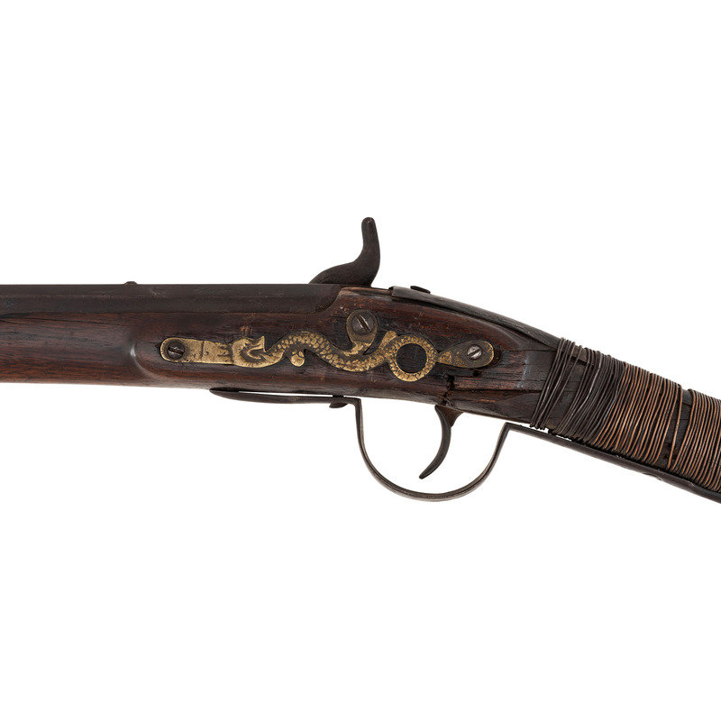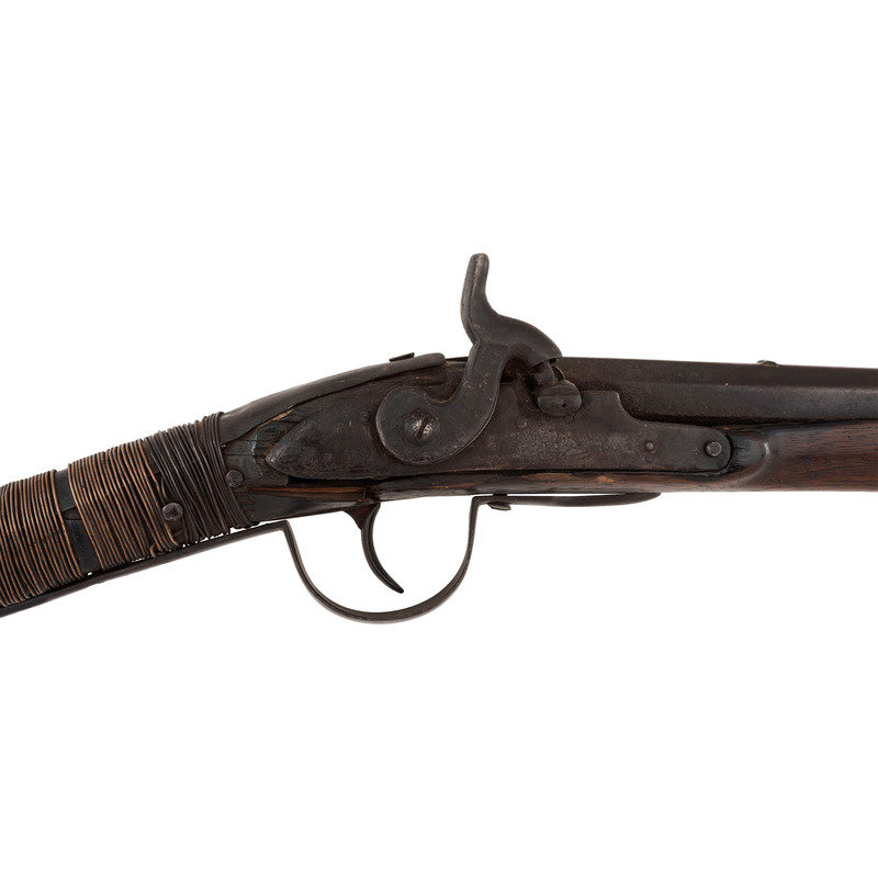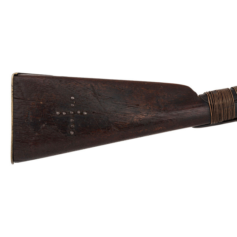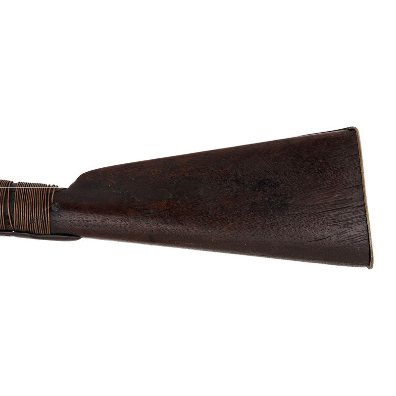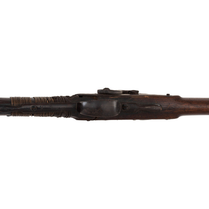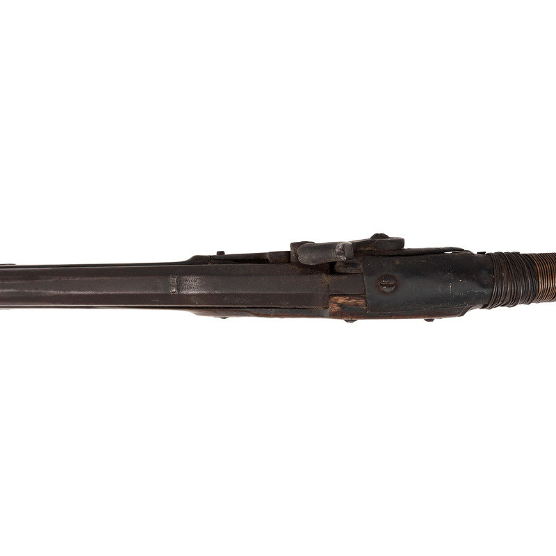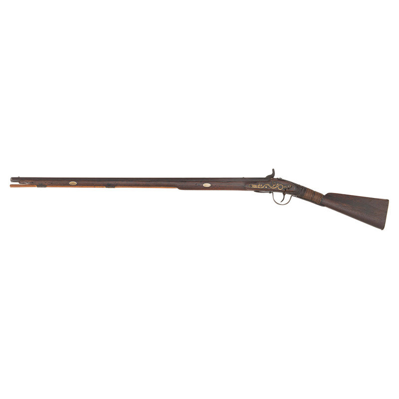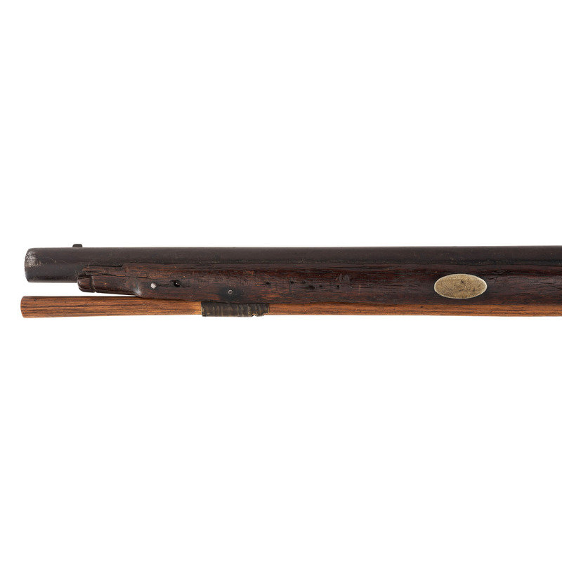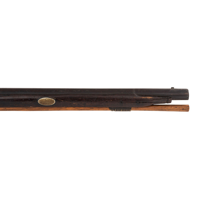 .60 caliber. 35" pinned three-stage octagon to round barrel. SN: NSN. Browned finish, brass and iron furniture, full length walnut stock with German silver decorations. Percussion altered flint lock marked "H.E. LEMAN/LANCASTER, PA" and with a "{Tombstone-Lion}/PA" cartouche. Barrel marked "TRYON/PHILADA" with part of the lower line obscured by an added rear sight and dovetail slot. Left angled barrel flat with fake proof marks in imitation of English proofs, no doubt intended to deceive those that the gun was traded to. Crude percussion hammer with similarly crude drum bolster. Forend with German silver oval escutcheons over some of the pins. Obverse butt decorated with small iron tacks in the form of a cross, empty tack holes are present in the forend as well. Typical trade gun features include the three-screw brass serpentine side plate, oversized iron triggerguard, flat brass buttplate and corrugated ramrod thimbles with wood ramrod. The gun is broken through the wrist and lock mortise with an old sheet iron repair nailed in place and is wrapped with copper wire to reinforce the repair. A hard used and completely authentic Native American used American made trade gun. Mr. Ness' attached tag notes that he feels this is a Chief's Grade gun.