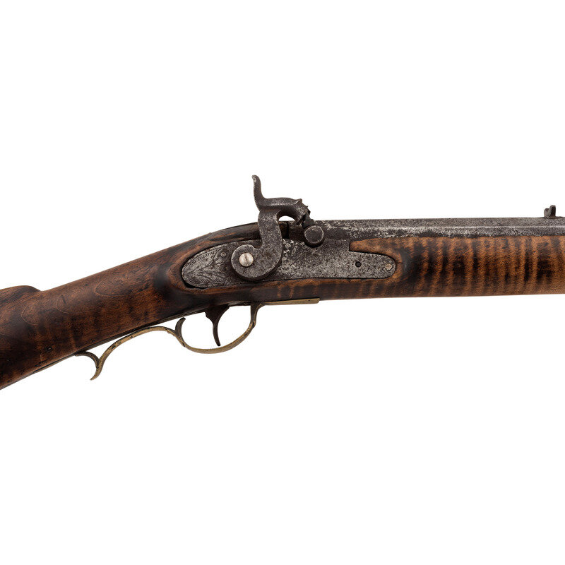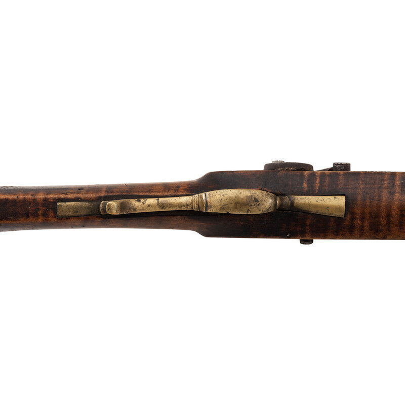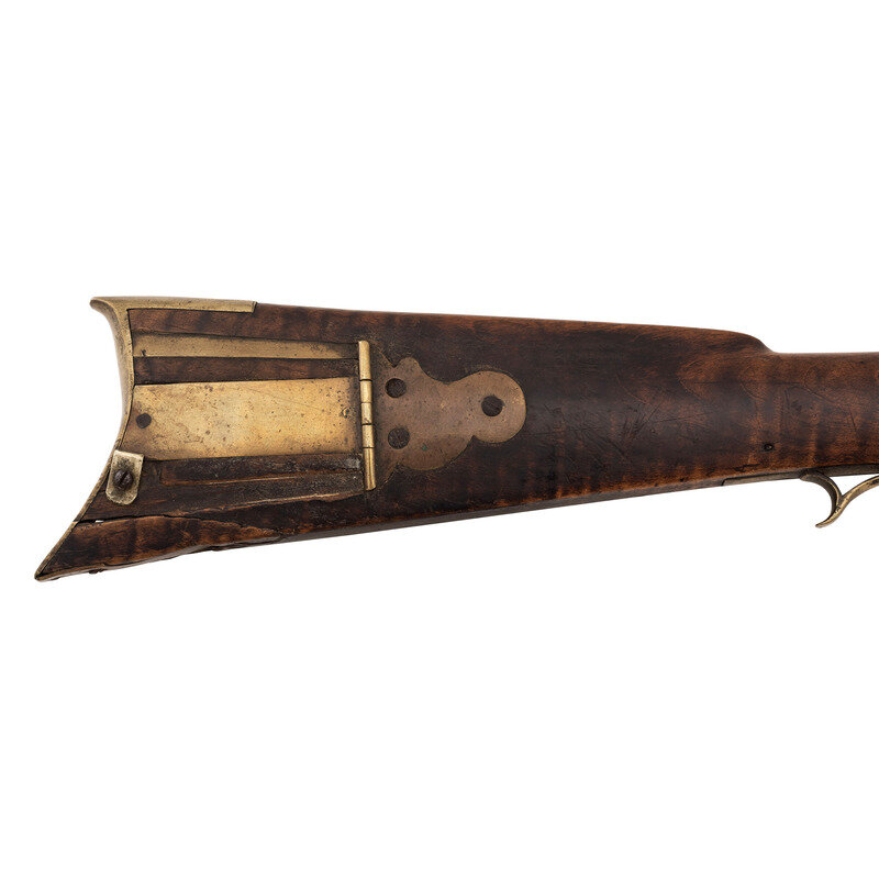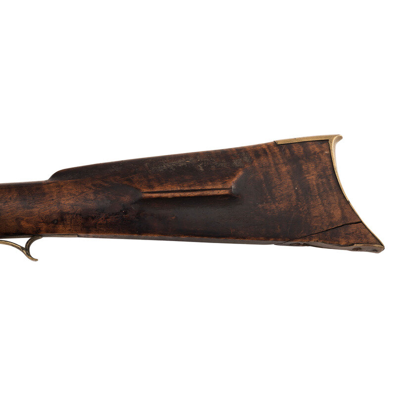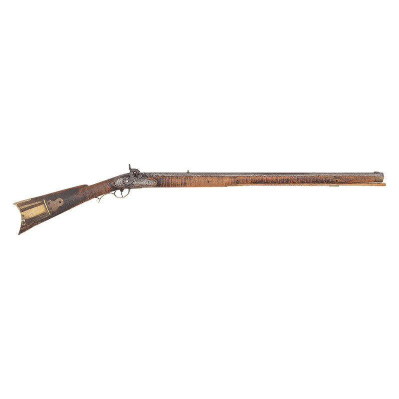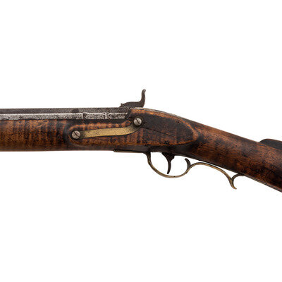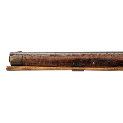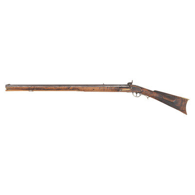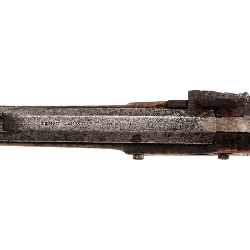 .52 caliber. 30.5" pinned octagonal barrel. SN: NSN. Bright finish, brass furniture, full-length hardwood stock. Top flat of barrel marked "LEMAN LANCASTER P.A. WARRANTED", lightly engraved commercial percussion lock with no discernible markings appears to be an old replacement as the fit is poor. The rifle was likely altered to percussion from flint as the drum bolster is crude and the lock was probably replaced at the time of alteration. Rifle mounted with a four-piece simple Lancaster style patch box with lower leg broken and missing and relying on an old piece of brass with a screw to hold the door closed. Additionally brass furniture includes the buttplate, toe plate, S-shaped side plate, triggerguard with short spur, nose cap and ramrod pipes. The barrel and stock appear to have been shortened during the period of use, probably between 2" and possibly as many as 12". Lock mounting screws replaced, as is the hammer screw. Fixed notch rear sight and dovetailed Rocky Mountain brass front sight blade. Includes a wooden ramrod.