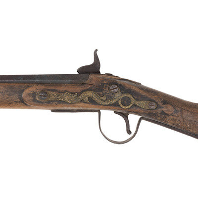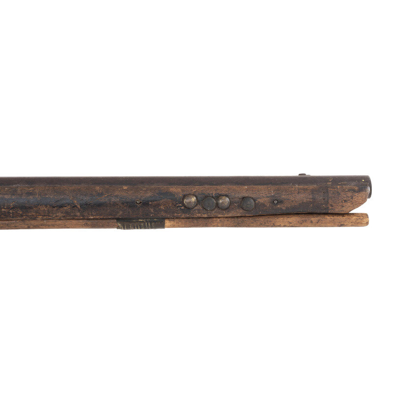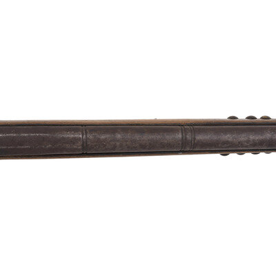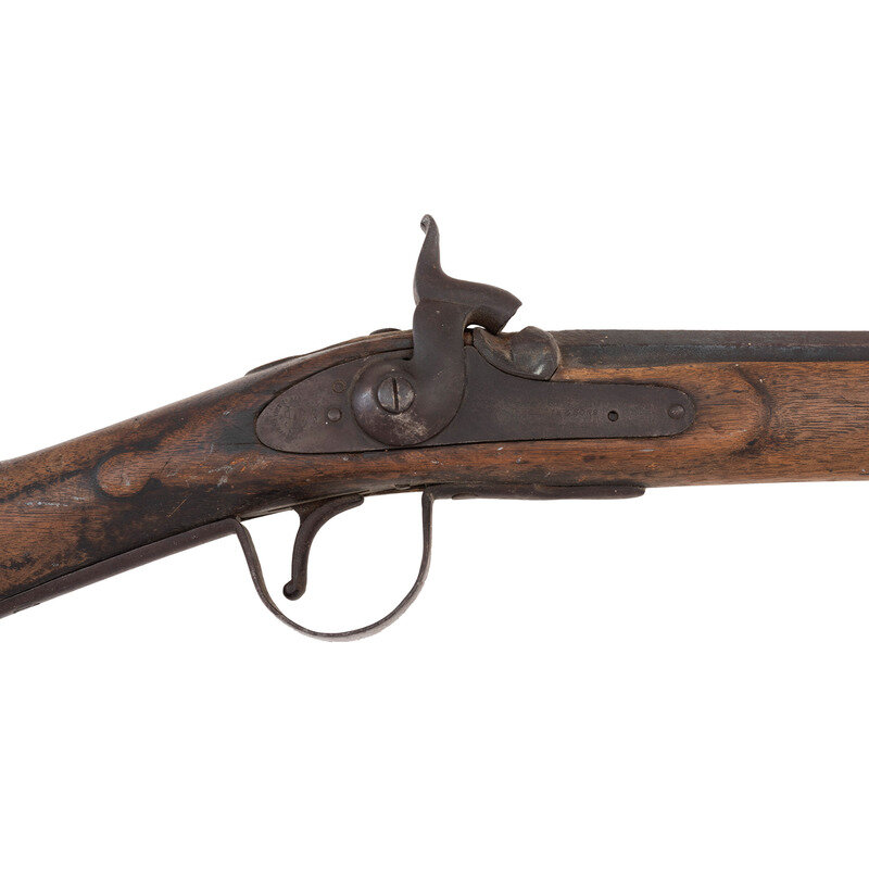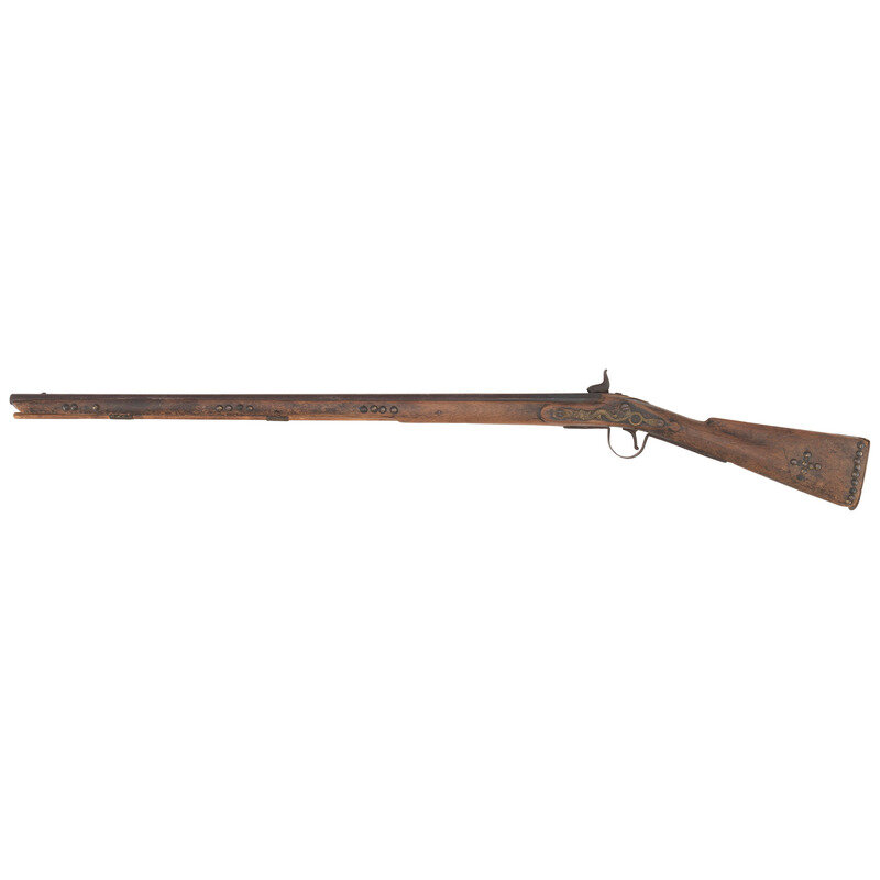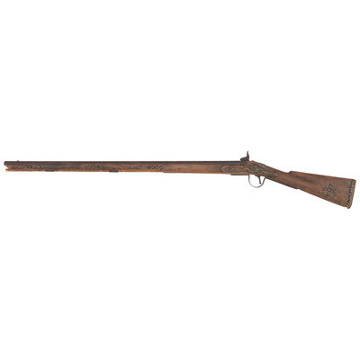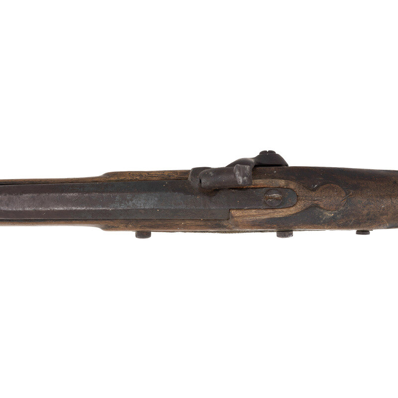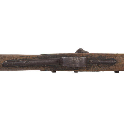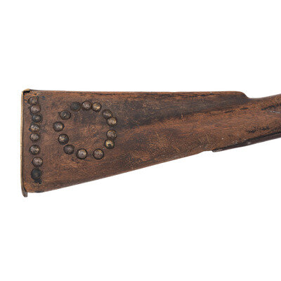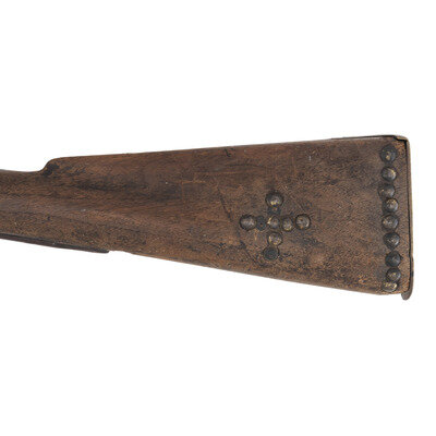 .58 caliber. 36" pinned three-stage octagon to round barrel. SN: NSN. Blued finish, brass and iron furniture, walnut stock. Flat Enfield style lock marked with the usual Isaac & Hollis trademark at the tail and "I HOLLIS & SONS" forward of the hammer. Left angled barrel flat with Birmingham commercial proofs and "24" gauge mark, indicating .58 caliber. Three screw serpent side plate, oversized iron triggerguard, two corrugated brass ramrod pipes secure an old wooden ramrod. Stock with typical raised carved aprons around the breech plug tang and at the tail of the lock and counterpane. Stock with numerous added old tacks with some missing leaving old brass shanks without heads in the butt as well as some tack holes. A great looking, untouched and completely honest Native used trade gun.