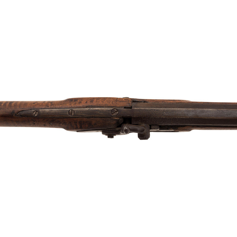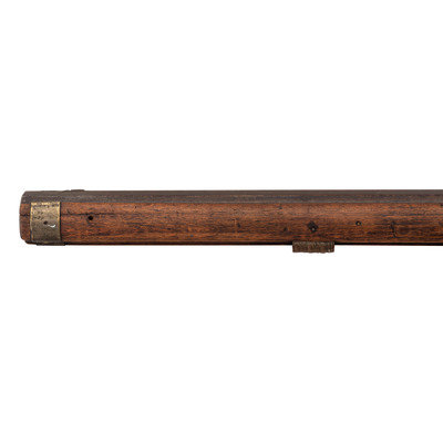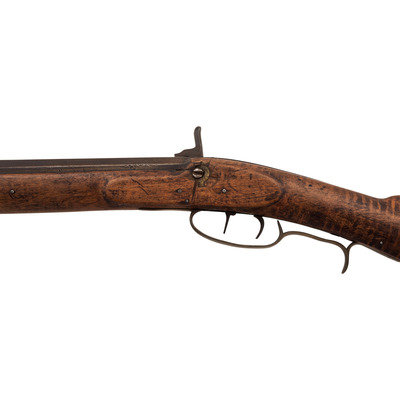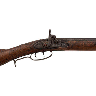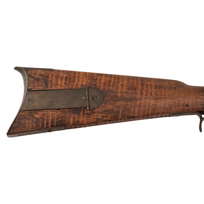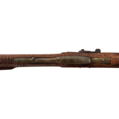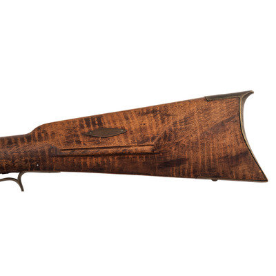 .40 caliber. 34" pinned octagonal barrel. SN: NSN. Blued finish, brass furniture, full-length hardwood stock with raised cheek rest. Lightly engraved single screw percussion lock marked "GOULCHER" in a banner. Barrel with drum bolster with weak traces of a Leman mark, but only "WARRANTED" remains legible. Barrel with long, three-screw tang similar to guns made in Western North Carolina and Eastern Tennessee, simple two-piece brass patchbox with release in toe that suggests a similar region of production. Despite the fact that the gun is configured and stocked like a rifle from these regions from the lock back, from the lock forward it has the overall appearance of a typical trade gun with a forend that extends to the muzzle, a simple sheet brass reinforcement at the forend tip and a corrugated ramrod pipe. Dovetailed, semi-buckhorn rear sight dovetailed front sight blade, finger extension triggerguard with spur. The gun was likely shortened during the period of use and possibly reconfigured to be more like a trade gun at that time. An interesting percussion rifle that is short and handy enough for use on horseback or in dense brush with a nice look to it.