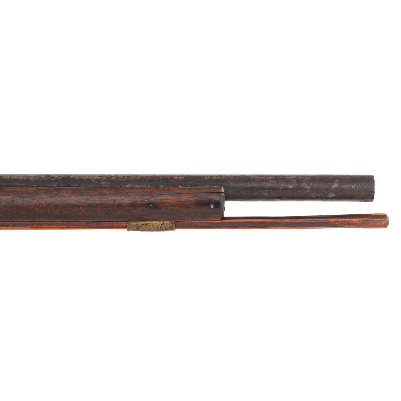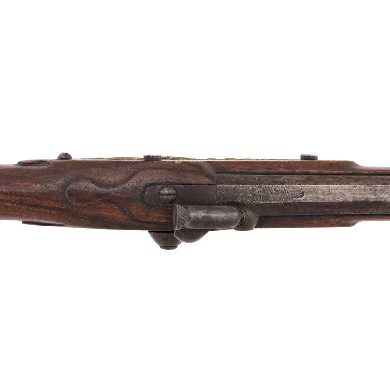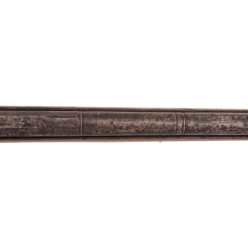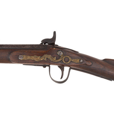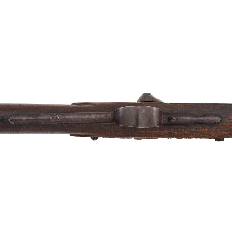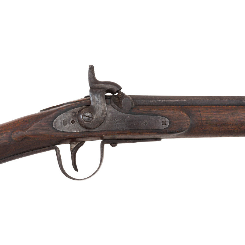.58 caliber. 30" pinned three-stage octagonal to round barrel. SN: NSN. Browned finish, brass and iron furniture, Enfield musket style walnut stock with checkered wrist. Enfield-style lock marked "BARNETT/LONDON/1885" forward of the hammer, with a Hudson's Bay Company's "{Tombstone Fox/EB}" at the tail. Upper left breech flat marked with London commercial proof marks and a "24" gauge mark indicating .58 caliber. Three-screw dragon motif serpent side plate, flat brass buttplate, oversized iron triggerguard. Gun shortened roughly 6"-8" with the forend shortened an additional 4". Retains a single corrugated brass pipe and wood ramrod. A solid example of a later 19th century trade gun that retains the early style multi-stage barrel, side plate, buttplate and large triggerguard that were typical of this from from the mid-18th century onward and combines them with Pattern 1853 Enfield pattern lock, bolster and stock, which in this case incorporates the raised carved apron of the earlier production guns. This style of trade gun would predominate production of these items for the majority of the time they were produced, from the 1860s into the dawn of the 20th century.