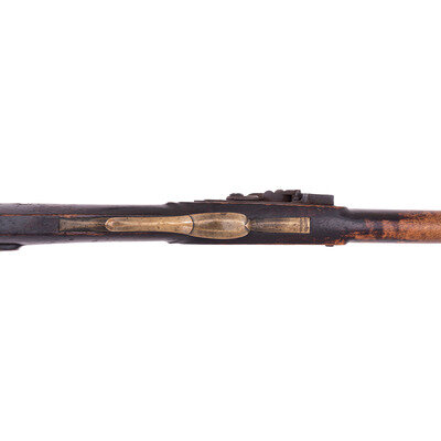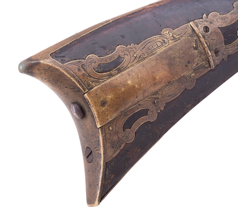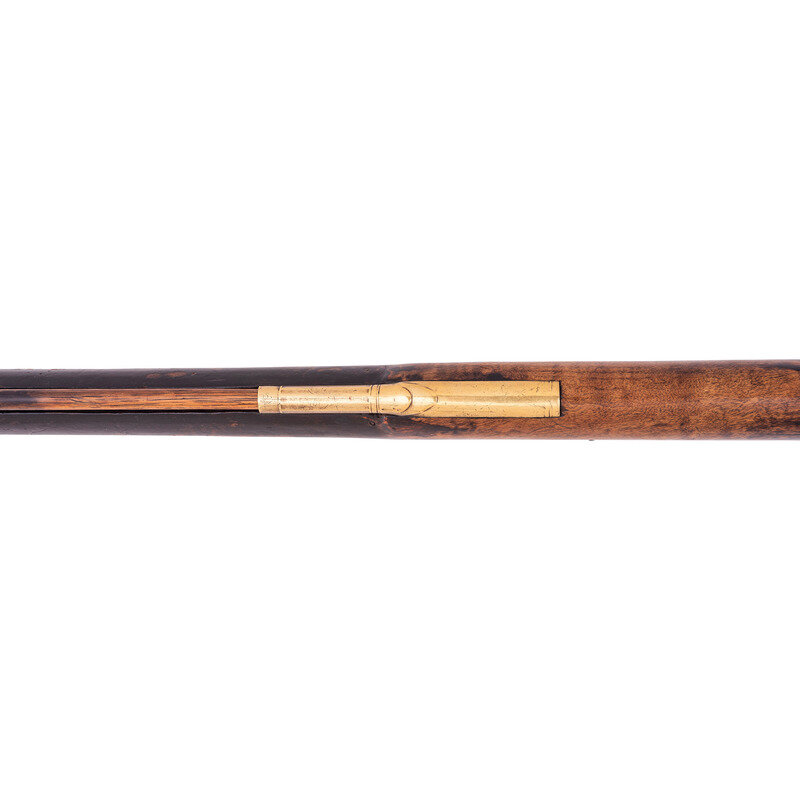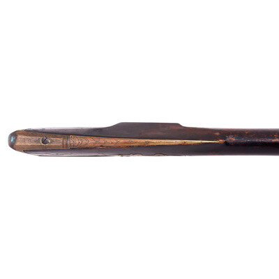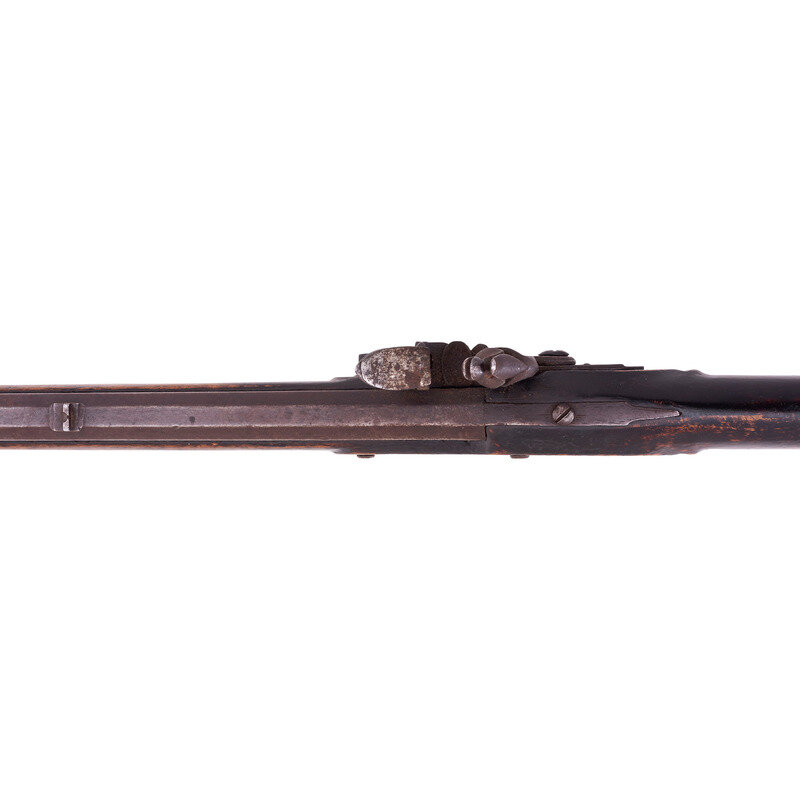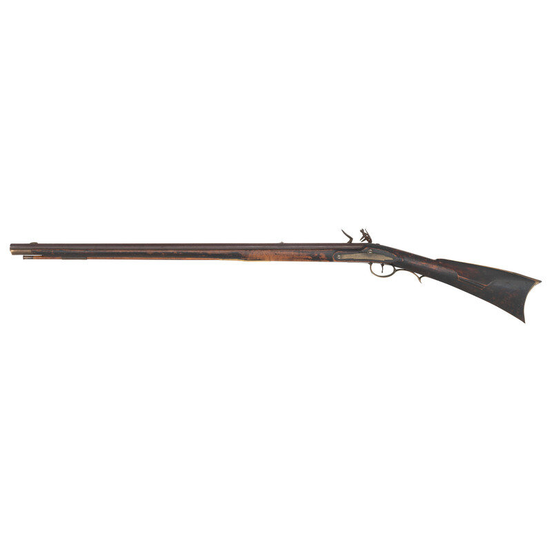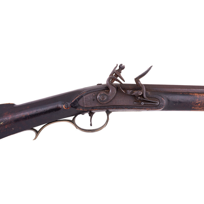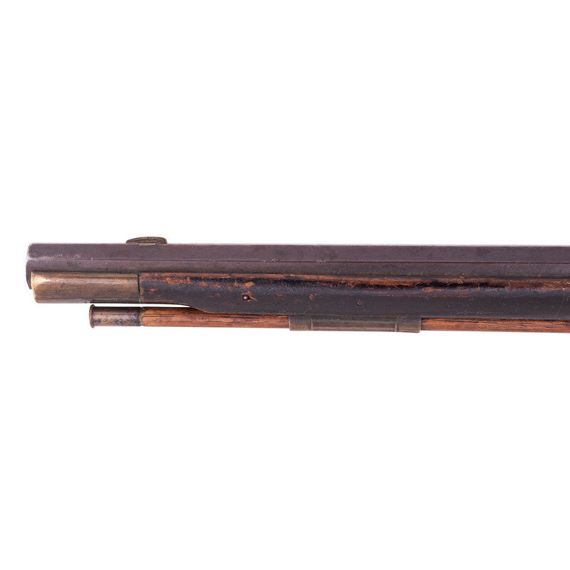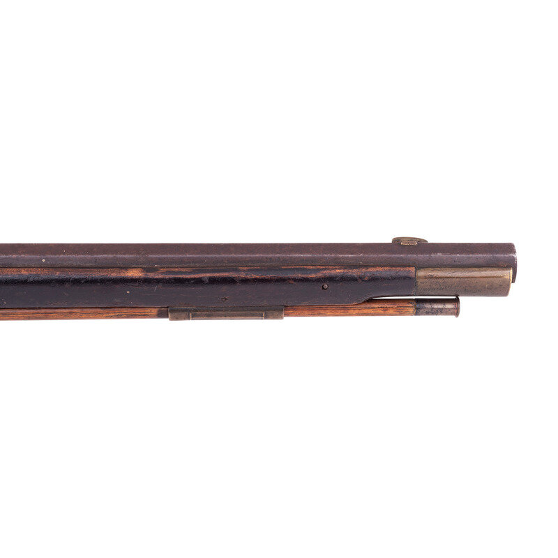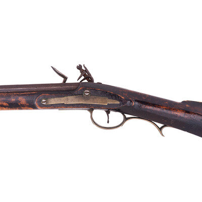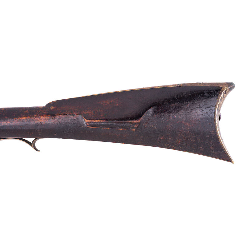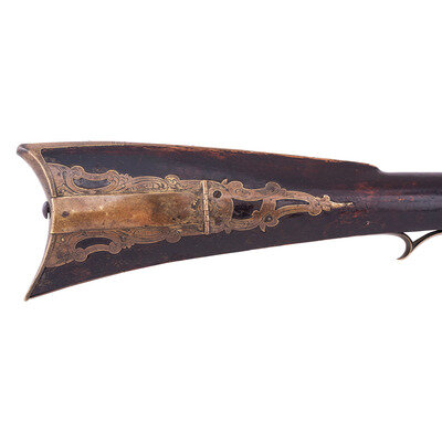 .40 caliber smoothbore. 28" pinned octagonal barrel. SN: NSN. Browned finish, brass furniture, maple stock. Commercially made lock in original flint with fenced waterproof pan and roller frizzen is marked "ASHMORE/WARRANTED" in two lines. Lock appears to retain original cock, although the cock screw is replaced. Brass mountings include a flat side plate, triggerguard with short spur finger extension, buttplate, toe plate and nose cap. Rifle is additionally mounted with a truly wonderful open work, four-piece patchbox that is lightly engraved, with the release on the bottom of the buttplate. A tastefully engraved brass plate is also applied to the comb. Sights include a dovetailed notch rear and dovetailed Rocky Mountain brass blade front. A sheet brass ramrod thimble and entry pipe secure an old, brass tipped wooden ramrod. Stock with raised cheek rest and a graceful form indicative of truly talented maker. A really lovely example of a flintlock "Kentucky" style boys rifle with an exceptionally attractive patchbox.