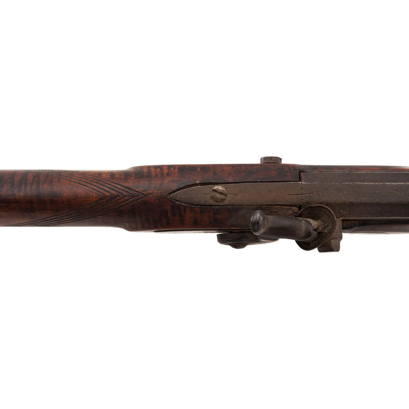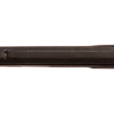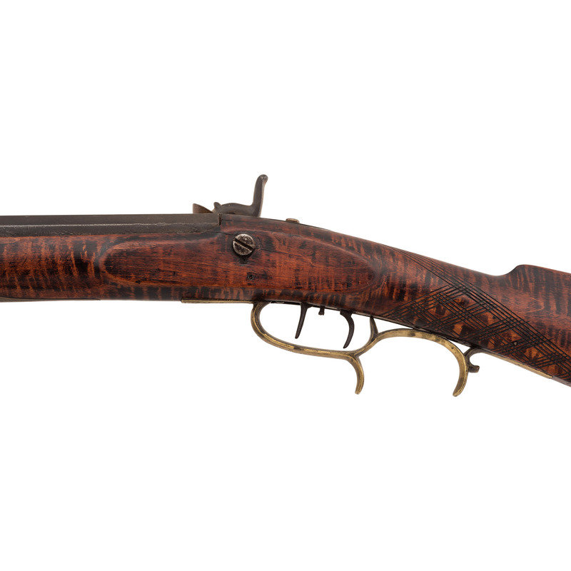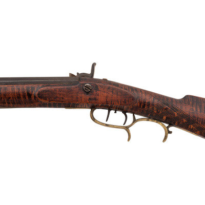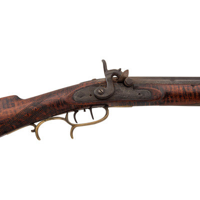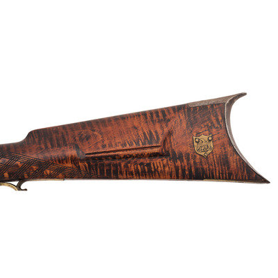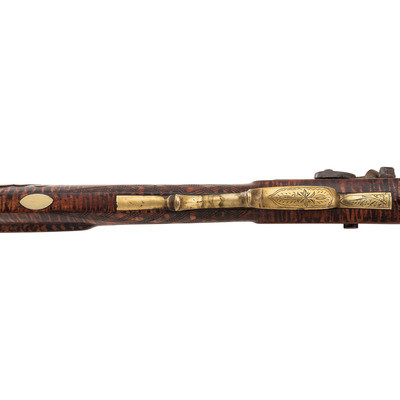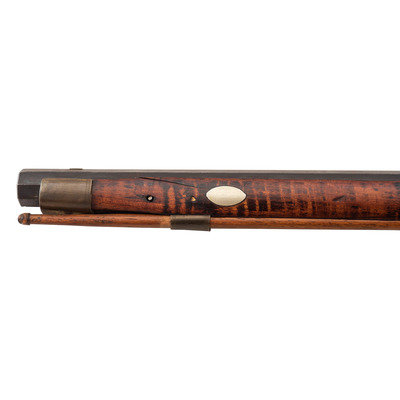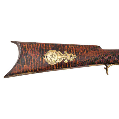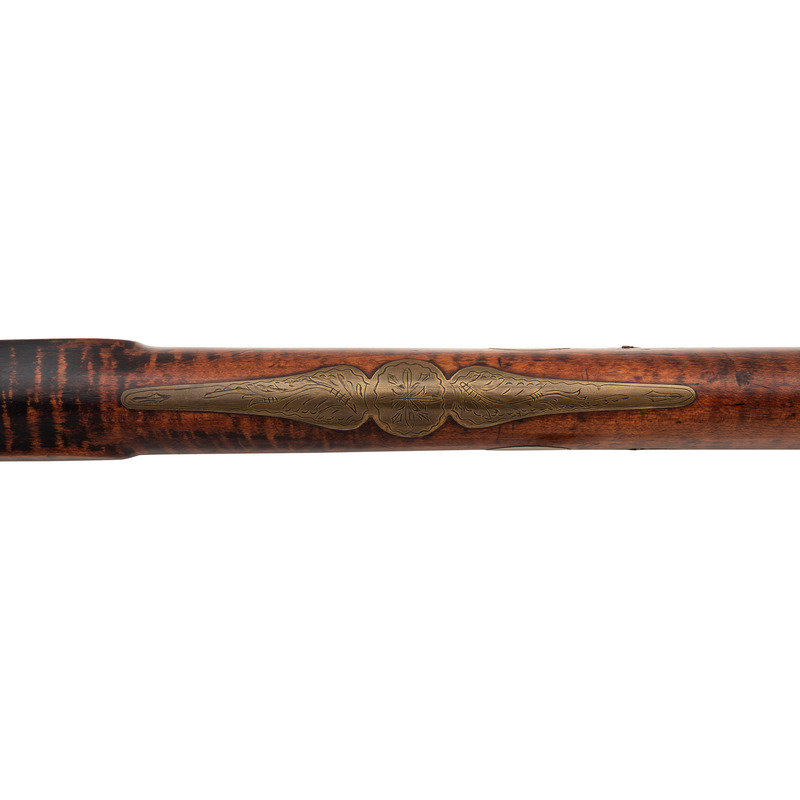 .36 caliber. 39" pinned octagonal barrel. SN: NSN. Browned barrel, commercial brass furniture, German silver pin escutcheons, full-length stock with raised cheek rest and checkered wrist. Single screw percussion lock is lightly engraved and marked "LEMAN/LANCTR, PA". Lock equipped with double set triggers. Barrel with drum bolster and marked in three lines "LEMAN/LANCASTER/WARRANTED". Brass furniture includes a lightly engraved round patchbox, engraved brass saddle plate and toe plate, plain finger extension triggerguard, ramrod pipes and nose cap. Crescent iron buttplate. Brass wrist shield with eagle from a Civil War imported Brazilian Light Minie Rifle added to the reverse butt behind the cheek rest. Dovetailed notch rear sight, dovetailed German silver front sight blade. Forend with pins concealed by oval German silver escutcheons.