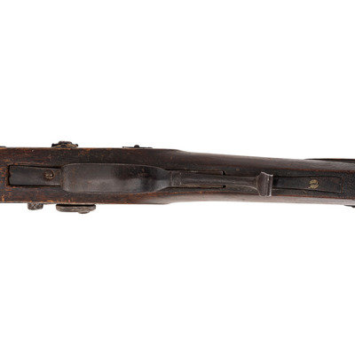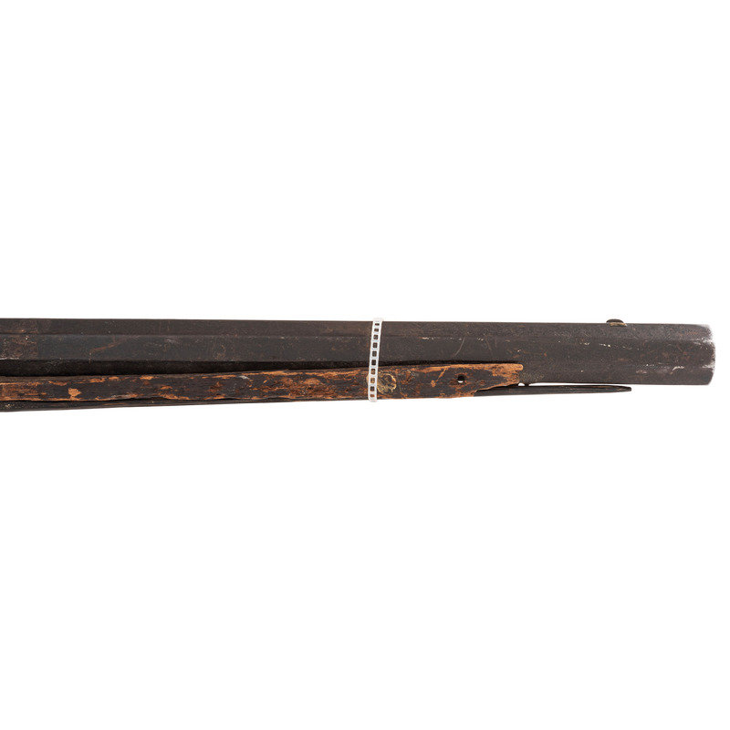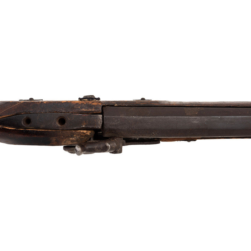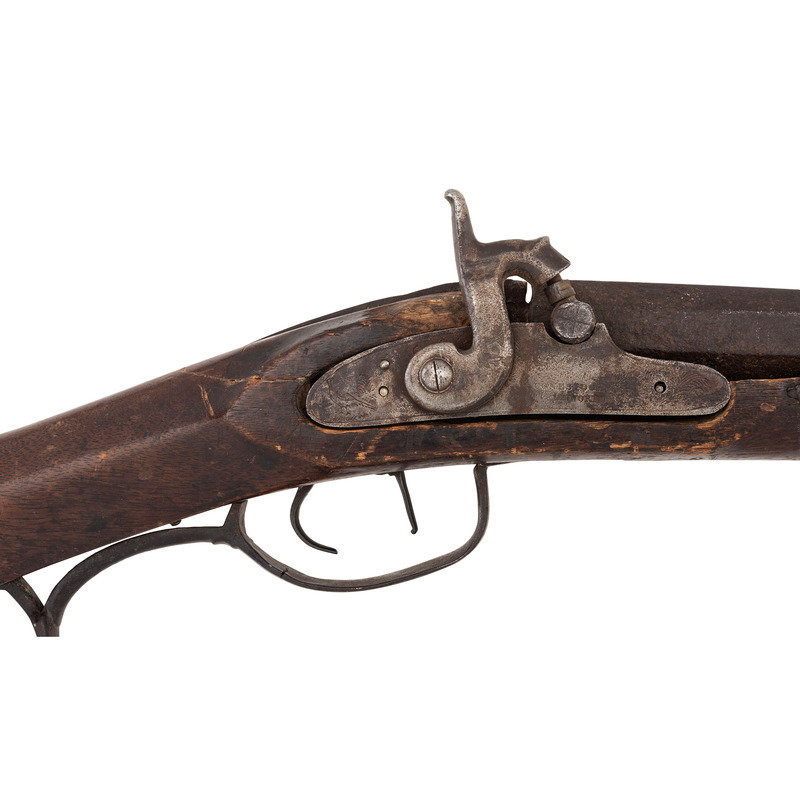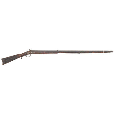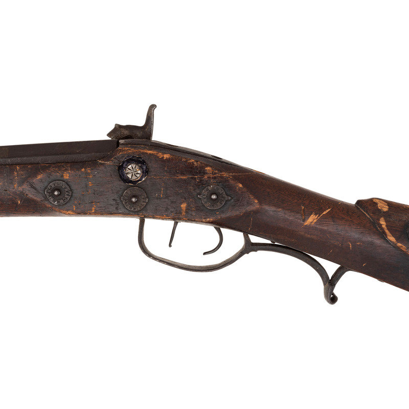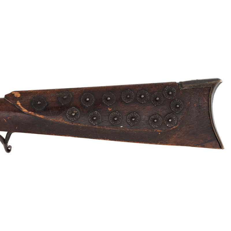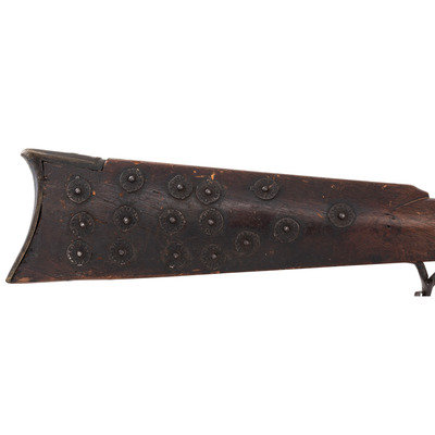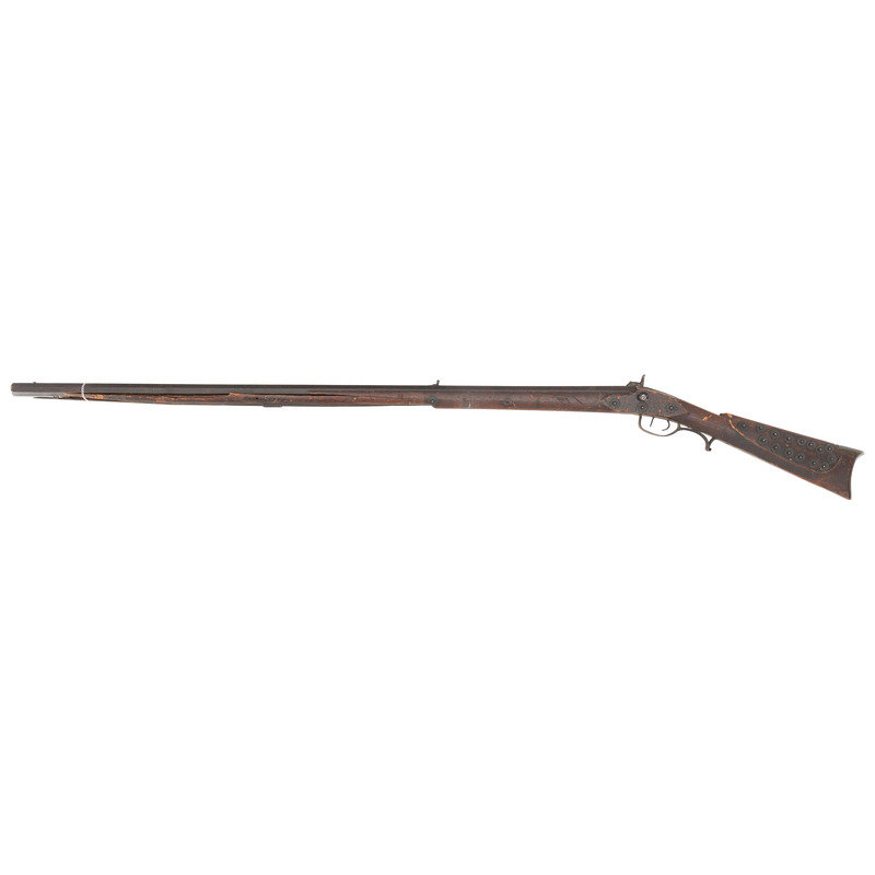 .44 caliber. 45.75" pinned octagonal barrel. SN: NSN.Heavily oxidized metal, brass and iron furniture, hardwood full-length stock with rudimentary cheek rest. Single screw percussion lock is marked "CONESTOGA/RIFLE WORKS". Lock equipped with double set triggers. Crescent brass buttplate, iron furniture includes finger extension triggerguard and ramrod pipes that secure a short and splintered wood ramrod. Mid-length, two-screw tang, dovetailed notch rear sight, dovetailed Germans silver front sight blade with brass base. Stock is decorated with thirty-eight .685" diameter round iron tobacco tags that are embossed "HANCOCK RICHMOND VA" around their periphery. The tags are primarily applied to the obverse butt and the cheek rest but are also present on the forend and counterpane. Hancock was a Richmond based tobacco company during the mid-1800s. As noted in Mr. Ness' attached tag, "This Indian liked the decoration."