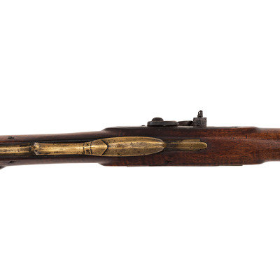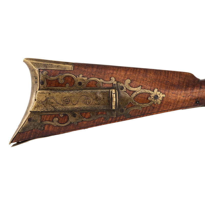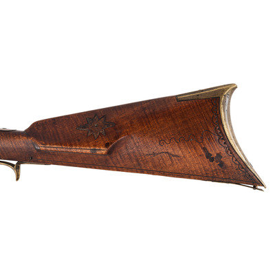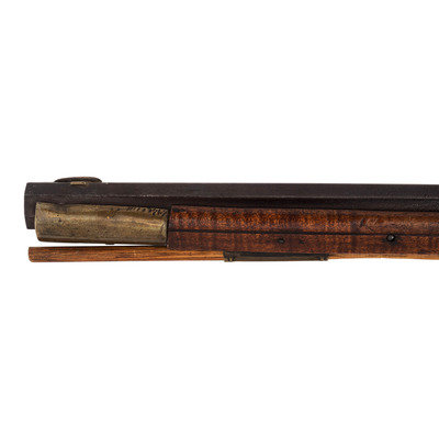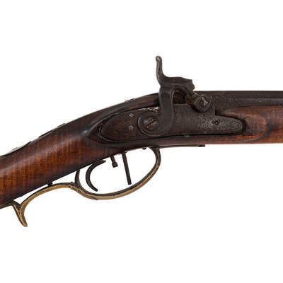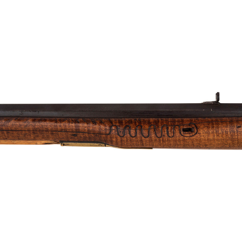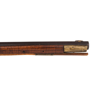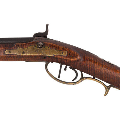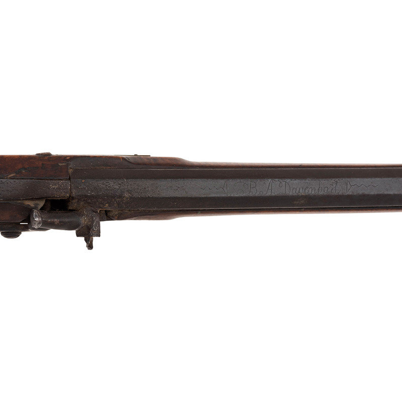.28 caliber. 31" wedge-retained octagon barrel. SN: NSN. Browned finish, brass furniture, full-length hardwood stock. Diminutive small bore rifle measures 46.5" in overall length with a 13" length of pull. Barrel engraved "B A Davenport". Altered from flint to percussion with a replacement single screw percussion lock that is unmarked and equipped with double set triggers. Barrel with drum conversion bolster. Dovetailed fixed semi-buckhorn rear sight and dovetailed German silver front sight blade with brass base. Rifle mounted with engraved brass hardware including a lovely open work four-piece patchbox with small daisy head finial, with release (missing) in toe plate of stock. Brass finger extension spur triggerguard, brass buttplate and open work toe plate, lightly engraved geometric brass sideplate, 2.375" brass nose cap. Stock with raised cheek rest missing a brass or German silver starburst decoration, wrist with German silver thumb plate. Stock with decorative incised lines around periphery of but and along forearm. B.A.Davenport is not listed in Sellers' American Gunsmiths and could not be located in any other readily available references.
