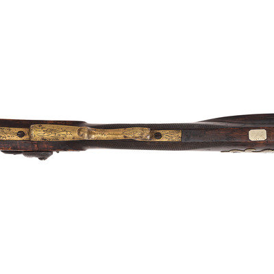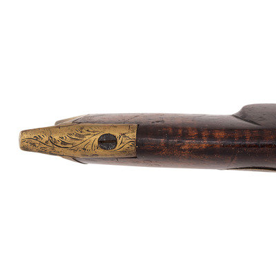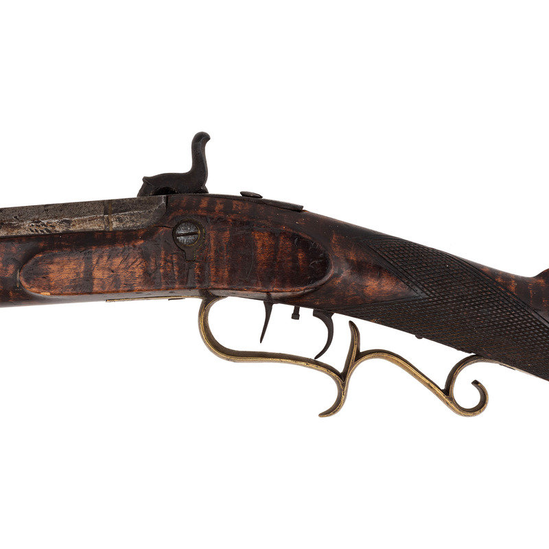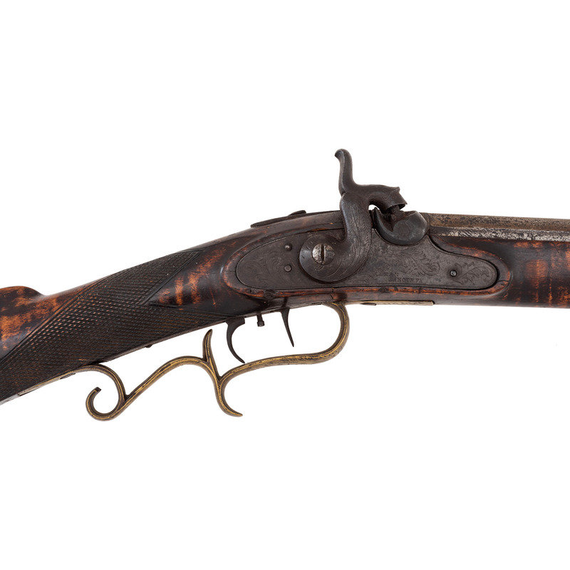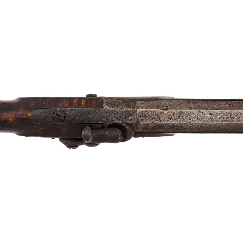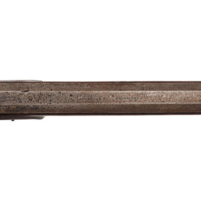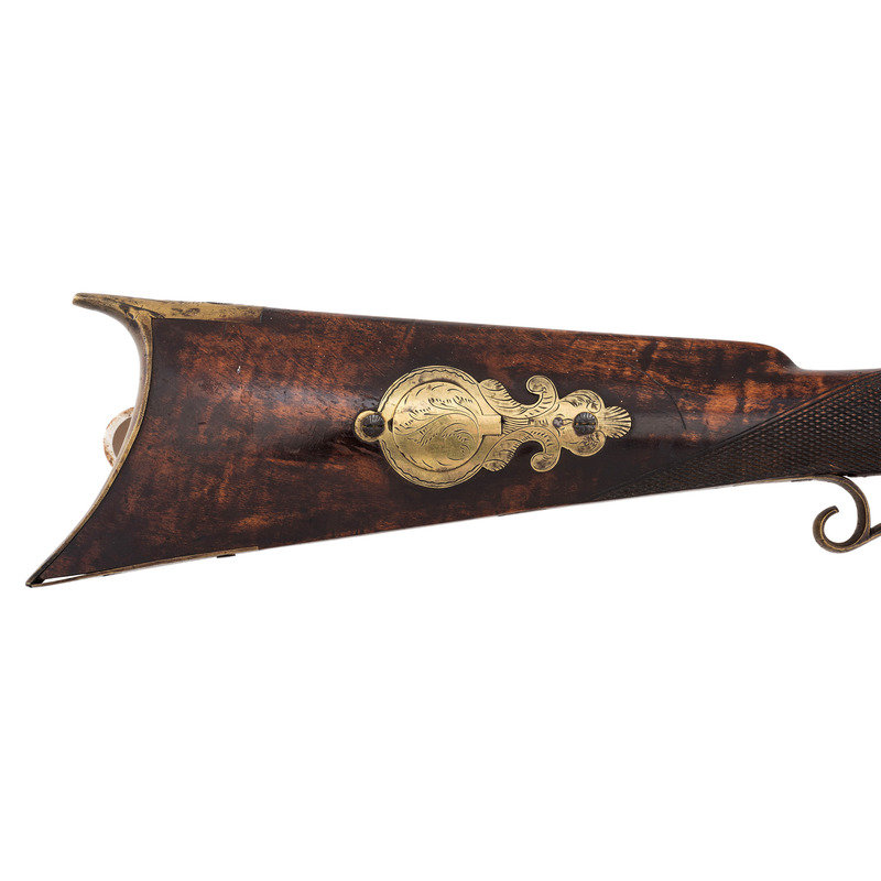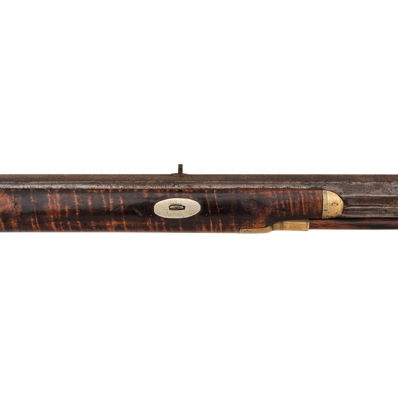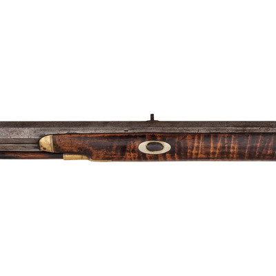.40 caliber. 38.5" wedge retained octagon barrel with under rib. SN: NSN. Browned finish, brass furniture, German silver escutcheons, half stock with raised cheek rest and checkered wrist. Single screw percussion lock is lightly engraved and marked "LEMAN/LANCTR PA" in two lines. Top flat of barrel marked in two lines "H.E. LEMAN/LANCASTER" and "WARRANTED". Double set triggers, dovetailed semi-buckhorn fixed rear sight, German silver Rocky Mountain front sight blade. Engraved round brass patchbox, extended finger-spur scroll brass triggerguard, and brass butt and toe plate, brass nose cap, German silver escutcheons around wedge and lozenge escutcheon in toe line. Iron thimbles, brass entry pipe, wood ramrod. A very nice, higher quality rifle from Leman.