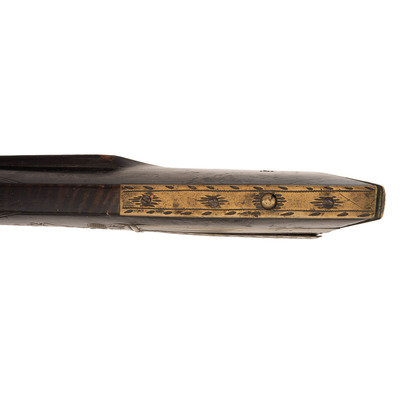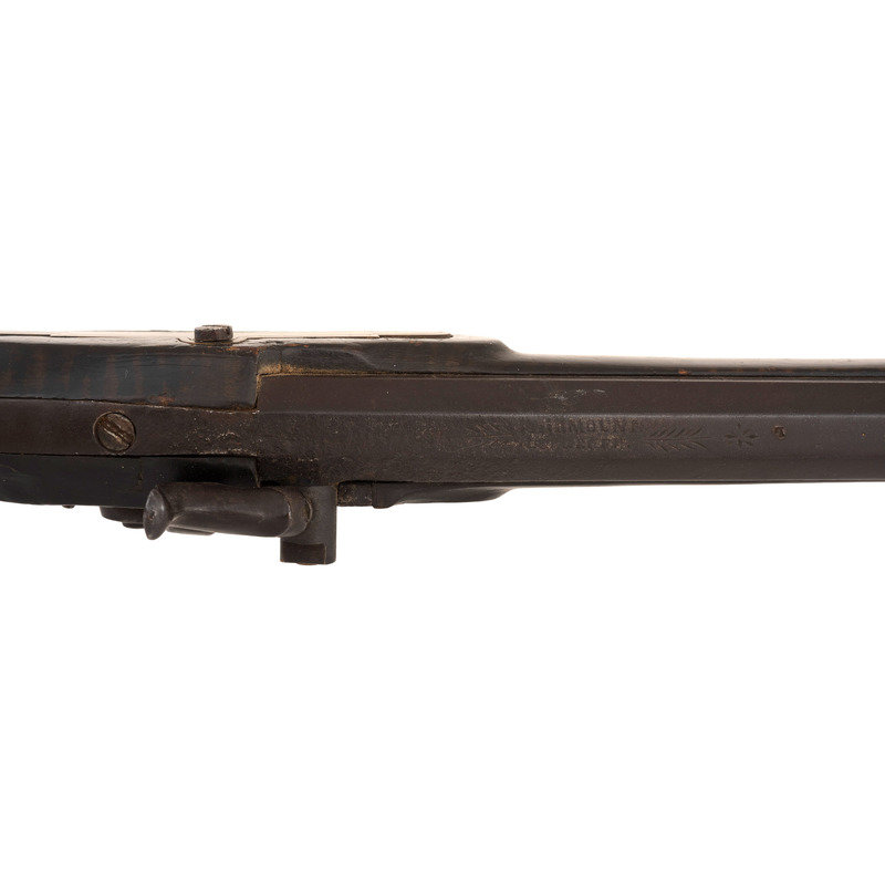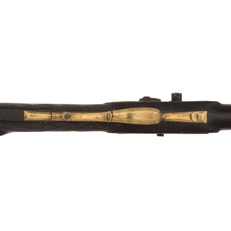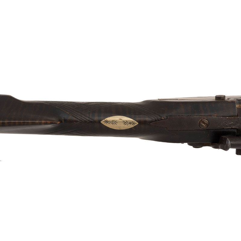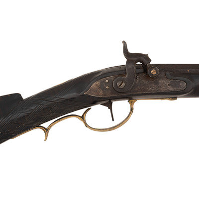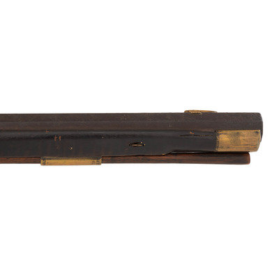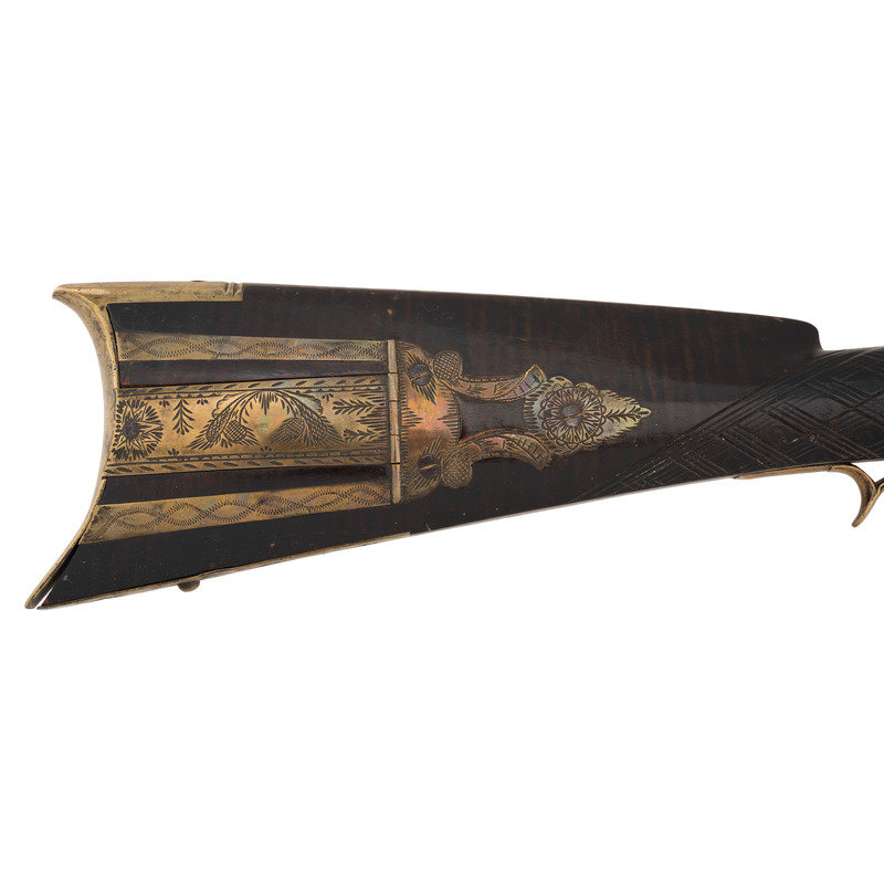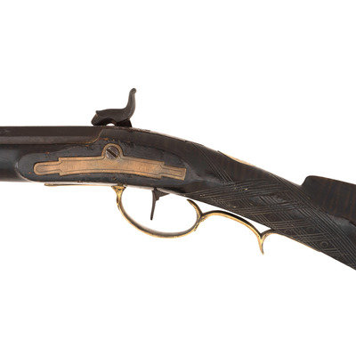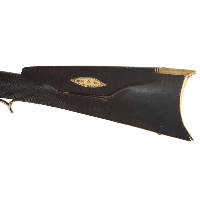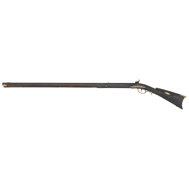 .44 caliber. 41" wedge-retained octagonal barrel. SN: NSN. Browned finish, brass furniture, full-length hardwood stock with raised cheek rest and checkered wrist. Single screw commercial percussion lock marked "COOPER/WARRANTED". Barrel marked in two partially legible lines with the upper one reading "???MOUNT" and the lower line reading "?? GROFF". Rifle with drum bolster of modern production, and the accompanying noted document that the rifling has been recut for shooting. Rifle mounted with nicely engraved four piece brass patchbox with the release in the lightly engraved toe plate. Traditional commercial brass furniture include a crescent butt with faceted tang, an extended finger spur triggerguard, and a lightly engraved flat geometric single screw side plate. Other brass fittings include the nose cap, two plain thimbles and an entry pipe. Dovetailed fixed rear sight and dovetailed brass blade front sight. Checkered wrist with impressed asterisk style decorations that are also stamped on the barrel. Raised cheek rest with lightly engraved German silver escutcheon, with a smaller similarly engraved thumb piece at the wrist as well. Mr. Ness' notes on this gun are somewhat contradictory, as the gun is identified as the work of H.S. Groff of Lancaster but he refers to a Groff contract for Indian Department guns that was probably really with John Groff of Lancaster. Sellers listed H.S. Groff as an unidentified and unlocated maker of Kentucky style rifles, while John Groff worked in Lancaster, PA at the end of the 18th and during the early 19th century. This rifle appears to have been produced as a percussion rifle and the styling dates the gun no earlier than the late 1820s and possibly as late as the 1840s-1850s, suggesting it is not the work of John Groff. Other research indicates that H.S. Groff worked in Fairmount, PA, which is likely the address on the barrel, confirming the H.S. Groff identification. Mr. Ness categorizes the gun as a "Chief's Grade" trade rifle, but in the opinion of this cataloger the gun represents a very nice mid-19th century sporting rifle that has been worked on to make it a legitimate shooter today.