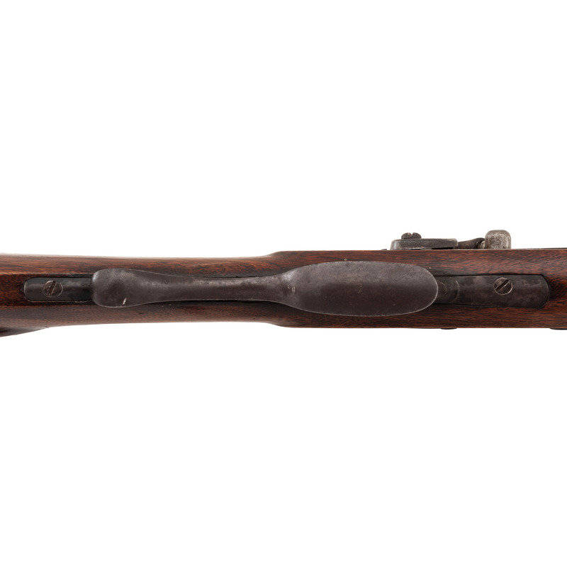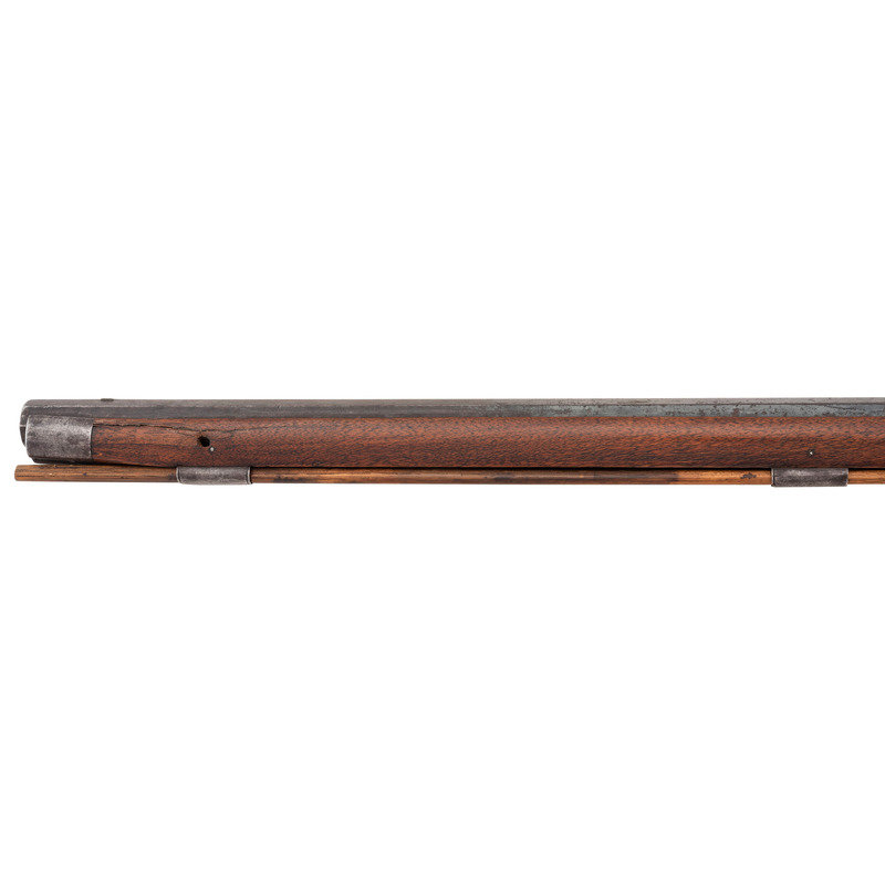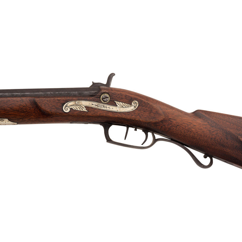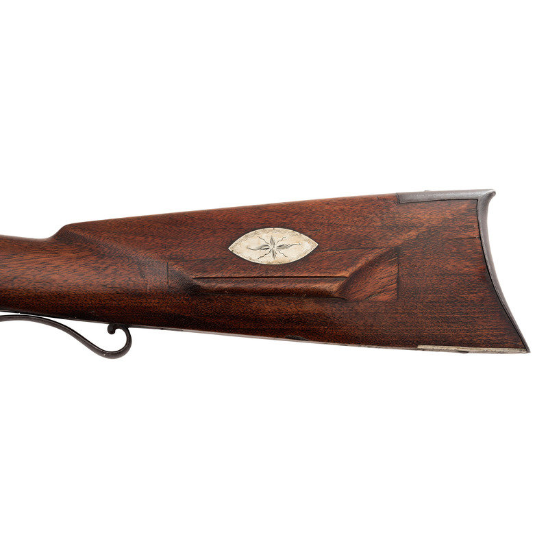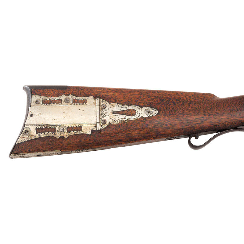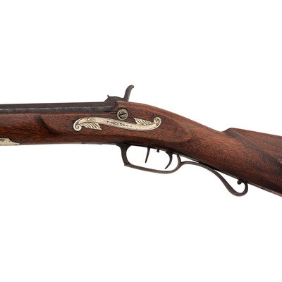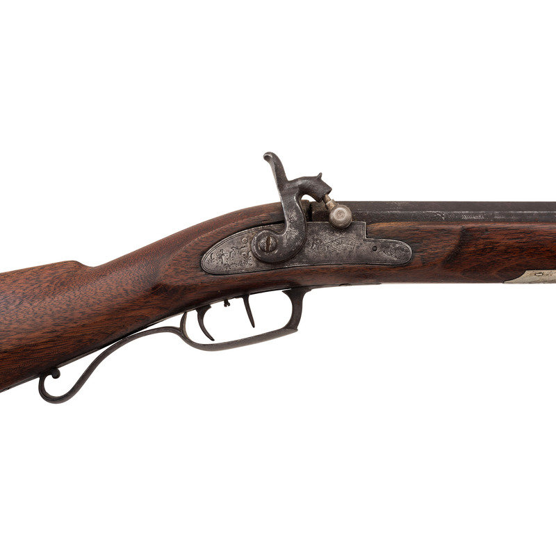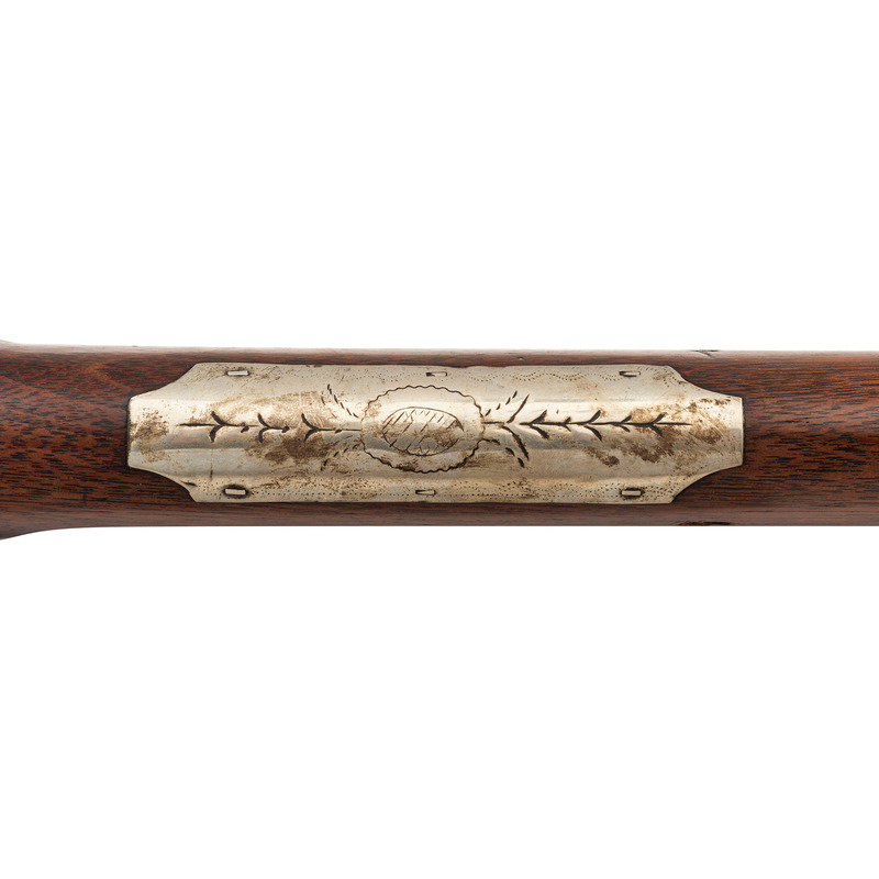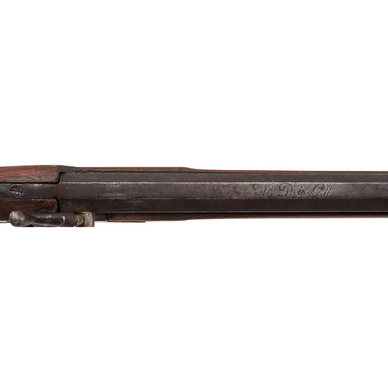 .48 caliber. 41.5" pinned octagonal barrel. SN: NSN. Blued barrel, German silver and iron mountings, full-length hardwood stock. Single screw commercial percussion lock is lightly engraved and marked "JOSEPH GOULCHER" in a ribbon and equipped with double set triggers. Barrel measures 1" across the flats at the muzzle with a replaced drum bolster and nipple and is singed "B.D. Gill" in script. Rifle mounted with a nicely engraved open work German silver four-piece patchbox with an urn finial and nicely engraved toe plate with patchbox release. Period of use added German silver saddle plate is engraved by a lesser hand and shows moderate wear. Crescent iron buttplate, scroll style iron triggerguard, iron nose cap. Rifle with dovetailed fixed notch rear sight and German silver dovetailed blade front sight. Iron thimbles retain an old wood ramrod. An old note in the patchbox says that the rifle is named "Big Bertha" and was the favorite rifle of Charles M Borger. It was purchased from a Joe Bucheit of Old Appleton, MO around 1957. B.D. Gill was a Pennsylvania gunmaker who worked at the end of the flintlock era and into the percussion period circa the 1840s. He is best known for making a rifle that was decorated with crossed arrows and a tomahawk that was given by Kit Carson to a Taos Indian in 1848. A very nicely made heavier barrel full stock rifle with lovely German silver furniture.
