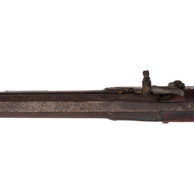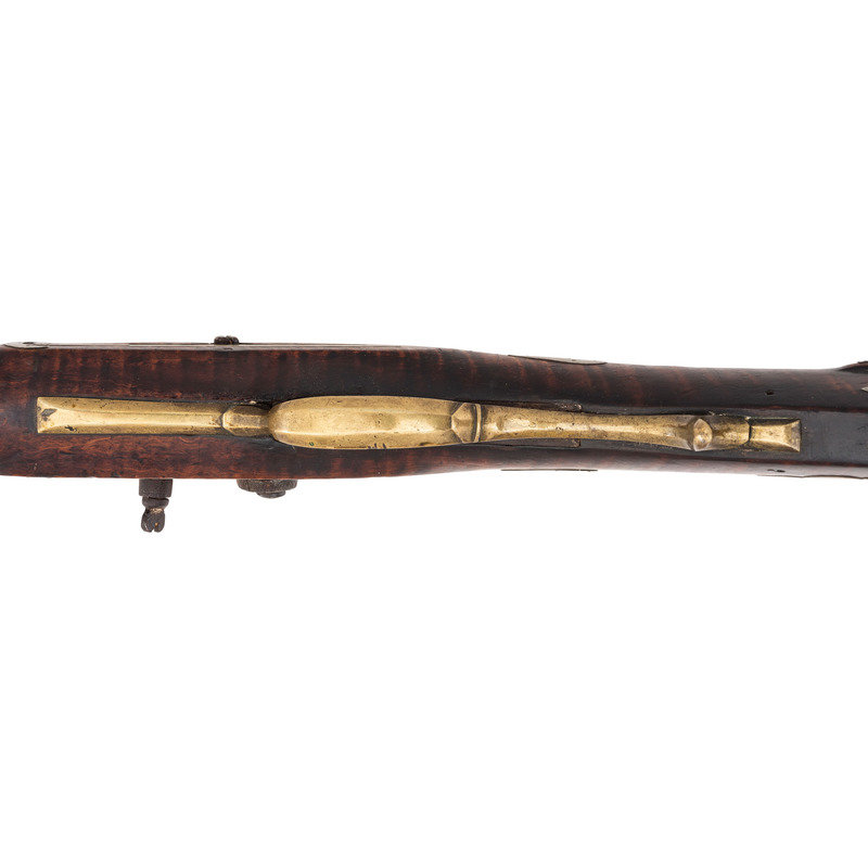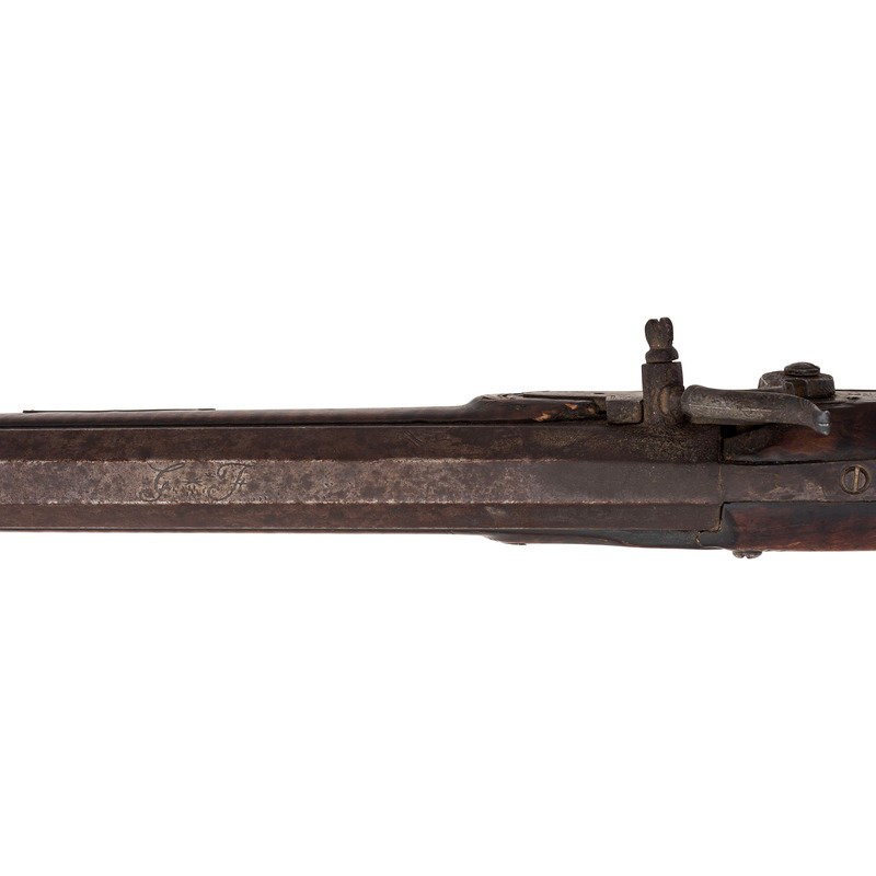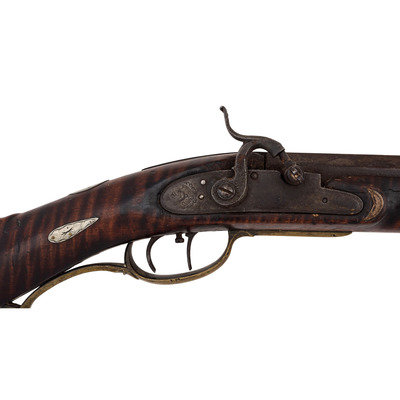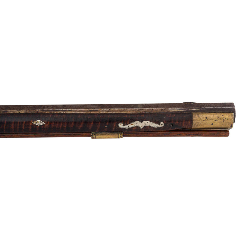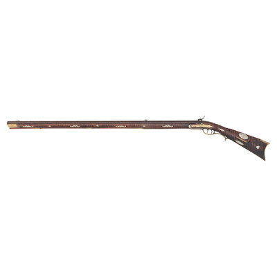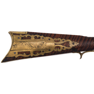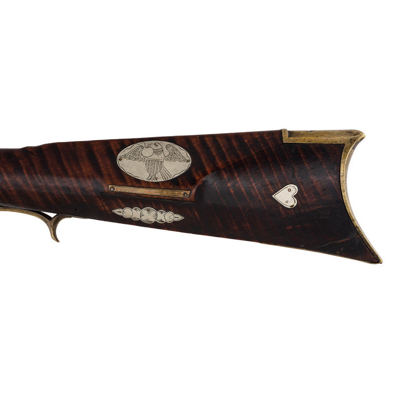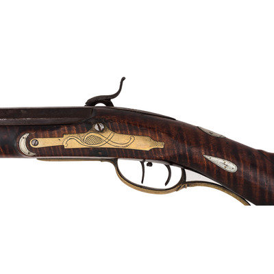 .44 caliber. Pinned 41.25" heavy octagonal barrel 1" across the flats at the muzzle. SN: NSN. Browned finish, brass furniture, full-length stock with raised cheek rest, German silver decoration and inlays. Unmarked, lightly engraved commercial single screw percussion lock may be an old replacement with thin hammer and long, curved spur reminiscent of Lehigh Valley guns. Barrel with long, screwed in drum bolster is signed in script "G*F+". Lock with double set triggers, dovetailed fixed notch rear sight, dovetailed German silver front sight blade in brass base. Obverse butt with lightly engraved open work four-piece brass patchbox. Two-screw flat side plate lightly engraved as well. Brass crescent buttplate, plain toe plate, finger extension triggerguard. Cheek rest with oval German silver plate engraved with a folk art American "spread-winged" Eagle. Stock with 21 additional German silver decorations, most with only light boarder line engravings. Forend decorations cover the pins and their holes. George Fay (1811-1890) was a Pennsylvania gunmaker who worked in Hopewell Township, Bedford County circa 1835-1844 and in Allegheny Township in Blair County circa 1848-1858. By 1862 Fay was working in Altoona, PA (also Blair County) where he remained through the rest of his life. This is a lovely rifle, with lots of applied embellishment that displays very nicely.