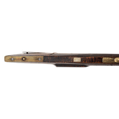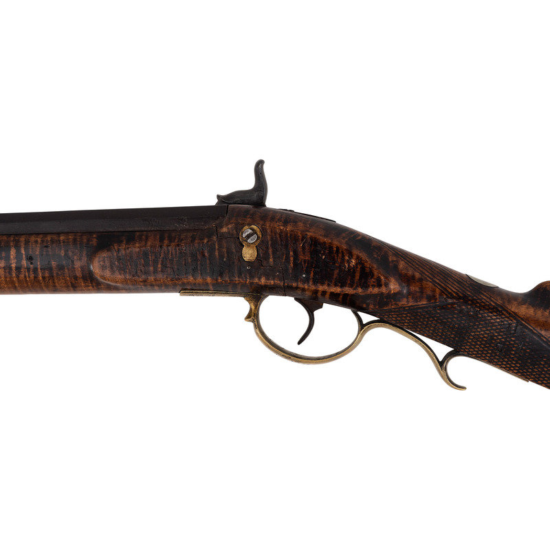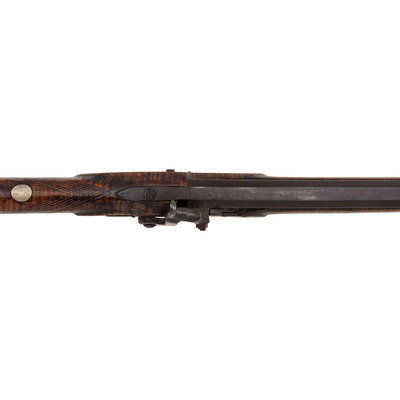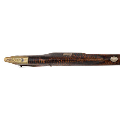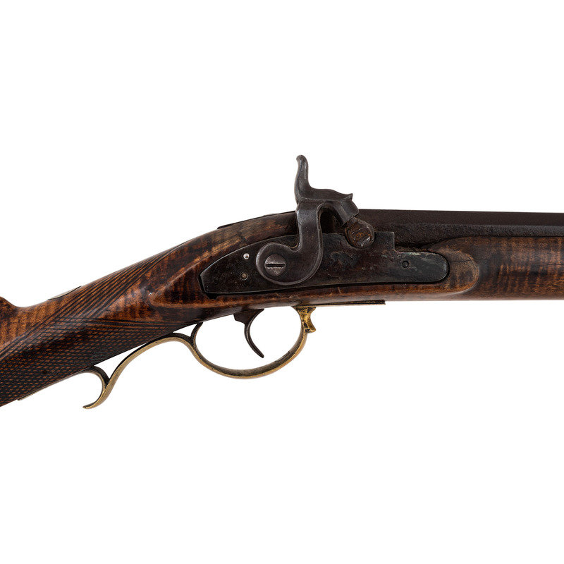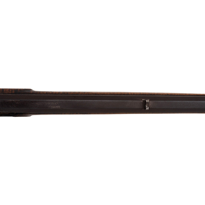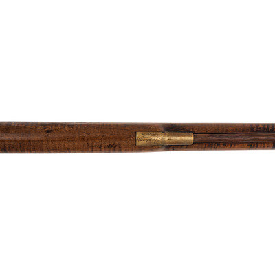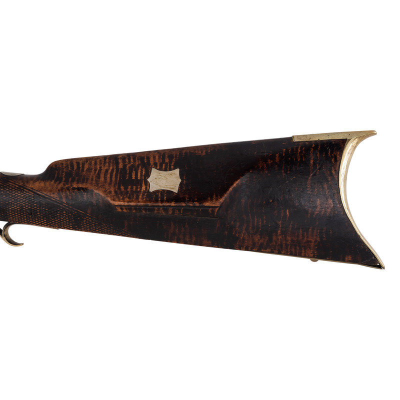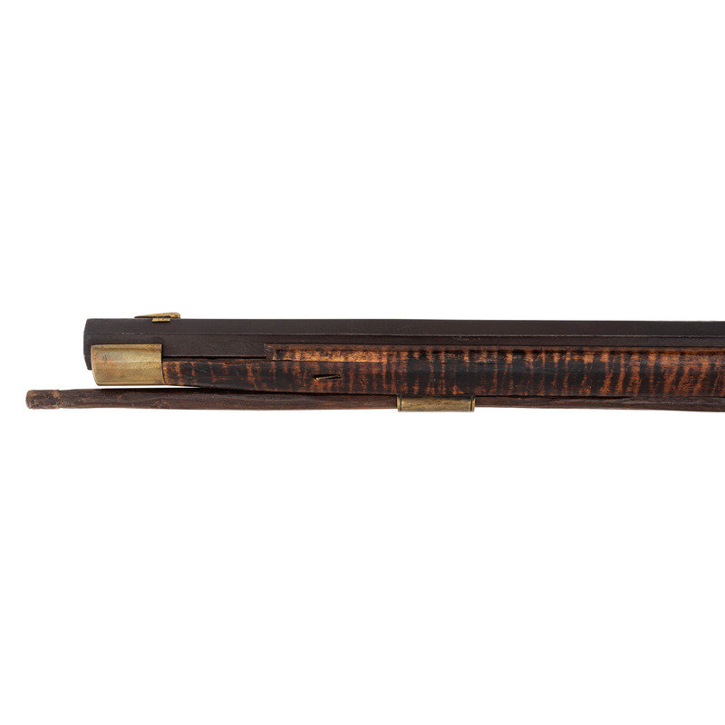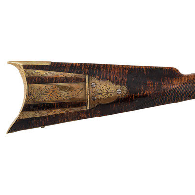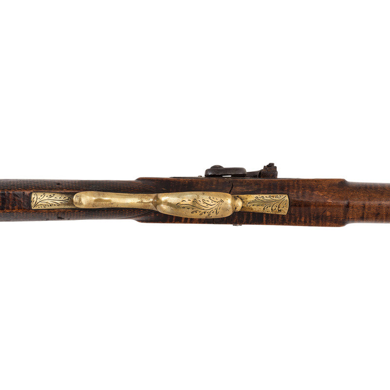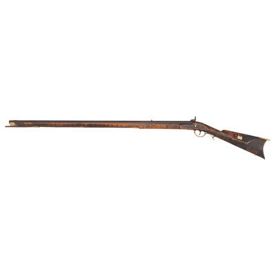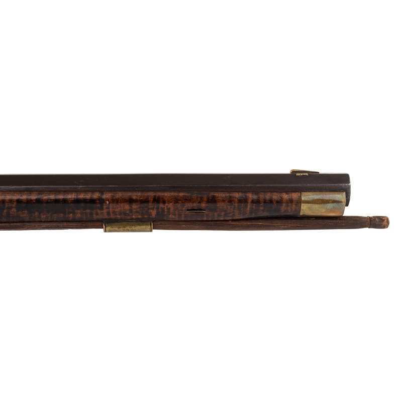 .50 caliber. 38.25" wedge retained octagonal barrel. SN: NSN. Browned finish, brass furniture, full-length faux striped hardwood stock with checkered wrist and raised cheek rest. Single screw commercial percussion lock is lightly engraved and unmarked. Barrel with drum bolster is weakly marked "A GIBBS" and "LANCASTER". Lightly engraved Lancaster style four-piece brass patchbox, with release in toe plate, crescent buttplate, extended finger spur triggerguard. Dovetailed notch rear sight, dovetailed brass blade front sight. Simple brass pipes secure an old wood ramrod. Three small, plain German silver escutcheon plates are set into the toe line of the stock, the wrist and the cheek piece. Abraham Gibbs is listed as a gunmaker in Lancaster, PA during the mid-19th century.