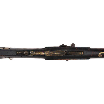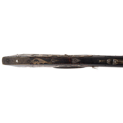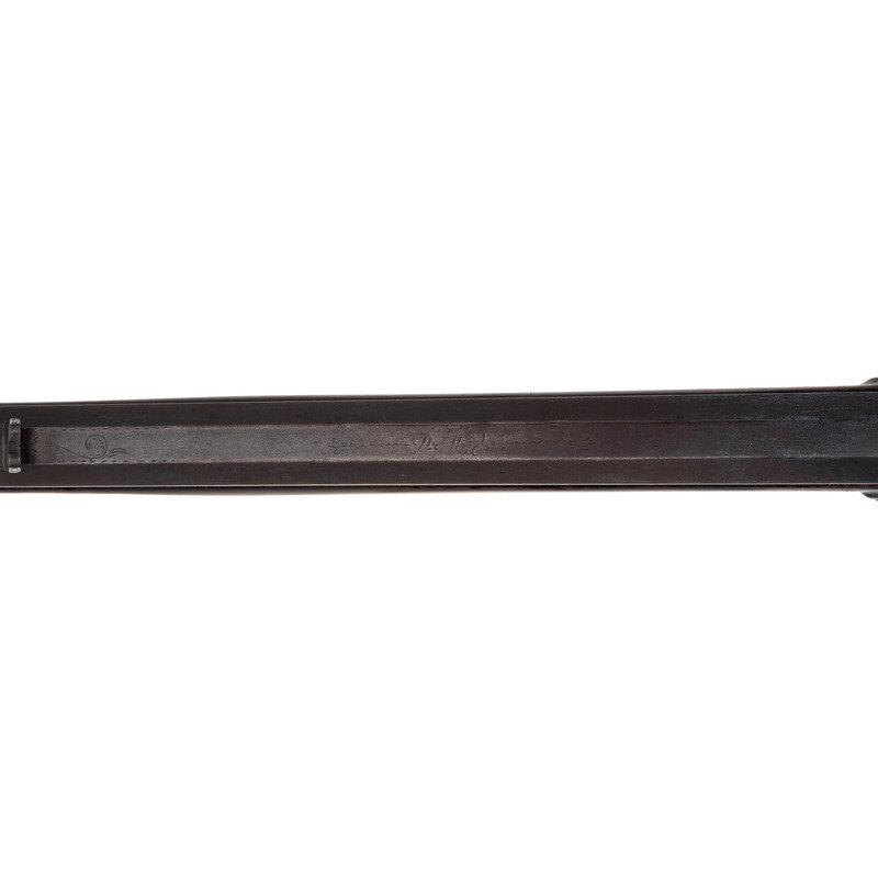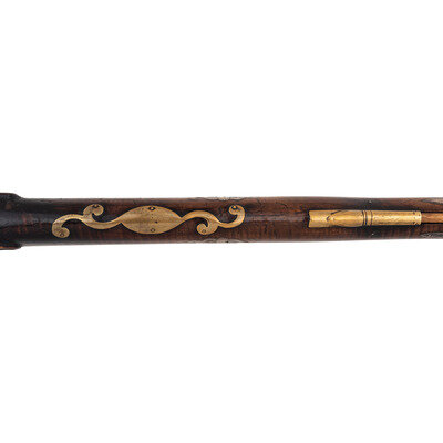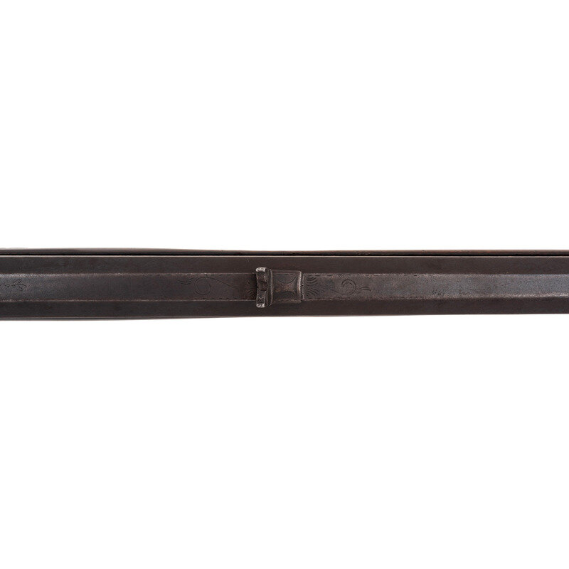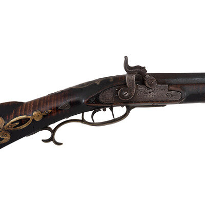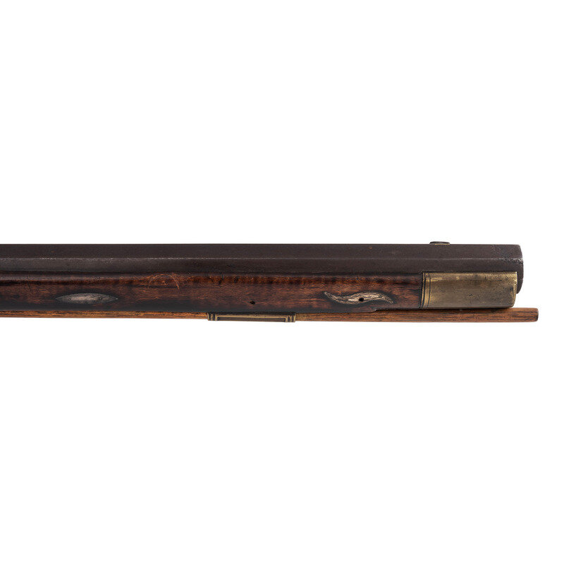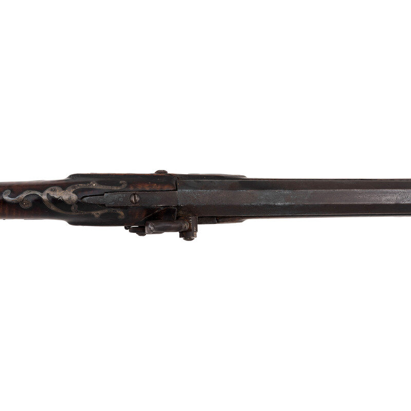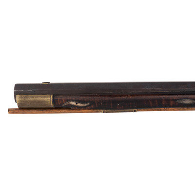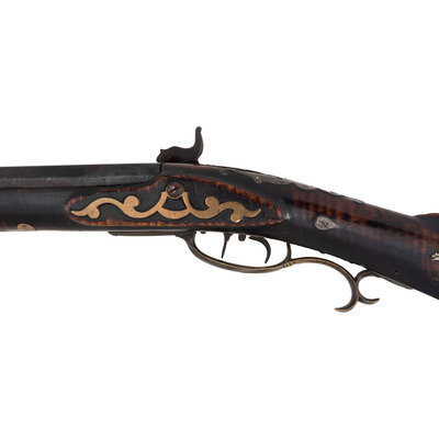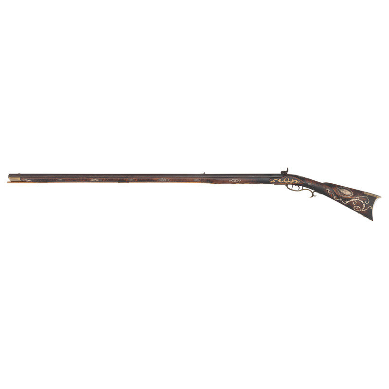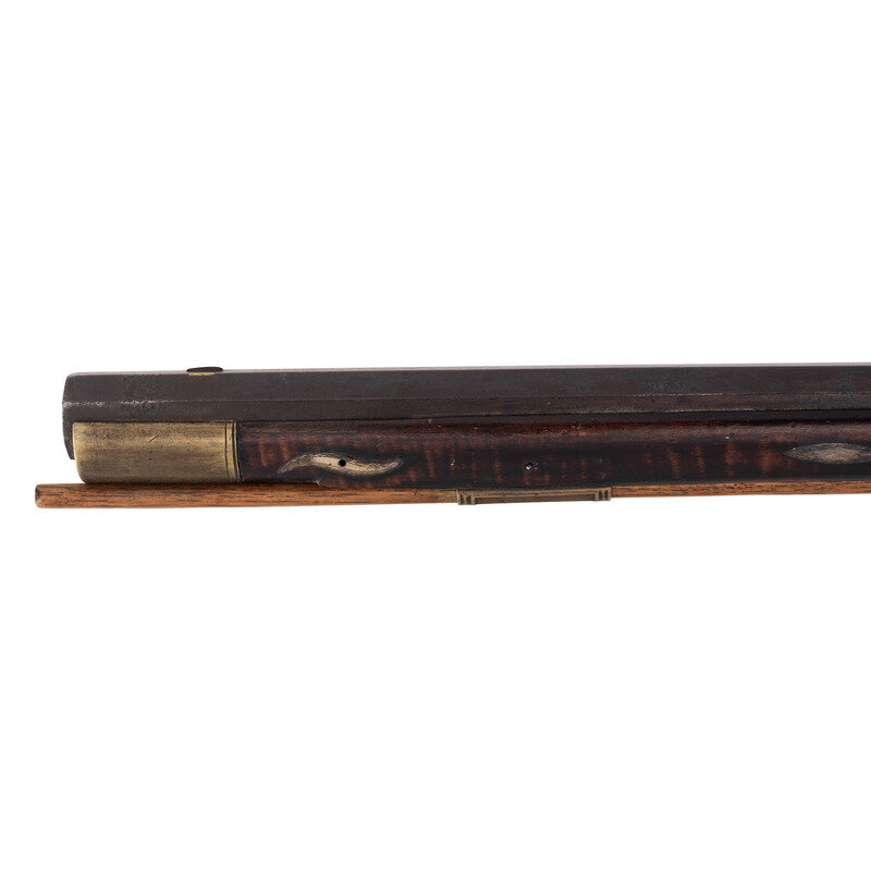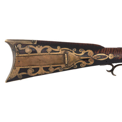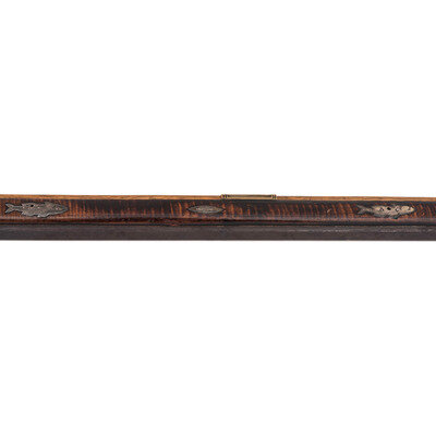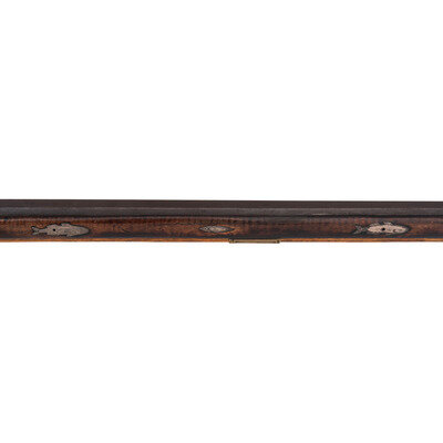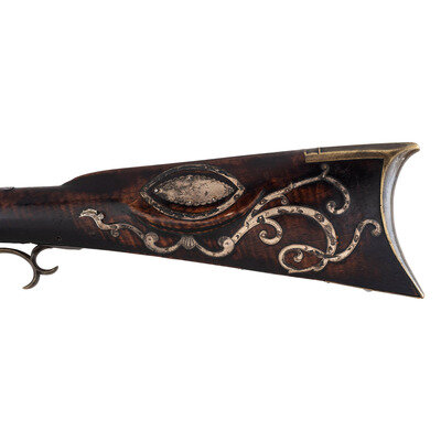 .42 caliber. 45.25" pinned octagonal barrel. SN: NSN. Browned finish, brass furniture, German silver inlays, full-length stockwtih raised cheek rest. Commercial single-screw percussion lock is a likely replacement and is marked "WABSCHE/DE/PADA" in three lines under the drum bolster. Barrel signed with illegible script initials. Lock with adjustable double set triggers, barrel with dovetailed fixed rear sight and dovetail German silver front sight blade in a brass base. Rifle mounted with a beautifully executed open-work four-piece brass patch box with the release in the toe plate. Other brass furniture includes a crescent buttplate with faceted tang, finger extension triggerguard, open work foliate finial toe plate, scroll saddle plate, open work side plate and brass nose cap. Stock decorated with 21 German silver inlays, including fish and leaf decorative coverings over pins in the forend, a heart along the toe line, a Y-shaped vine motif scroll around the tang to simulate an apron, swirling vines below the cheek rest, leaf motifs on the cheek rest tear drops at the wrist. Brass pipes secure a wood ramrod. A really lovely longrifle.