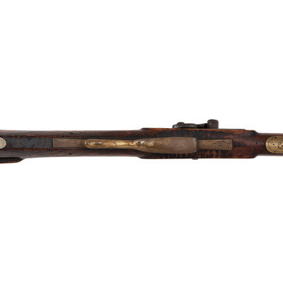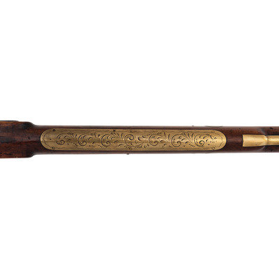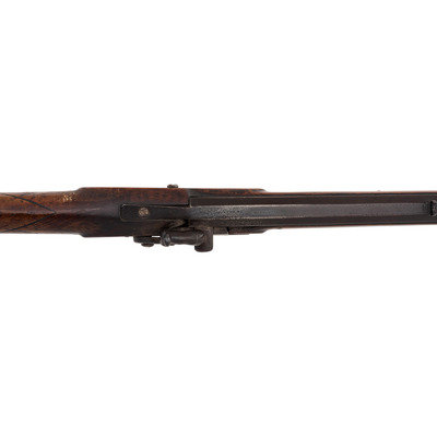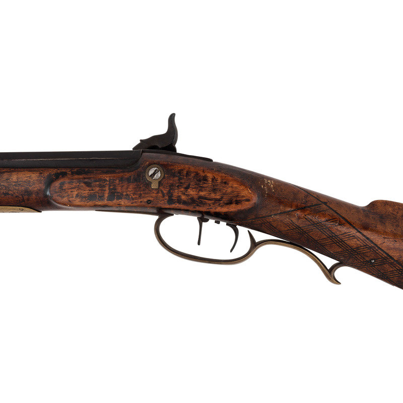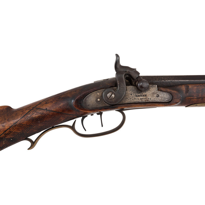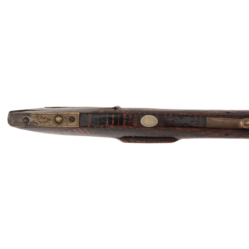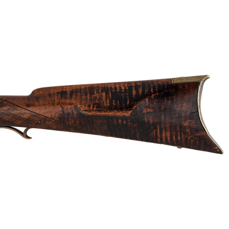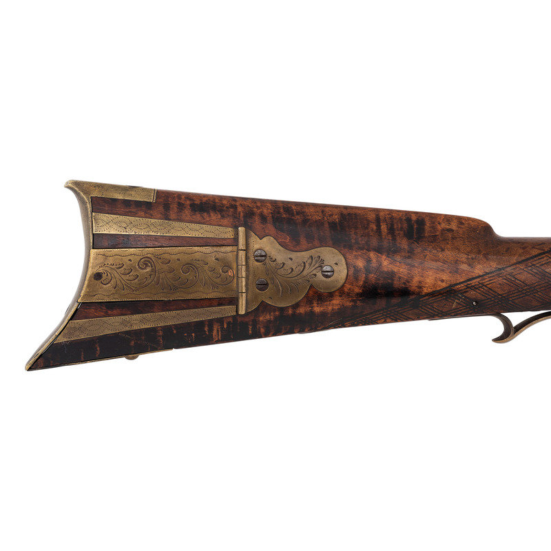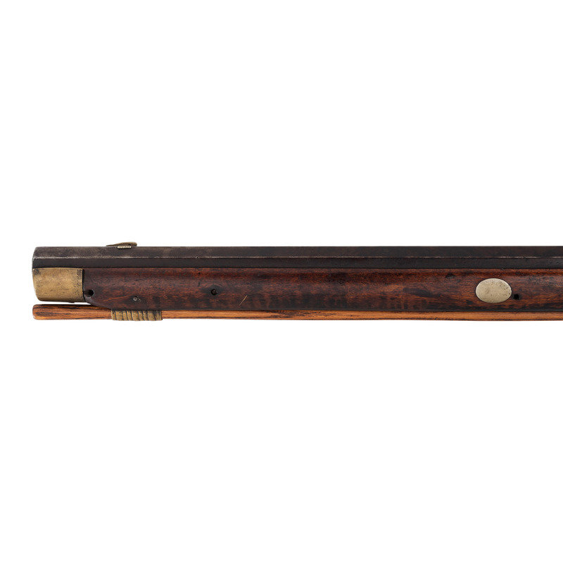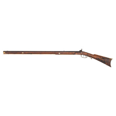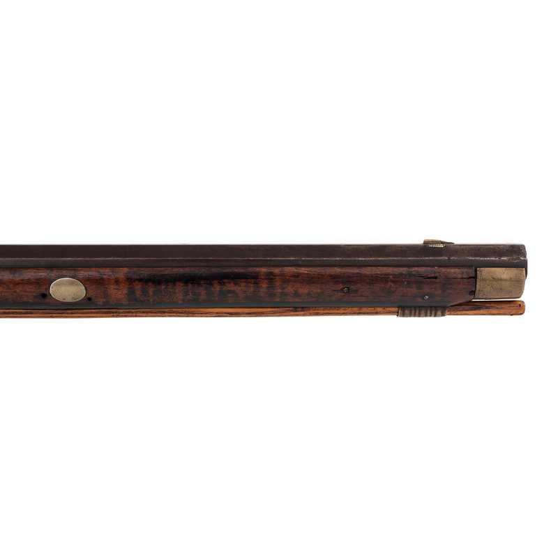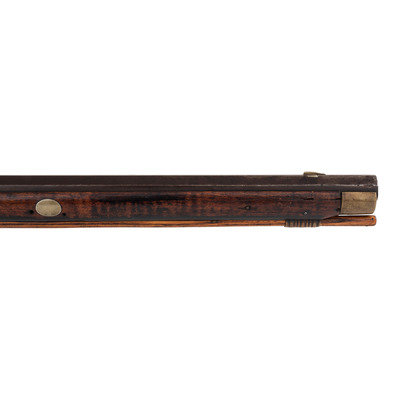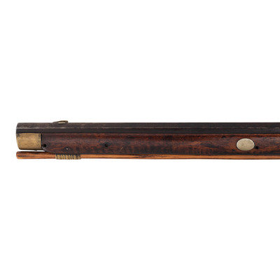 .36 caliber. 35.875" pinned octagonal barrel. SN: NSN. Browned finish, brass furniture, full-length stock with checkered wrist and raised cheek rest. Single screw percussion lock is ill-fitting and marked LEAMAN/LANCASTER, PA. Barrel with drum bolster and very weak "LEMAN" marking and marked "WARRANTED". Lock with double-set triggers. Rifle mounted with brass fittings that include a traditional four-piece Lancaster style patchbox which is lightly engraved, an engraved toe plate that operates as the door release, a crescent butt plate, an engraved saddle plate that matched the patchbox and toe plate, a plain nose cap, two corrugated thimbles and a plain entry pipe. German silver escutcheons are mounted on the forend and along the toe line of the stock.