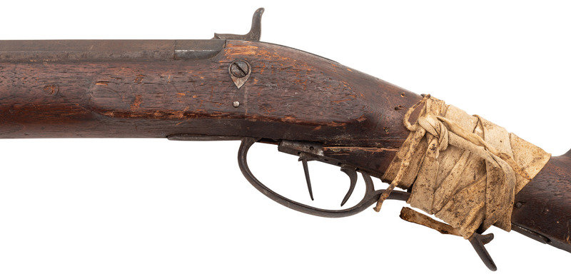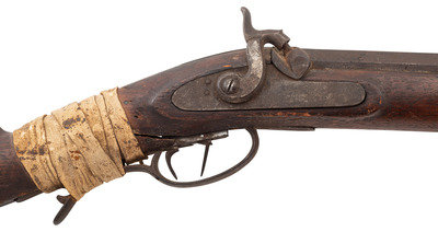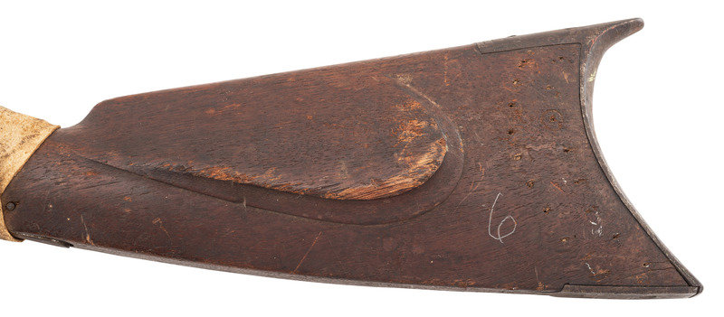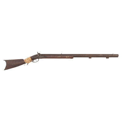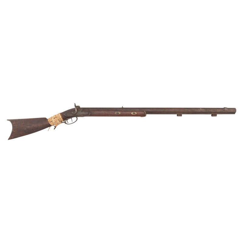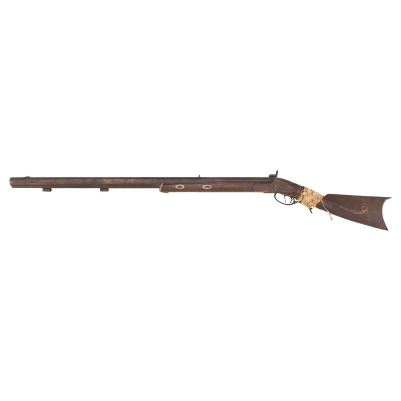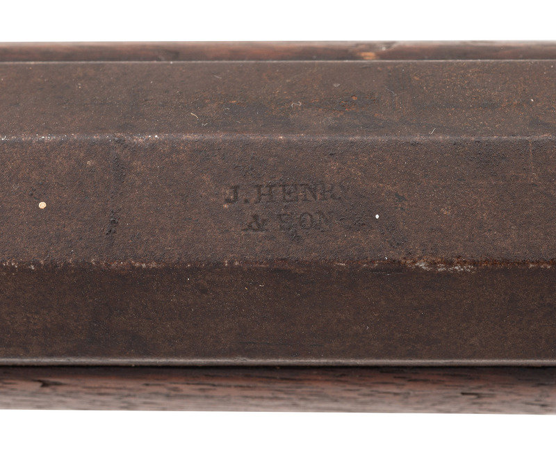 .54 caliber. 34.5" heavy octagon barrel secured by two wedges. SN: NSN. Browned finish, iron and brass furniture, double-keyed half-stock with raised cheek rest. A prototypical "Plains Rifle" in the style of the Hawkens and other St. Louis makers. Percussion lock is marked "J HENRY/& SON" and is equipped with double set triggers. Barrel is also marked in two lines with the same die. Heavy barrel measures 1.1" across the flats at the muzzle and is equipped with a half-length lug underneath. Dovetailed fixed-notch rear sight, dovetailed brass Rocky Mountain front sight blade. Iron buttplate and toe plate, iron triggerugard with finger extension, brass wedge escutcheons. Stock broken completely through the wrist and poorly secured with a very old rawhide wrap identified as buffalo hide in Mr. Ness' notes. Numerous tack holes are present around the periphery of the buttplate, with the tacks now missing. Mr Ness' notes further comment that he acquired the gun from the late Paul Weisburg in 2009, Paul had purchased it when at the CGCA Show in Denver in 2008 when it walked in. Additional notes mention that the consignor considers this the rarest of his Indian rifles and says that it is much rarer than a Hawken. For a nearly identical example see page 245 of Volume II of Great Gunmakers for the Early West by Jim Gordon. Void of ramrod, but a small piece of period red wool trade cloth is rolled up in the upper ramrod pipe.