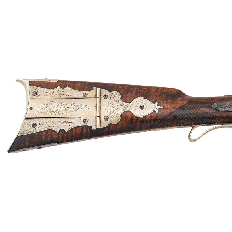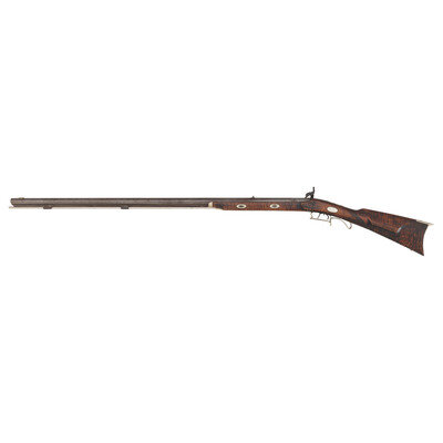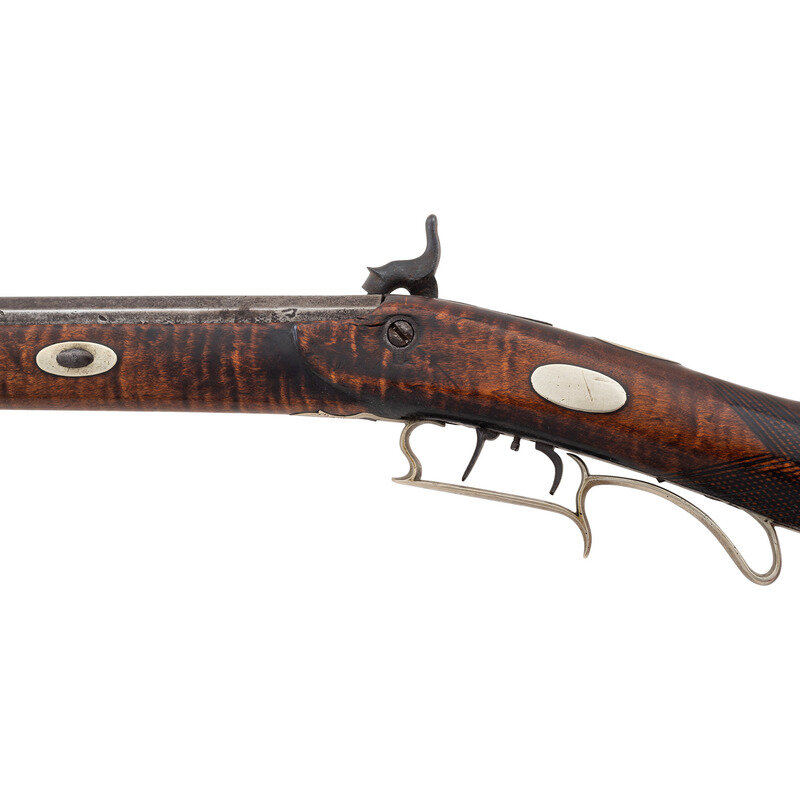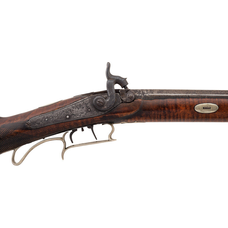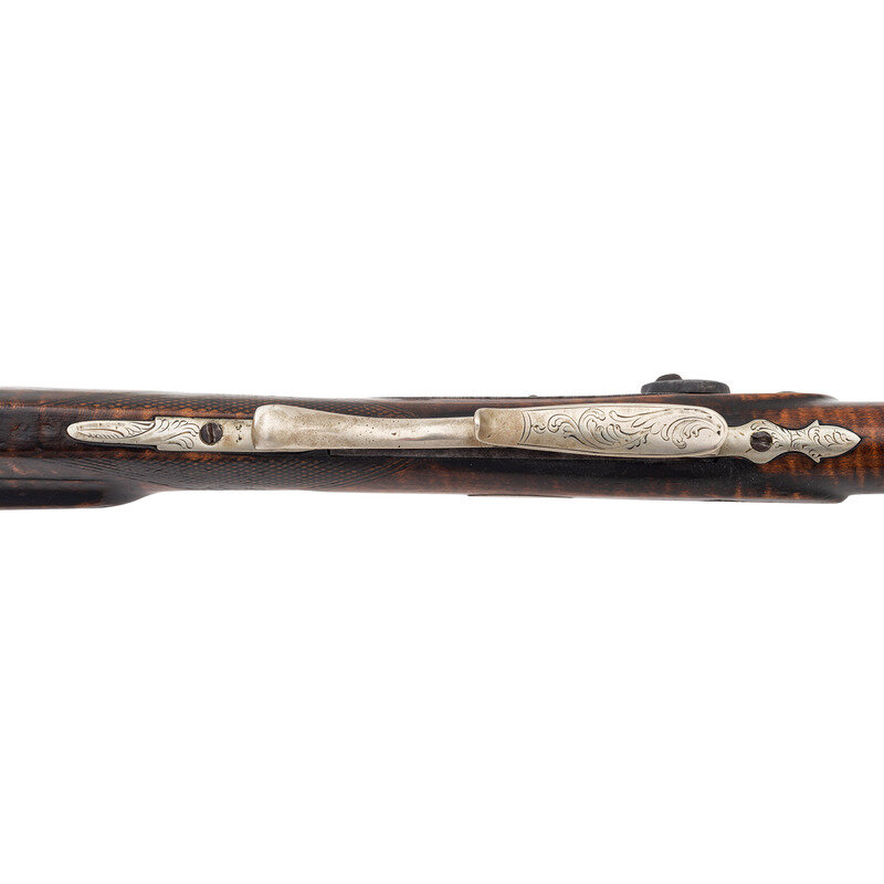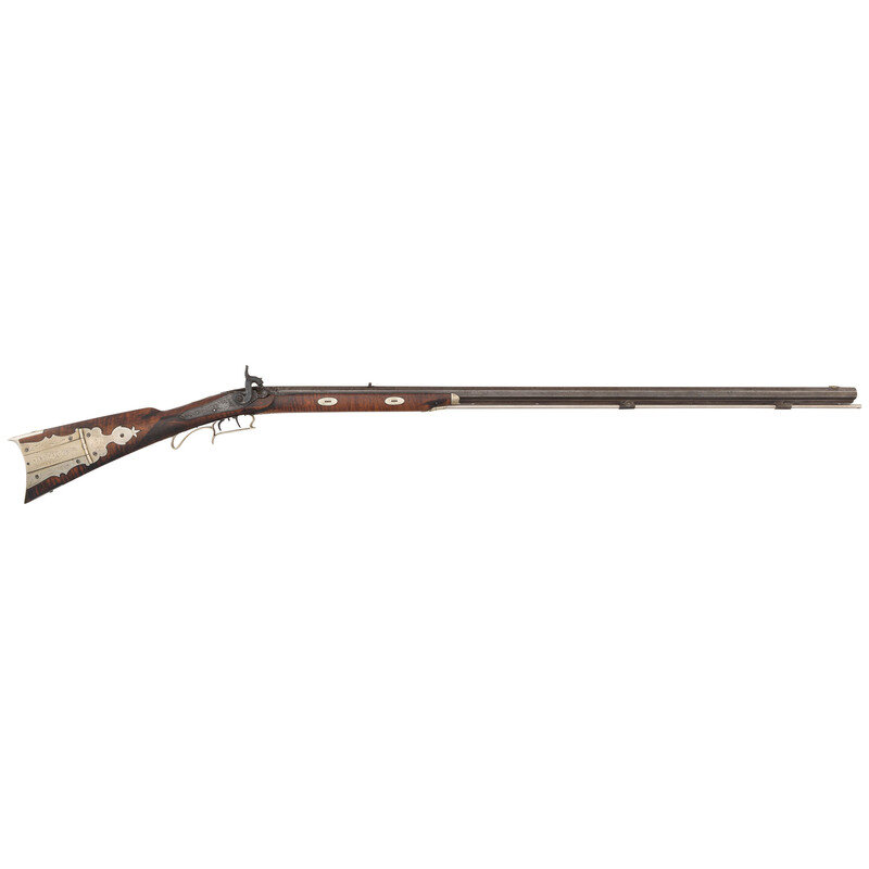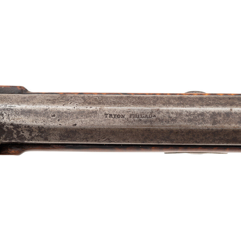 .35 caliber. 37.75" double key octagonal barrel with under rib. SN: NSN. Browned finish, German silver furniture, half-stock figured hardwood stock with checkered wrist. Barrel marked "TRYON PHILADA". Back action percussion lock lightly engraved and marked "H ELWELL". Double set triggers. Mounted with engraved German silver furniture including a four piece rudimentary pineapple finial patchbox, a flat bottom triggerguard with finger spur, buttplate, toe plate, entry pipe, nose cap, wedge escutcheons and two blank oval plates at the thumb plate and counterpane positions. Two steel ramrod pipes are attached to the bottom lug of the barrel, continuing a modern steel ramrod. Dovetailed fixed rear sight and dovetailed German silver front sight blade. The name H. ELWELL is that of an unidentified lock maker, but his locks do appear on a variety of mid-19th century rifles. Tryon was one of the leading Philadelphia gunmakers during the mid-19th century and produced everything from contract military arms to high grade sporting arms. This was a relatively high grade gun when new and is a very attractive half stock percussion rifle with very nice German silver furniture.