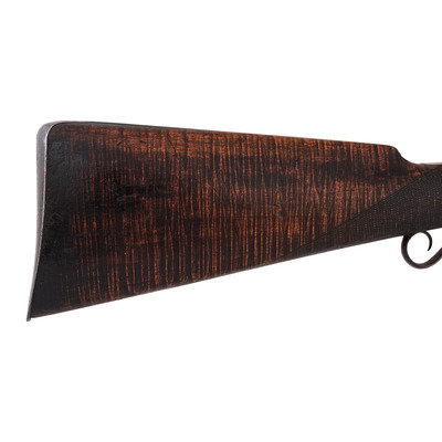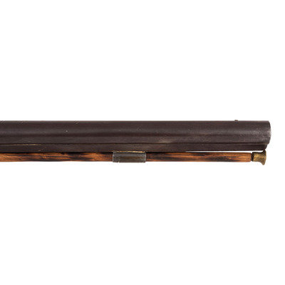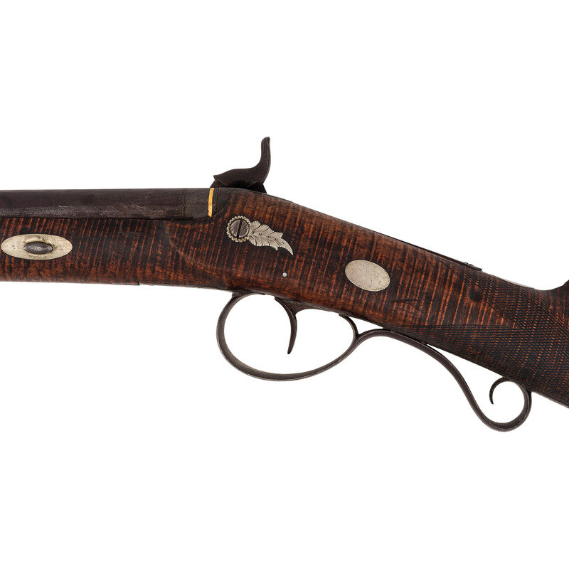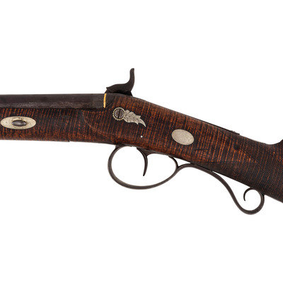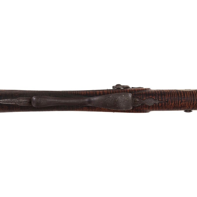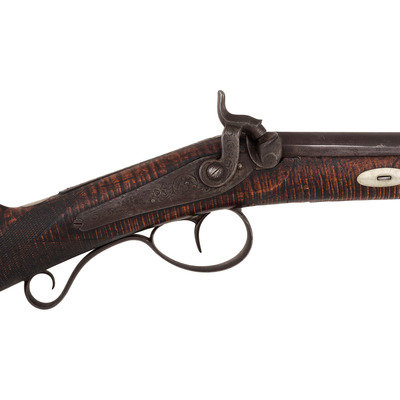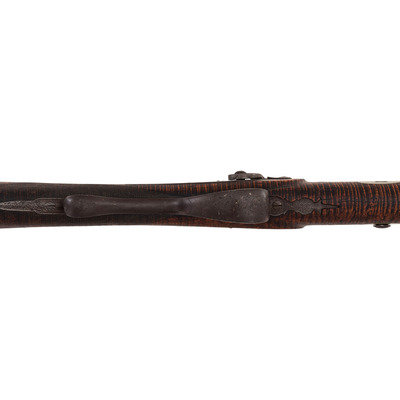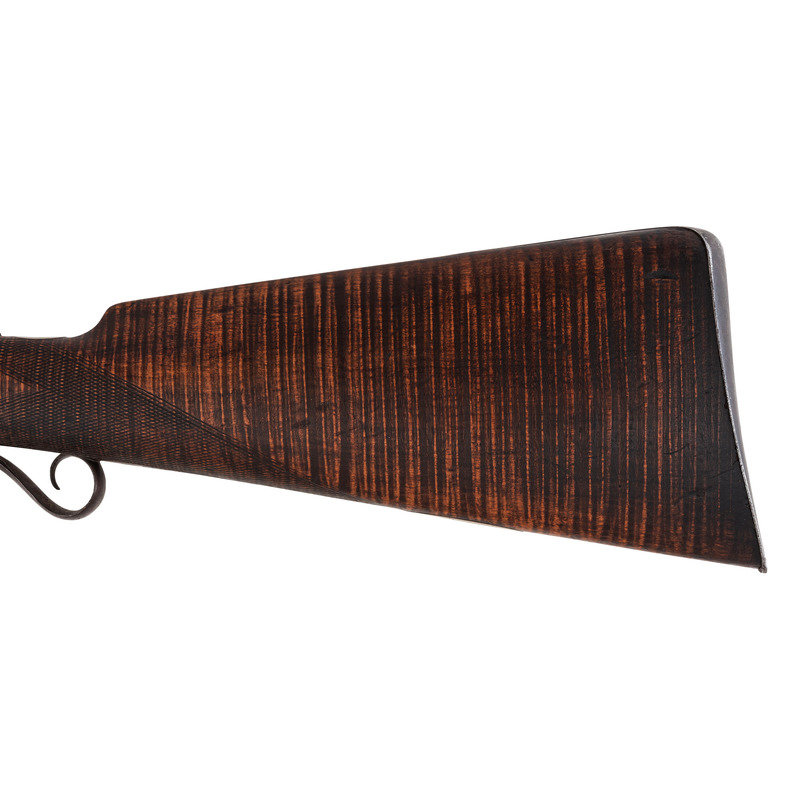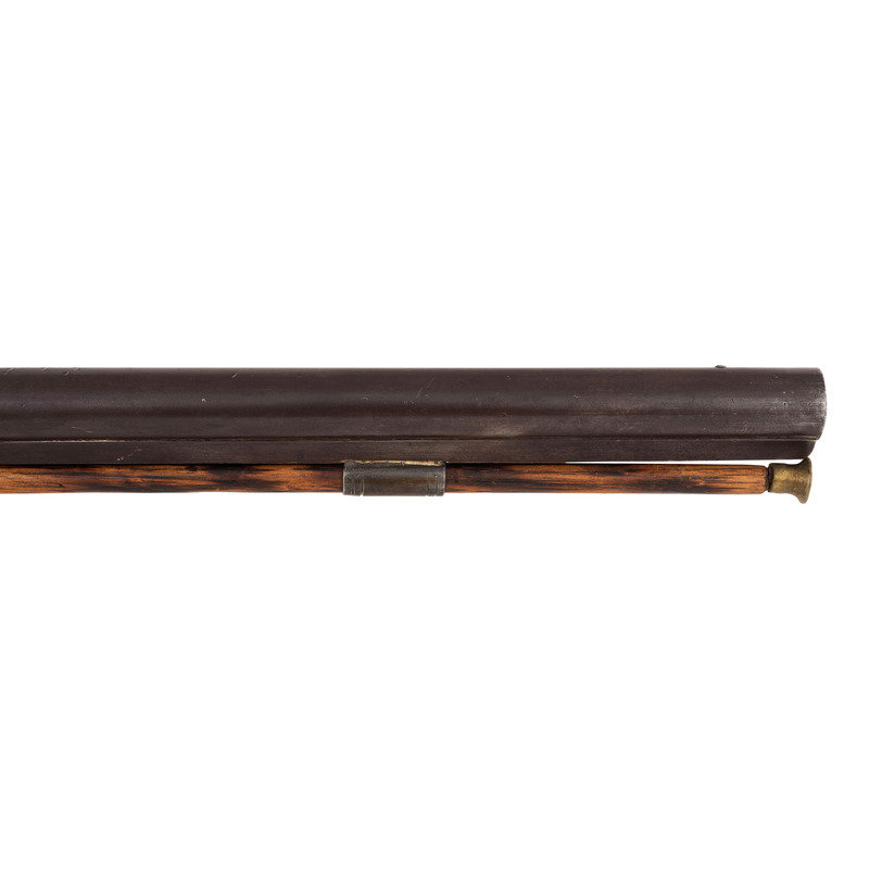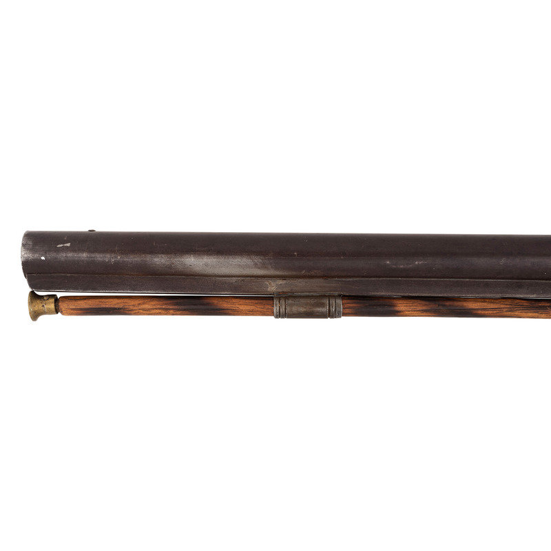 .68 caliber. 32" double keyed octagon to round barrel with under lug. SN: NSN. Browned finish, German silver mountings, steel furniture, faux striped hardwood half-stock with shotgun butt. Top of barrel marked "TRYON PHILADA". Back action percussion lock engraved with tight foliate scrolls and is marked by the maker "R ASHMORE & SON". A high grade percussion fowler by Tryon with a gold band at the breech, as well as delicate scroll engraving on the breech and breech plug tang. The iron buttplate tang and triggerguard with pineapple finial are engraved en-suite. Barrel secured by two keys with German silver escutcheons. Other German silver fittings include the nose cap, entry pipe, engraved leaf motif lock screw finial and a plain oval escutcheon in the counterpane. Includes a brass tipped wooden ramrod. A really lovely, high grade fowler from one of the more famous and prolific Philadelphia gunmakers of the mid-19th century.
