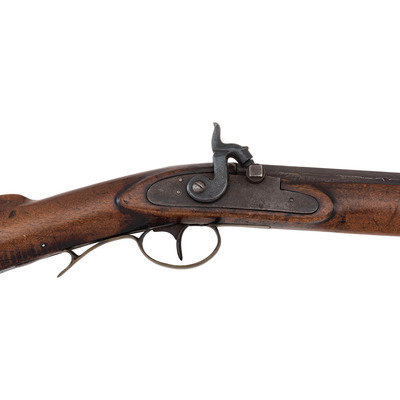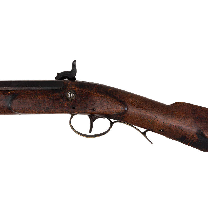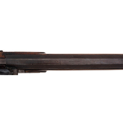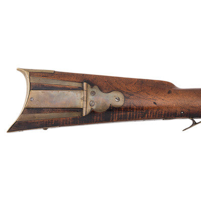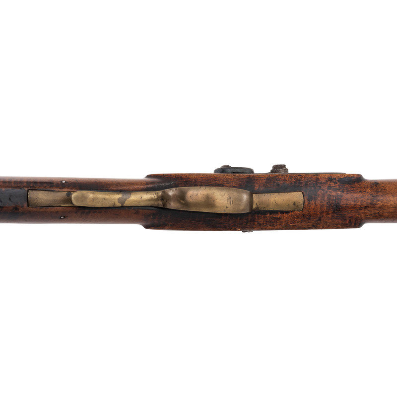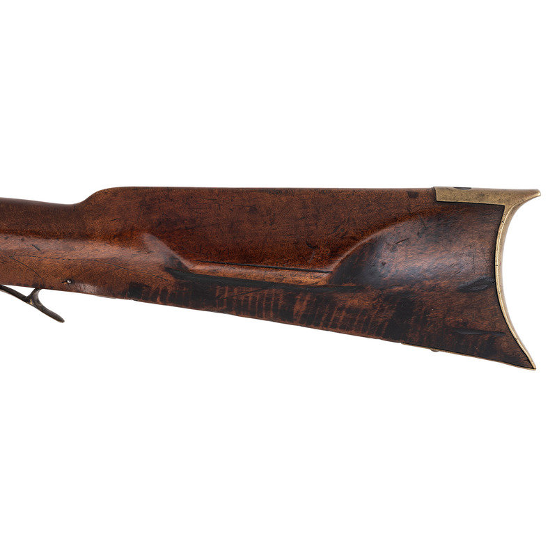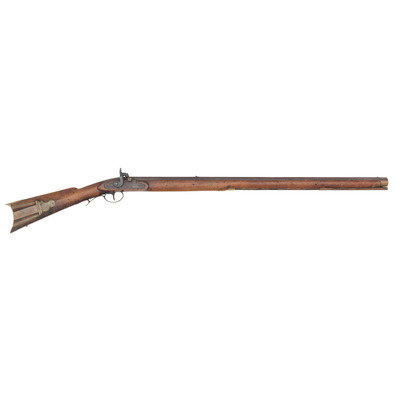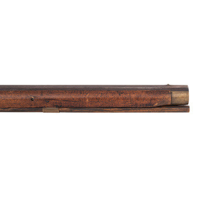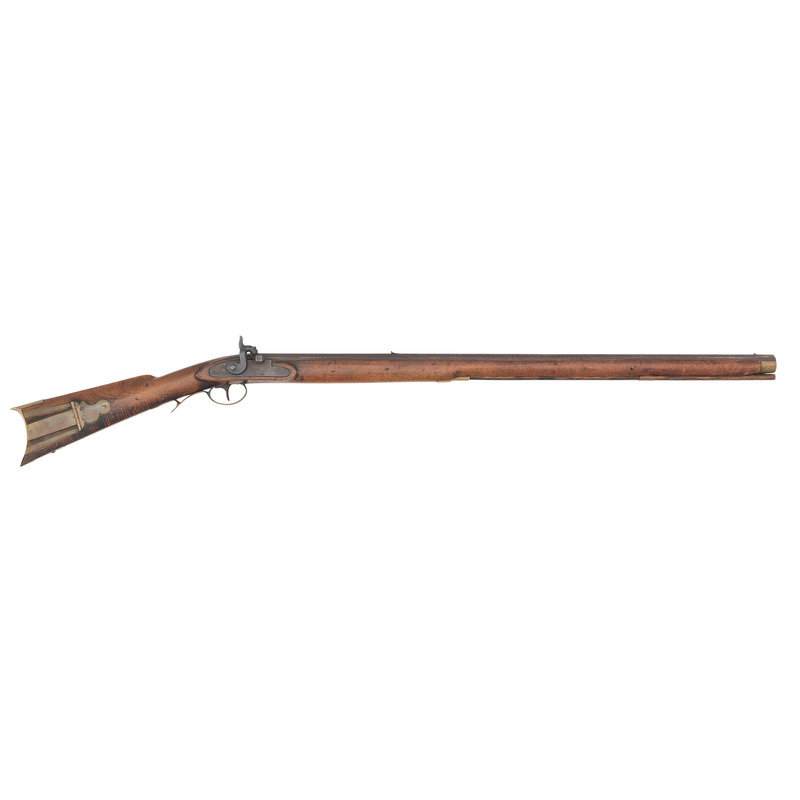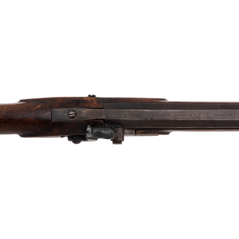 .54 caliber. 33.25" pinned octagonal barrel. SN: NSN. Browned finish, brass furniture, full-length hardwood stock with raised cheek rest. Single screw percussion lock marked "LEMAN/LANCASTER". Heavy barrel measures 1" across the flats at the muzzle, has a drum bolster and is marked "H.E. LEMAN LANCASTER PA" and "WARRANTED" on the top. Lancaster-style plain four-piece brass patchbox with release in toe plate, plain finger-extension brass triggerguard, plain brass buttplate, nose cap and thimble and entry pipe with a wood ramrod. Fixed notch rear sight, modified dovetailed front sight blade.