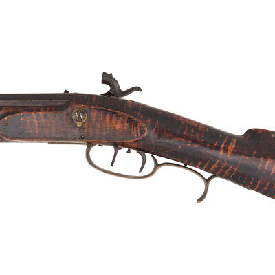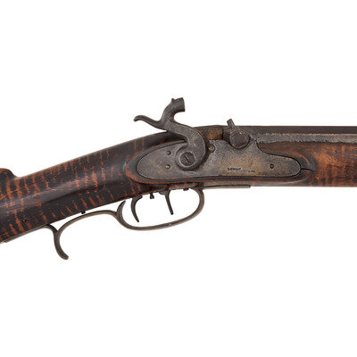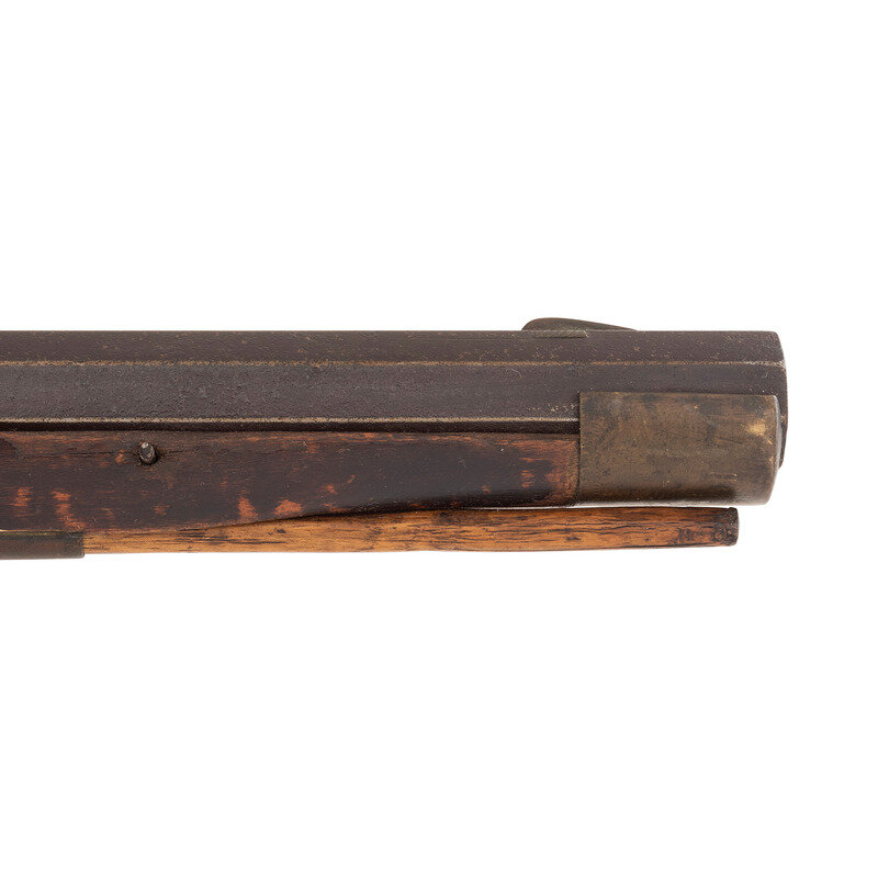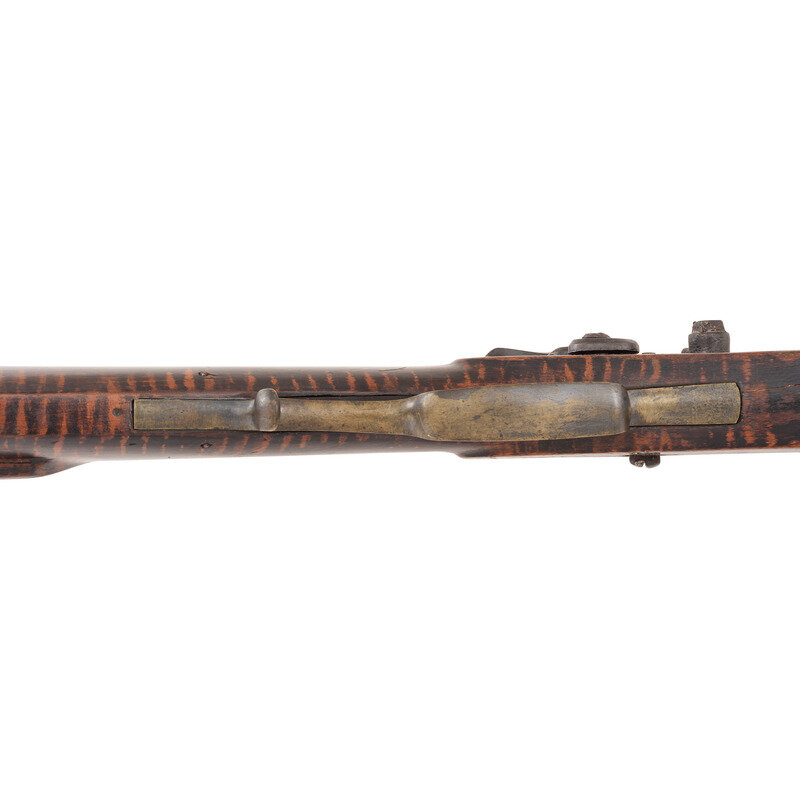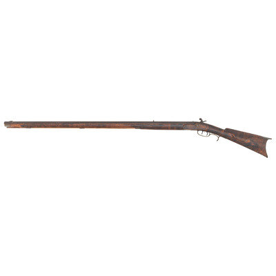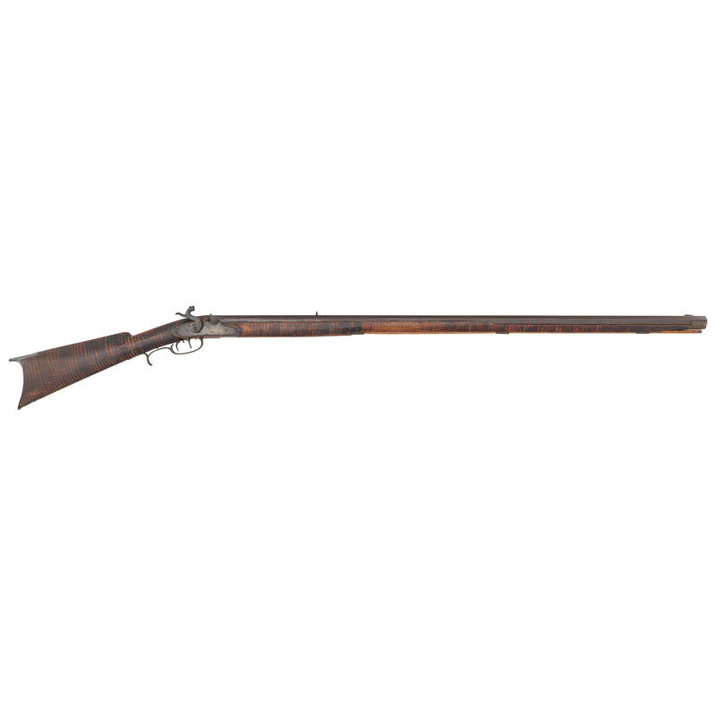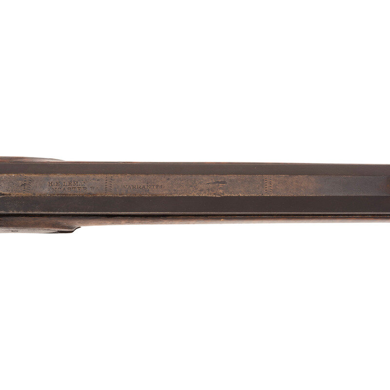 .34 caliber. 39" pinned octagonal barrel. SN: NSN. Browned finish, brass furniture, faux striped hardwood stock with raised cheek rest. Lightly engraved single screw percussion lock marked "LEMAN/LANCTR PA". Top flat of barrel marked "HE LEMAN/LANCASTER PA" and "WARRANTED". Adjustable double set triggers, dovetailed fixed notch rear sight, dovetailed Rocky Mountain brass blade front sight. Brass furniture includes crescent buttplate, plain toe plate, finger spur triggerguard, nose cap and ramrod pipes. Includes a wood ramrod.