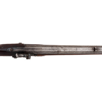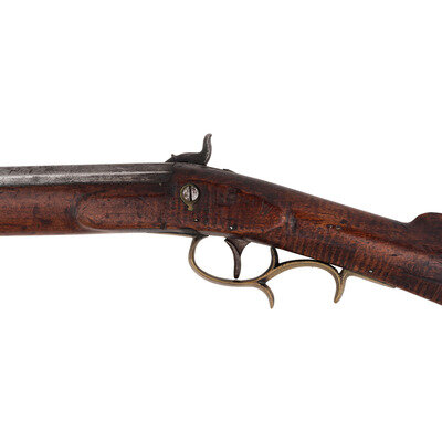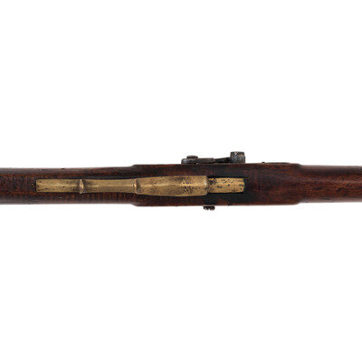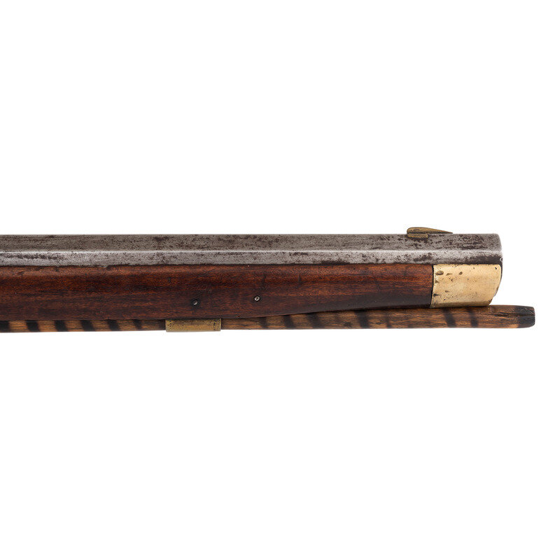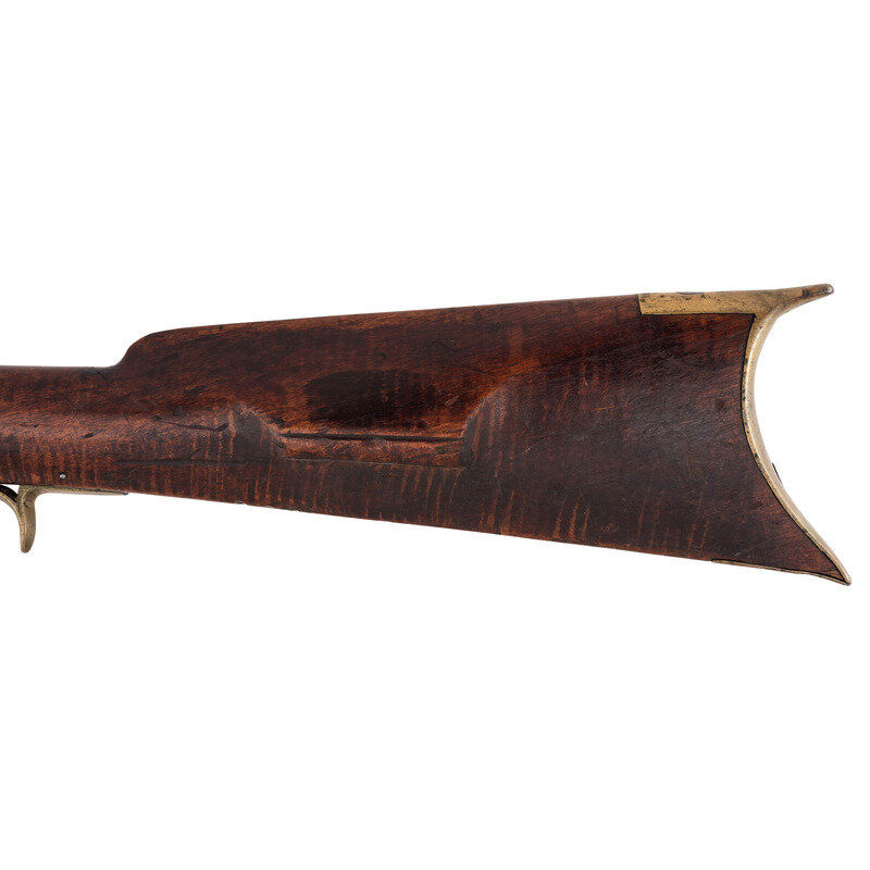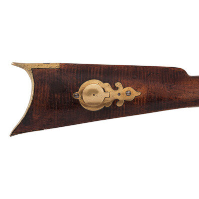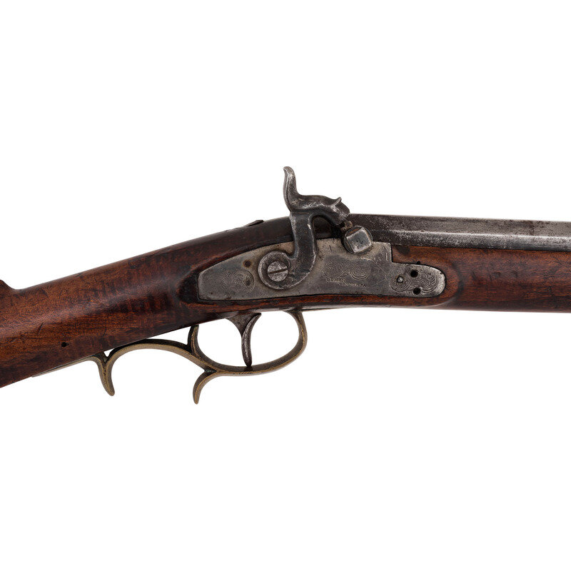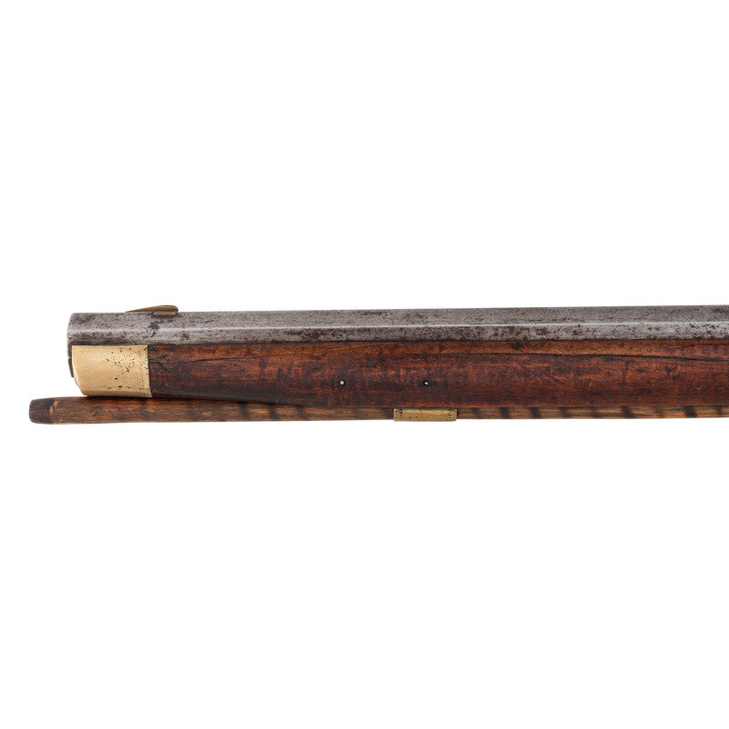 .54 caliber. 35" pinned octagonal barrel. SN: NSN. Bright finish, brass furniture, full-length hardwood stock with raised cheek rest. Lightly engraved single-screw percussion lock marked "LEMAN/LANCTR PA". Barrel with drum bolster marked on the top flat "H.E. LEMAN/LANCASTER, PA" and "WARRANTED". Barrel with dovetailed semi-buckhorn rear sight and dovetailed brass front sight blade. Rifle mounted with simple commercial brass furniture including a round patchbox, a double spur extended triggerguard, crescent buttplate and toe plate. Simple brass pipes secured a nicely striped wood ramrod.