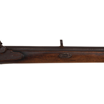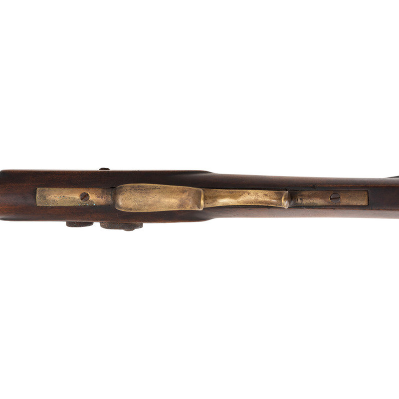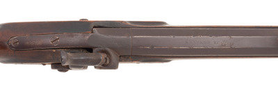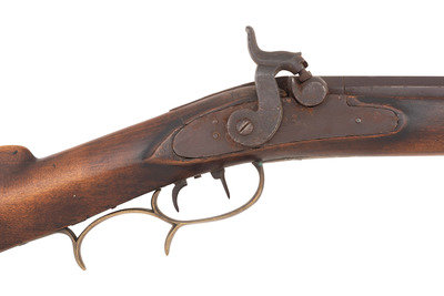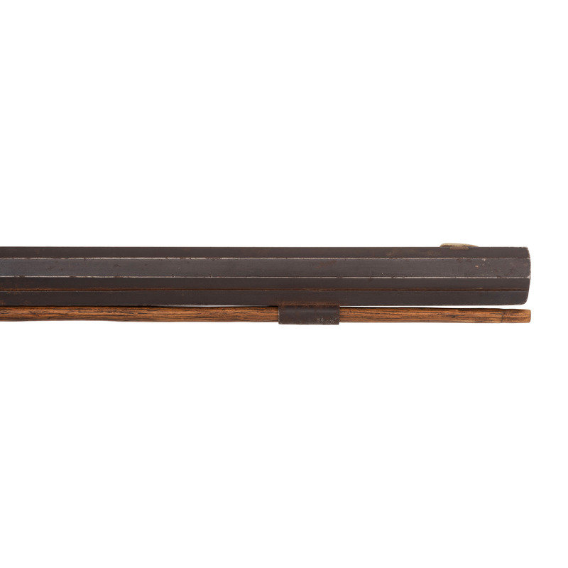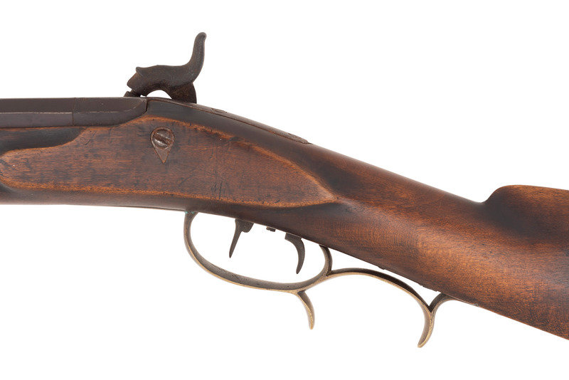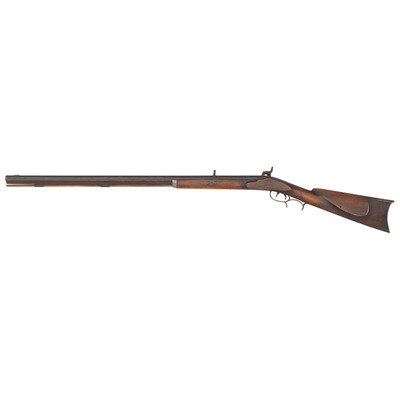 No name is more synonymous with the rifles of the great plains and pre-Civil War western expansion than that of Hawken. Jacob Hawken moved to St. Louis from Hagerstown Maryland in 1818 and was followed by his younger brother Samuel in 1822. Jacob had learned the trade of gun making from his father Christian and also spent time working at the US Arsenal at Harpers Ferry. Initially the Hawken brothers appear to have focused more on traditional gunsmithing and repairs in St. Louis than firearms manufacturing. The earliest guns they produced would have certainly been flintlocks with percussion guns not becoming typical until the early 1830s. Early St. Louis Hawken-marked percussion rifles were brass mounted full-stock guns that followed the general form of the Pennsylvania type rifles they would have produced in Hagerstown. Subsequently the brothers introduced the prototypical "Plains Rifle", also referred at times as the "Rocky Mountain" rifle. These were typically very sturdy iron mounted large bore percussion rifles with double-set triggers that ranged from .52 to .60 caliber. They utilized heavy octagonal barrels that were typically 30" to 40" in length, normally measured at least 1.125" across the flats, were usually rifled with seven grooves and were often retained by two iron keys. The guns regularly utilized commercial locks marked by their makers or retailers. Fixed sights of the buckhorn rear and Rocky Mountain blade front were typical as well. These rifles were so perfectly adapted to the life of the mid-19th century plains hunter and mountain man that their popularity inspired a number of local gunmakers to offer guns of the same general pattern. Variations of the Hawken theme were produced by such famous St. Louis makers as Albright, Beauvais, Dimick and Gemmer. Despite the popularity of the Hawken "Plains Rifle" the firm also produced light sporting rifles like this example. They were usually smaller caliber, single key guns fitted with commercially available brass furniture and often featured Goulcher locks.