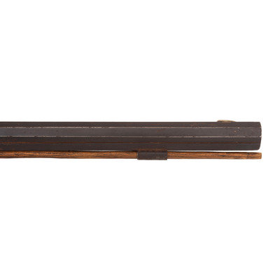 .34 caliber. 32.25" octagonal barrel secured by a single wedge. SN: NSN. Browned finish, brass, iron and pewter fittings, hardwood half-stock. Prototypical "Light Sporting" Hawken rifle with the barrel only .9" across the flats at the muzzle. Barrel marked "S. HAWKEN ST. LOUIS". Plain, single screw percussion lock is unmarked and equipped with double set triggers. Patent breech with double screw tang, dovetailed buckhorn rear sight, dovetailed German silver blade front sight. Brass butt and toe plates and double finger spur triggerguard. Pewter nose cap. Wood ramrod secured with two iron pipes.