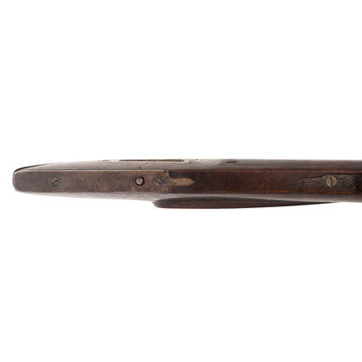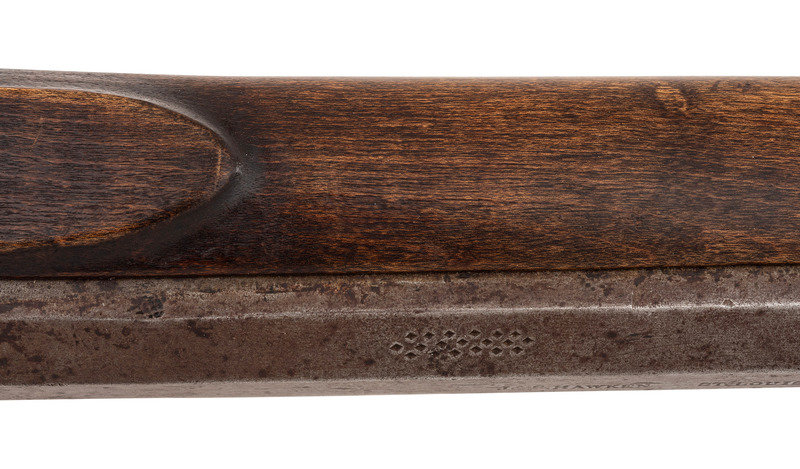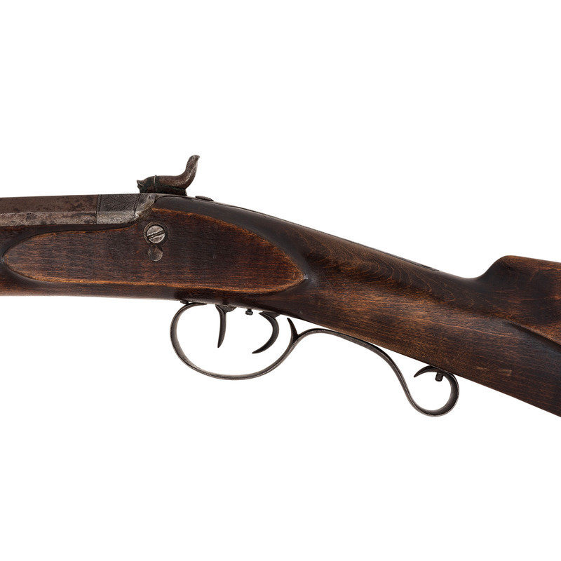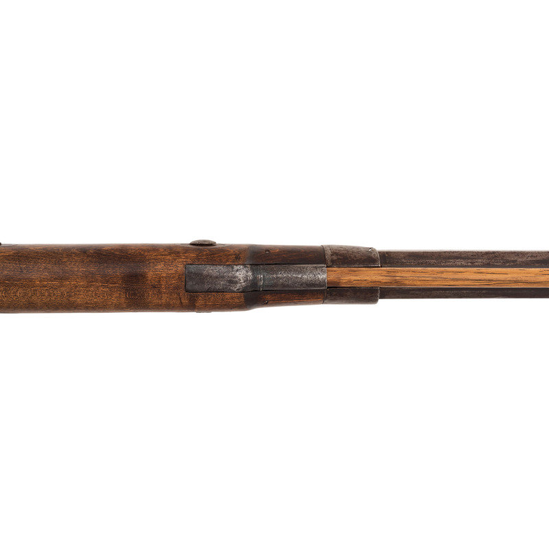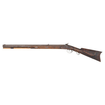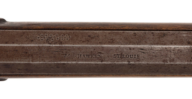 No name is more synonymous with the rifles of the great plains and pre-Civil War western expansion than that of Hawken. Jacob Hawken moved to St. Louis from Hagerstown Maryland in 1818 and was followed by his younger brother Samuel in 1822. Jacob had learned the trade of gun making from his father Christian and also spent time working at the US Arsenal at Harpers Ferry. Initially the Hawken brothers appear to have focused more on traditional gunsmithing and repairs in St. Louis than firearms manufacturing. The earliest guns they produced would have certainly been flintlocks with percussion guns not becoming typical until the early 1830s. Early St. Louis Hawken-marked percussion rifles were brass mounted full-stock guns that followed the general form of the Pennsylvania type rifles they would have produced in Hagerstown. Subsequently the brothers introduced the prototypical "Plains Rifle", also referred at times as the "Rocky Mountain" rifle. These were typically very sturdy iron mounted large bore percussion rifles with double-set triggers that ranged from .52 to .60 caliber. They utilized heavy octagonal barrels that were typically 30" to 40" in length, normally measured at least 1.125" across the flats, were usually rifled with seven grooves and were often retained by two iron keys. The guns regularly utilized commercial locks marked by their makers or retailers. Fixed sights of the buckhorn rear and Rocky Mountain blade front were typical as well. These rifles were so perfectly adapted to the life of the mid-19th century plains hunter and mountain man that their popularity inspired a number of local gunmakers to offer guns of the same general pattern. Variations of the Hawken theme were produced by such famous St. Louis makers as Albright, Beauvais, Dimick and Gemmer.
