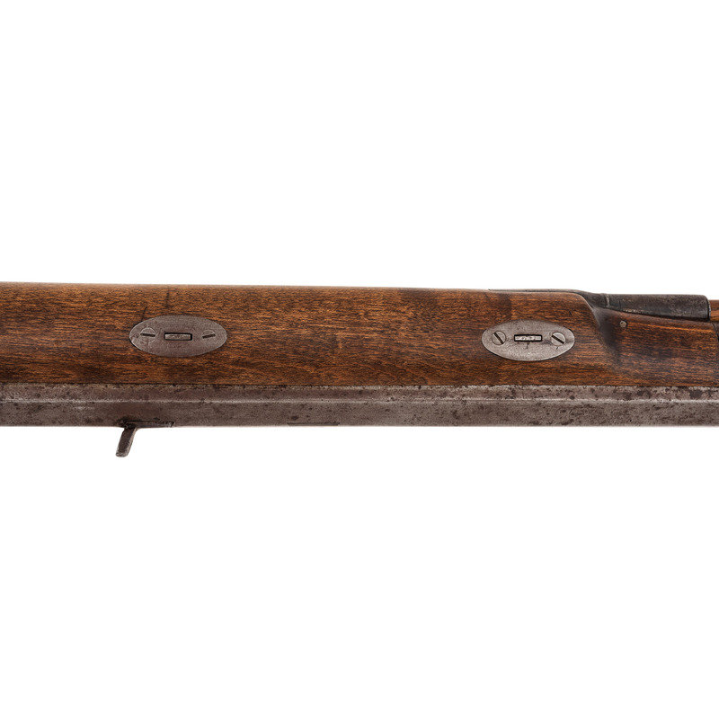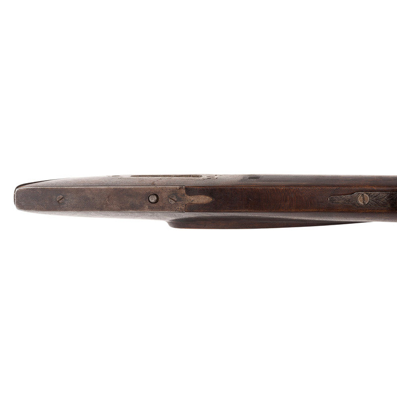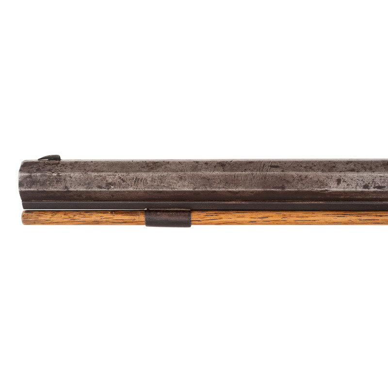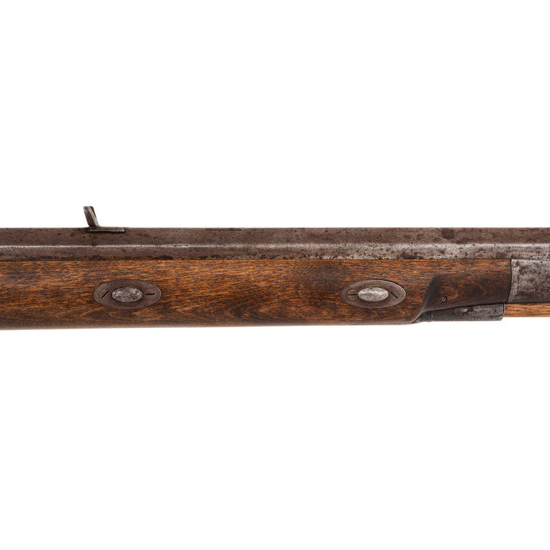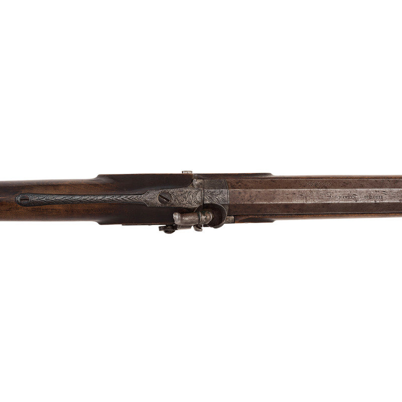 .56 caliber. 27.5" wedge-retained octagonal barrel with full-length rib. SN: NSN. Bright finish, iron furniture, American hardwood stock. Top of barrel marked in a single line "J&S. HAWKEN ST. LOUIS" between the breech and the rear sight dovetail. Commercial percussion lock is lightly engraved and marked "WOLFE & BISHOP/WARRANTED" in two lines. Double set triggers. Long, 6" slender, elongated tear-drop shaped breech plug tang is lightly engraved with flowing foliate and feathery motifs. Traditional Hawken style iron furniture including engraved scroll triggerguard, butt plate, toe plate, nose cap, wedges and escutcheons. Rifle is additionally mounted with a rare Hawken iron patchbox with an oval, bottom hinged door and mirror frame style surround, all lightly engraved with simple foliate scrolls and motifs and a with a game scene on the door itself. Patchbox release is mounted in the toe plate. Barrel with dovetailed fixed buckhorn rear sight and dovetailed Rocky Mountain silver blade front sight in brass base. Wood ramrod retained by a single iron thimble and an entry pipe. Rifle appears to have been shortened during the period use with visible file marks on the face of the muzzle. Wedges relocated to within about 4" of each other. Mr. Ness' notes indicate that the rifle is restocked and the patchbox was engraved by Tristan Campbell. This rifle is pictured in plates 54 and 55 of Hawken Rifles, The Mountain Man's Choice by John D. Barid.