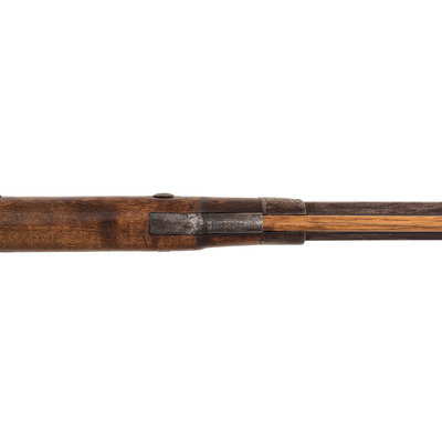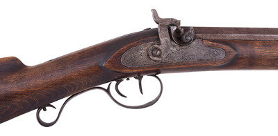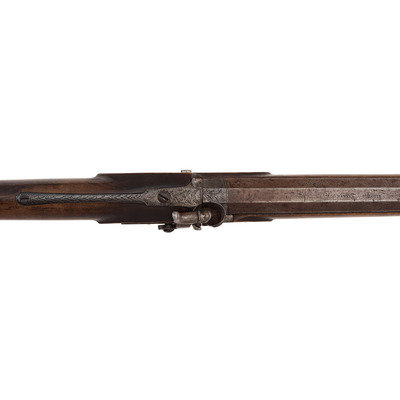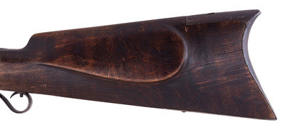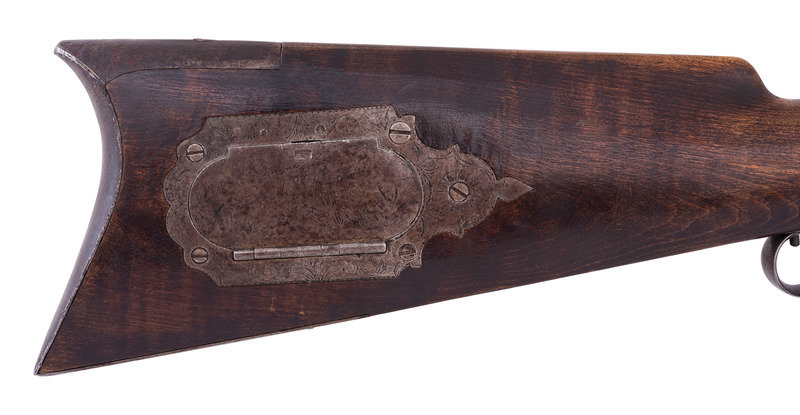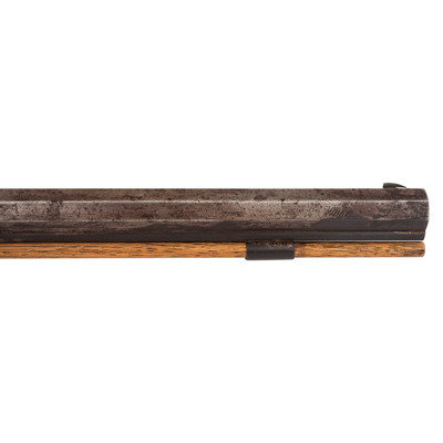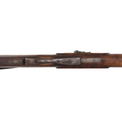 A very nice example of a rare Hawken plains rifle with an engraved iron patchbox, shortened to be a handier rifle for use in the mountains, brush or on horseback. This gun was previously sold at Bonham's on 6/28/10 as lot #401.