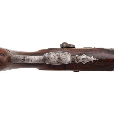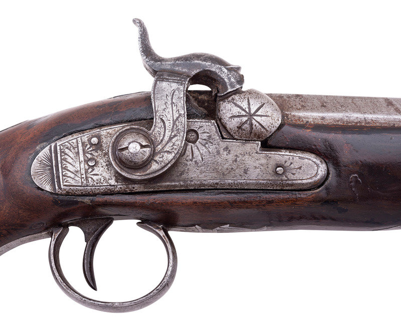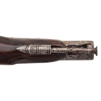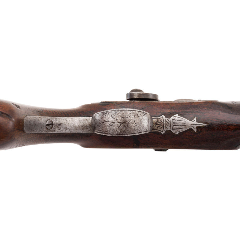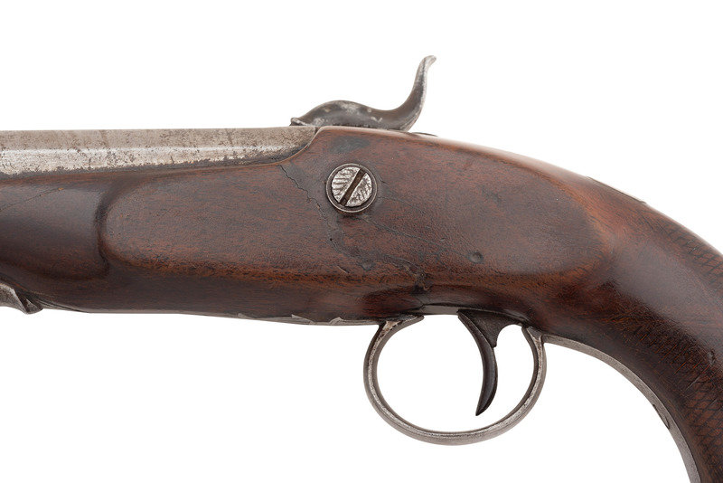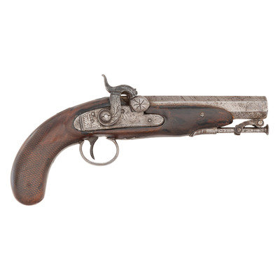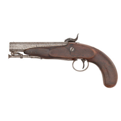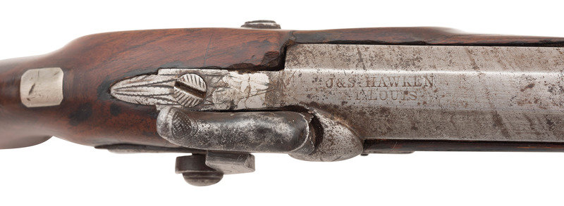 .56 caliber. 5" pinned octagonal barrel. SN: NSN. Damascus patterned barrel, iron mountings, walnut stock with checkered grip. Muzzleloading overcoat sized single shot percussion pistol with captive swivel ramrod. Top flat of barrel marked "J&S HAWKEN/ST. LOUIS". Unmarked, lightly engraved single-screw stepped percussion lock with spanner nut retained hammer. Iron furniture with lightly engraved tang, triggerguard with urn finial, and hammer. Hawken marked pistols present a true conundrum to the collector. Their rarity makes it extremely difficult to draw definitive conclusions, but it seems that the Hawkens probably did not produce any pistols, but rather retailer marked pistols from other makers. Both Belgian and English made examples of Hawken marked guns are known, as well as pistols that are likely of American origin but whose makers have not been directly identified. Unlike the Plains Rifles produced by the Hawkens, which have very specific identifiable characteristics and features, the handful of known, legitimate Hawken marked pistols are in no way similar or consistent. This pistol is of English mid-19th century styling but the absence of external English proof marks suggests it may well be a Liege product. Belgian proofs were more often applied under the barrel. Due to the pinned nature of the barrel retention and the repairs in the wood, the pins were not removed to examine the bottom of the barrel. A very rare opportunity to own a real J&S Hawken marked percussion pistol that is hard used but exceptionally scarce.