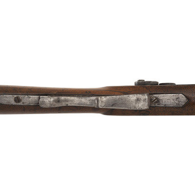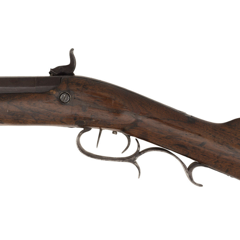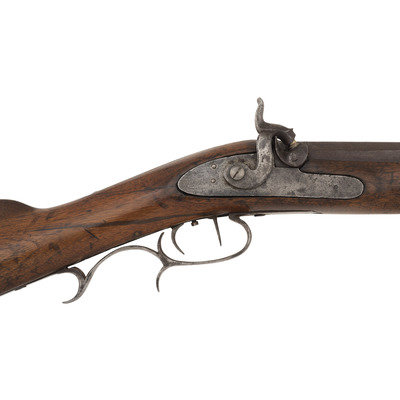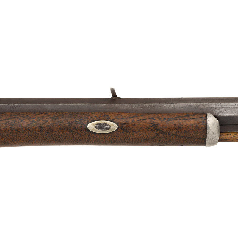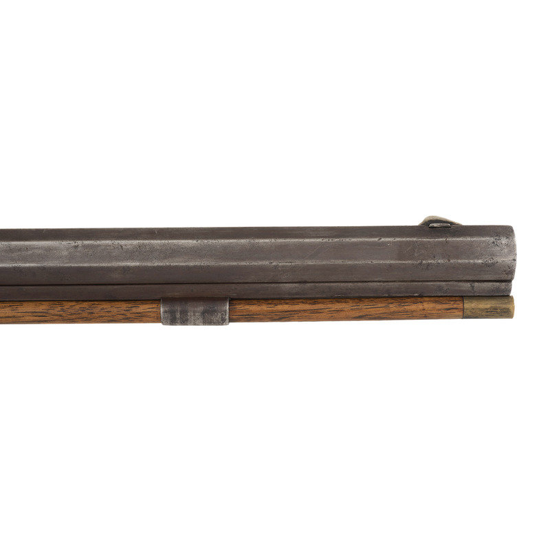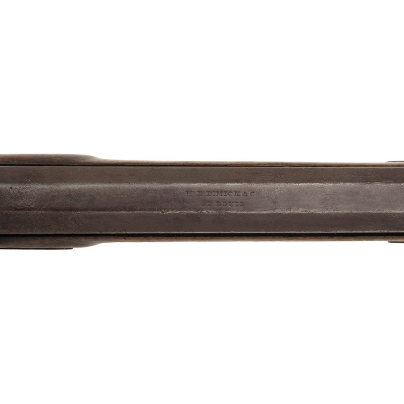 .50 caliber. 36.5" single-key octagonal barrel with under rib. SN: NSN. Browned finish, iron, German silver and pewter mountings, walnut half-stock. Plain, single screw, externally unmarked commercial percussion lock is maker marked "T GIBBONS" on the interior. Top flat of barrel marked "H.E. DIMICK & CO/ST. LOUIS". Heavy barrel measures 1.1" across the flats at the muzzle with extended double screw iron tang. Double set triggers, dovetailed buckhorn rear sight, dovetailed German silver Rocky Mountain front sight blade with steel base. Extended double finger spur triggerguard, steel buttplate, oval German silver escutcheon at barrel key, pewter forend cap. Brass tipped wooden ramrod secured by two plain steel pipes.